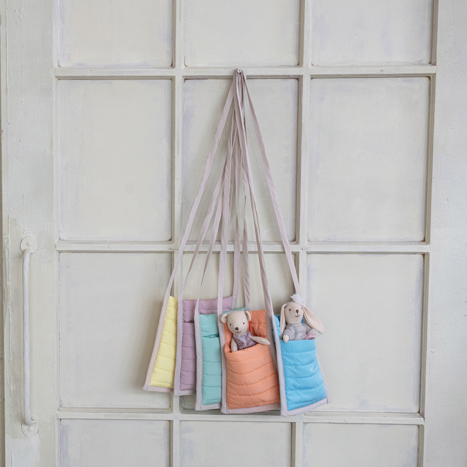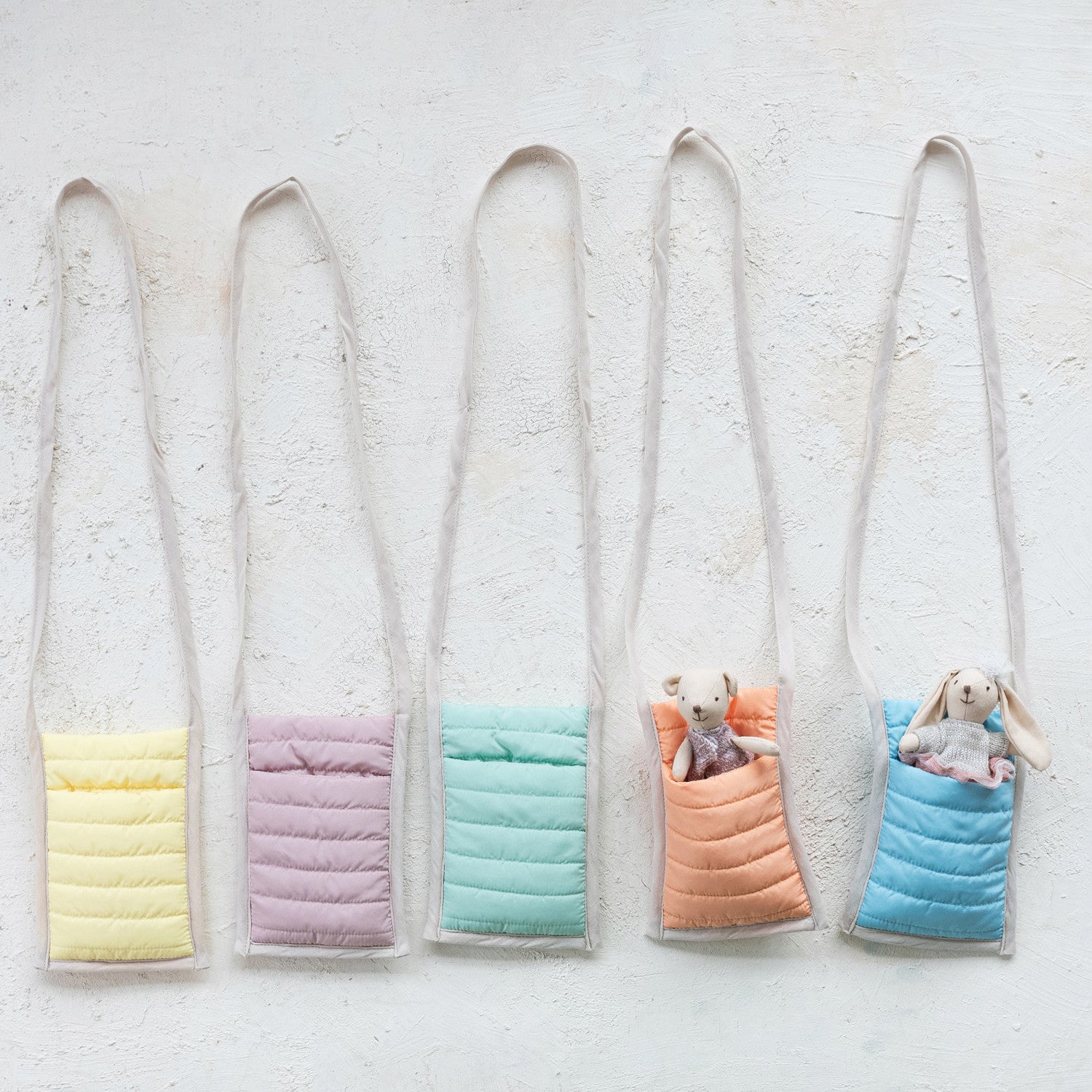A cozy carry all for their favorite little friends! These puffy crossbody toy holders are designed to snugly tuck in plush animals or dolls, so your little one can take their companions on every adventure. Made with soft quilted fabric and a long cotton strap, they're lightweight, hands-free, and full of charm.