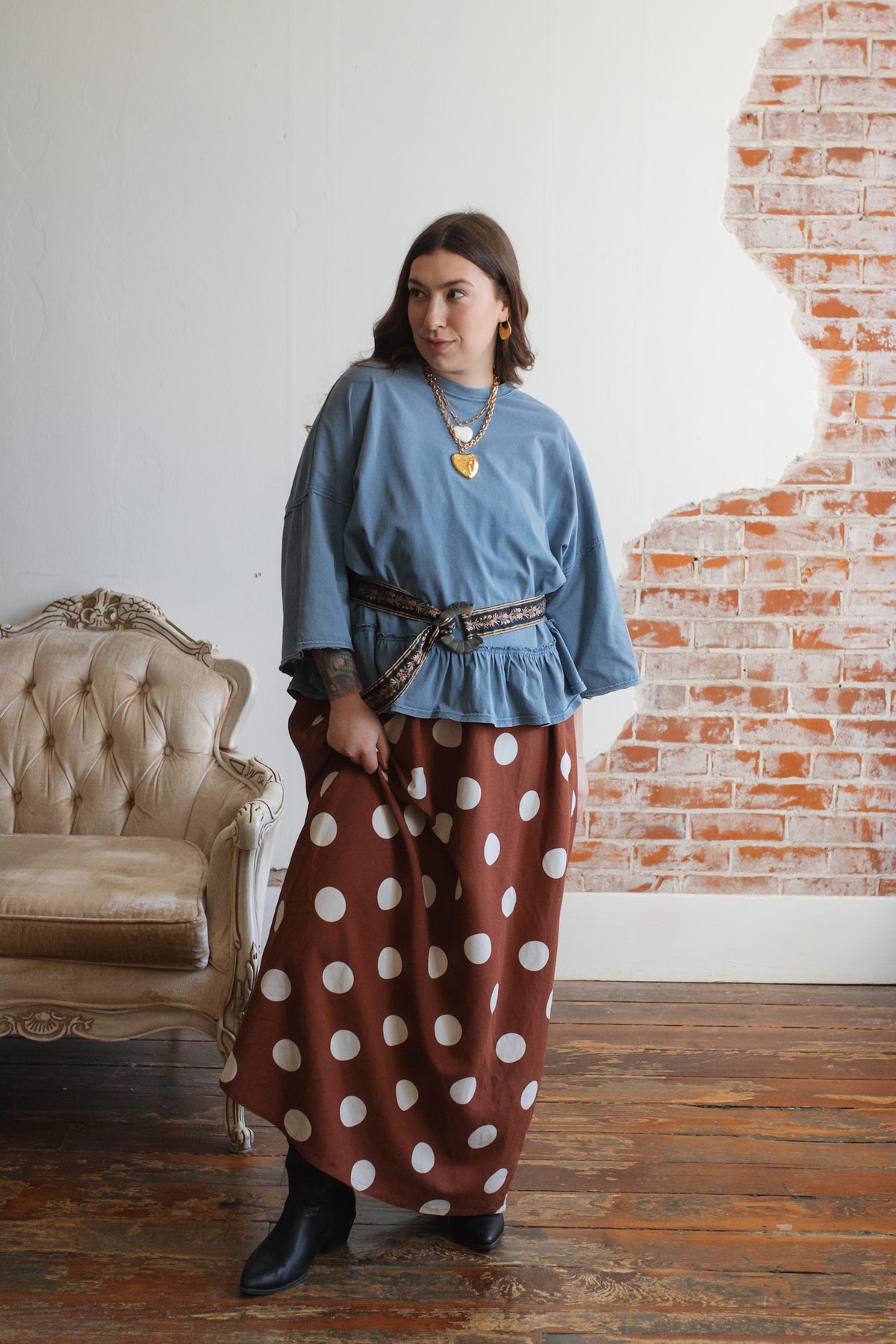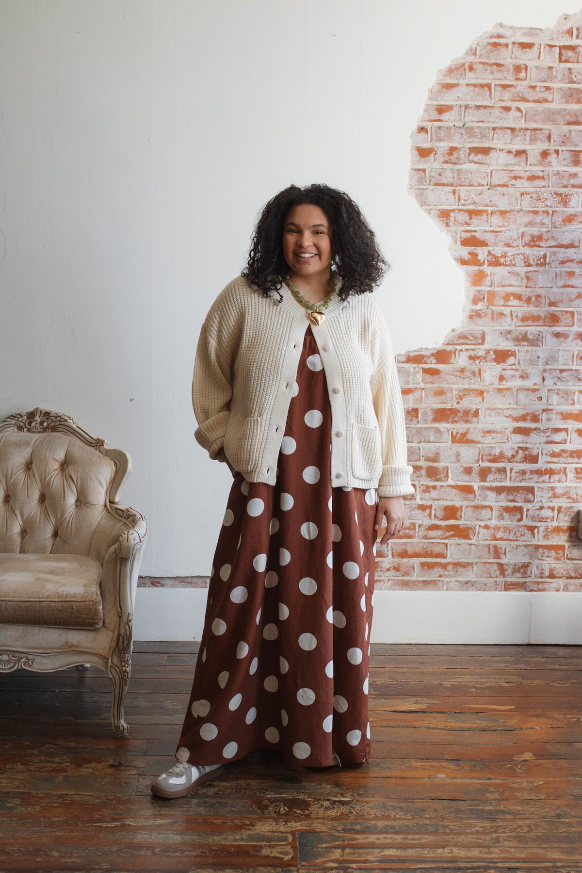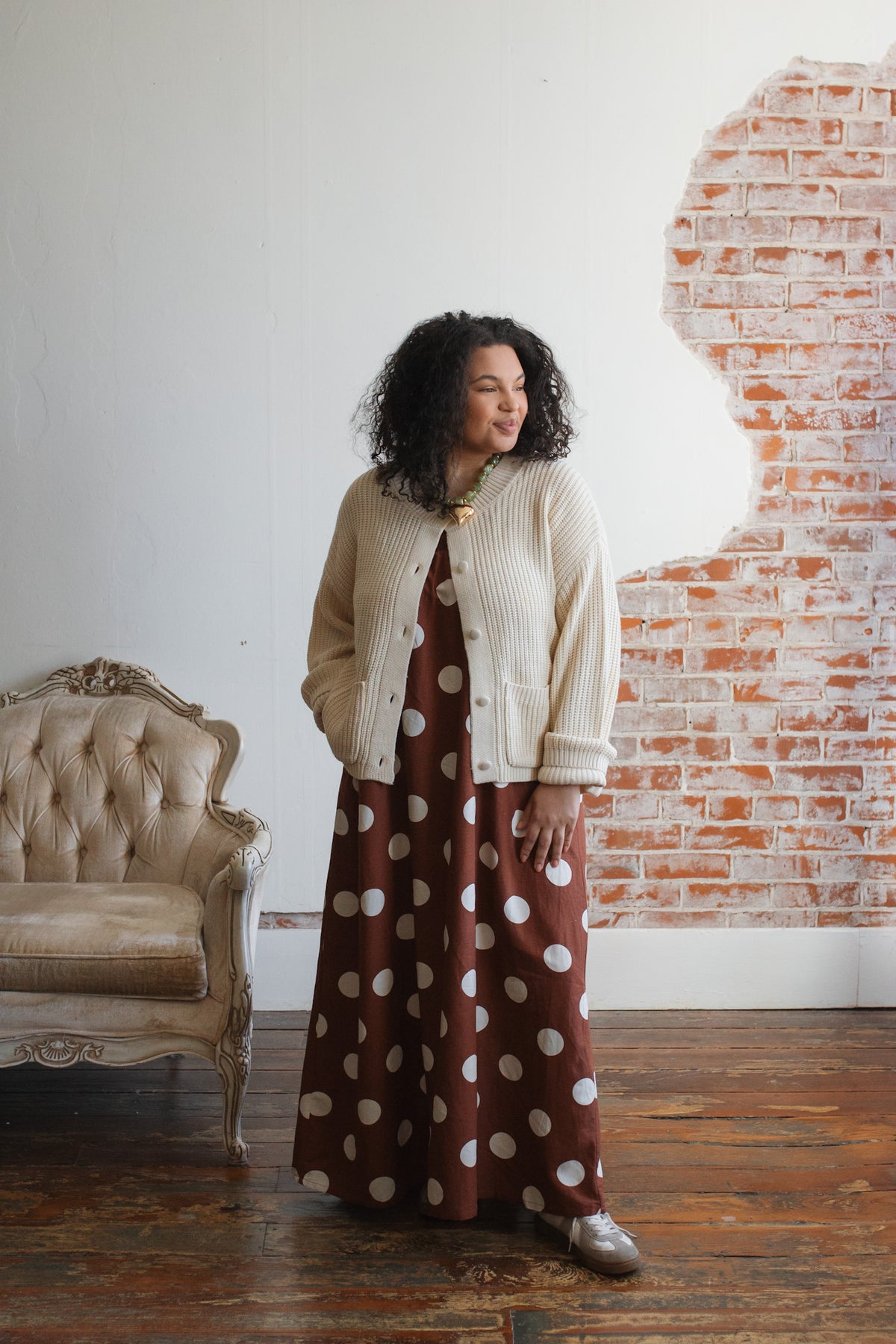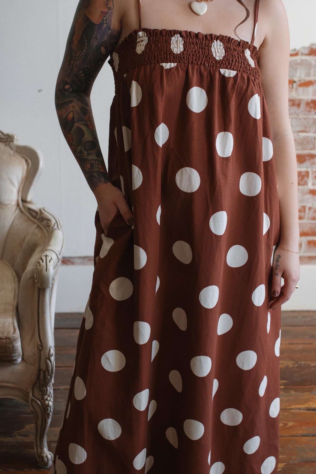 • 70% Rayon, 30% Linen in a rich brown base with oversized ivory polka dots