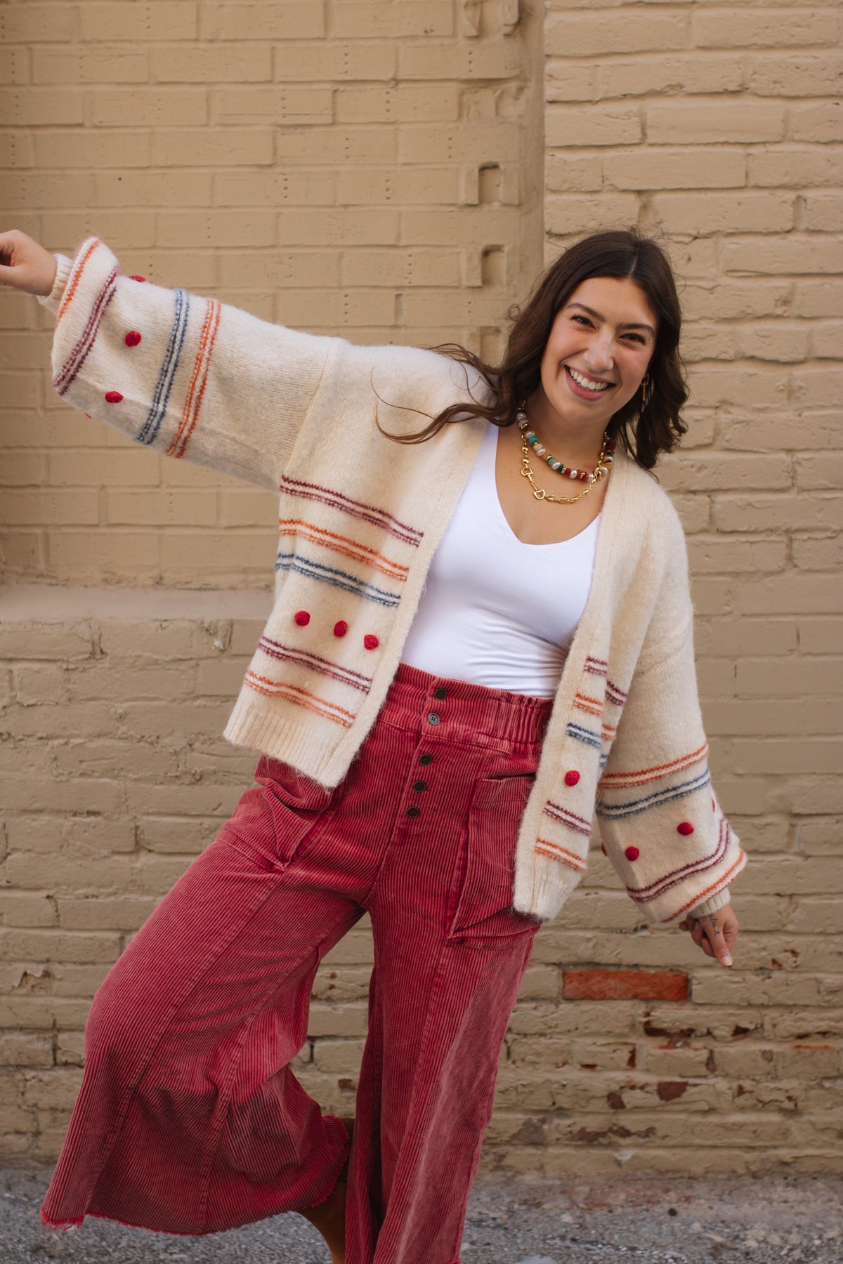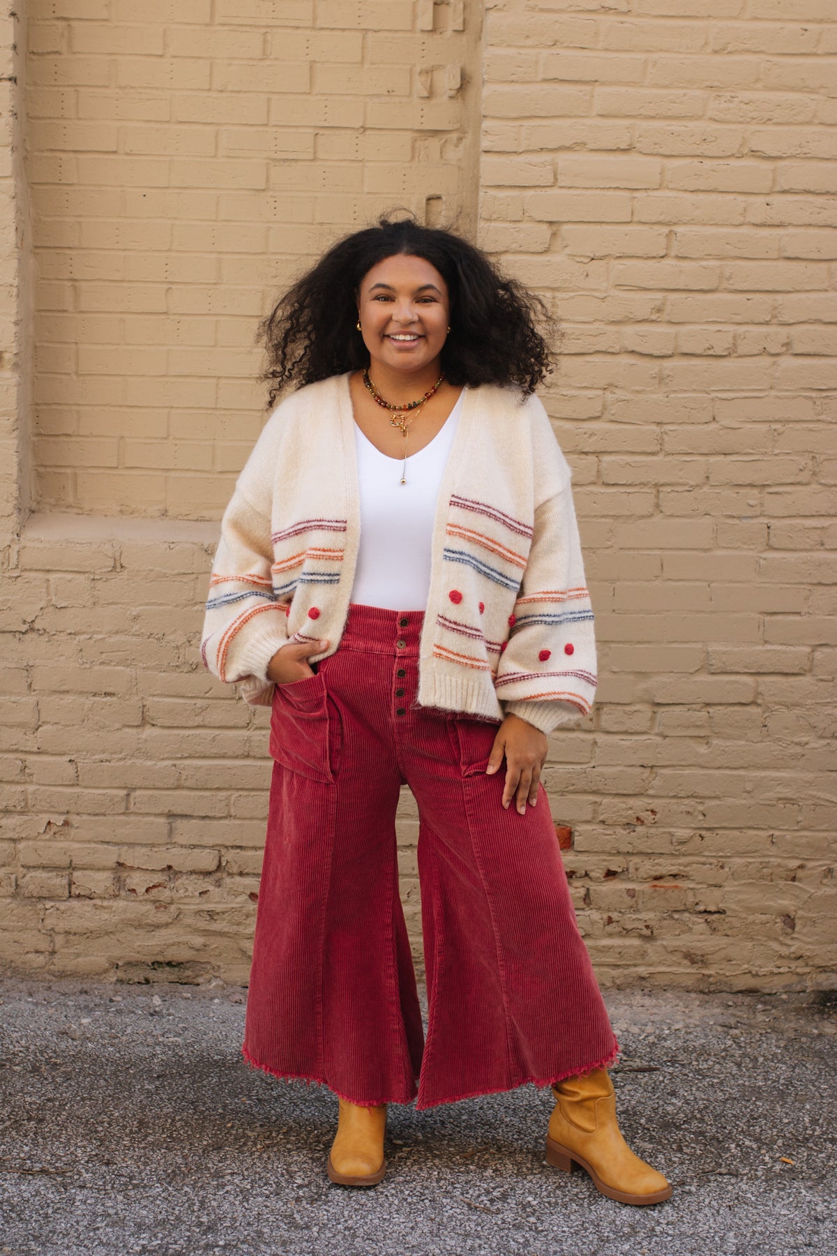 Make a bold seasonal statement in the Kara Corduroy Wide Leg Pants. Crafted from soft, mineral-washed corduroy in a festive cranberry hue, these wide leg crops bring texture and edge to your holiday wardrobe. The high rise, asymmetrical frayed hem, and oversized patch pockets add just the right amount of drama for cozy dinners or gift-giving get-togethers.