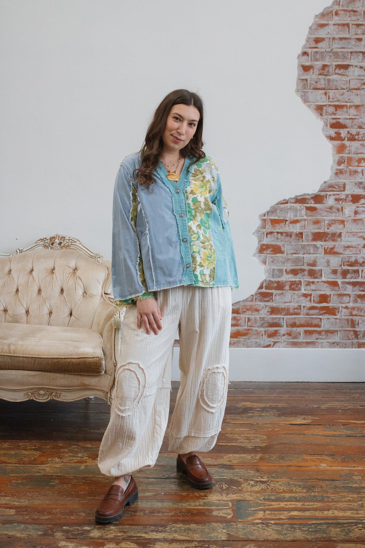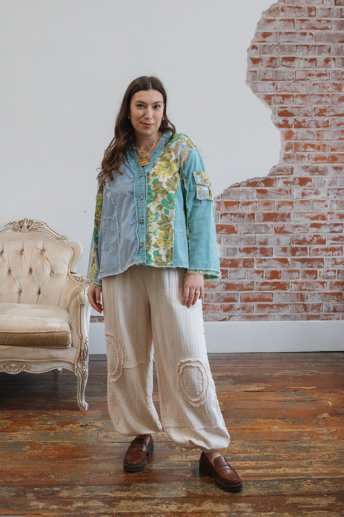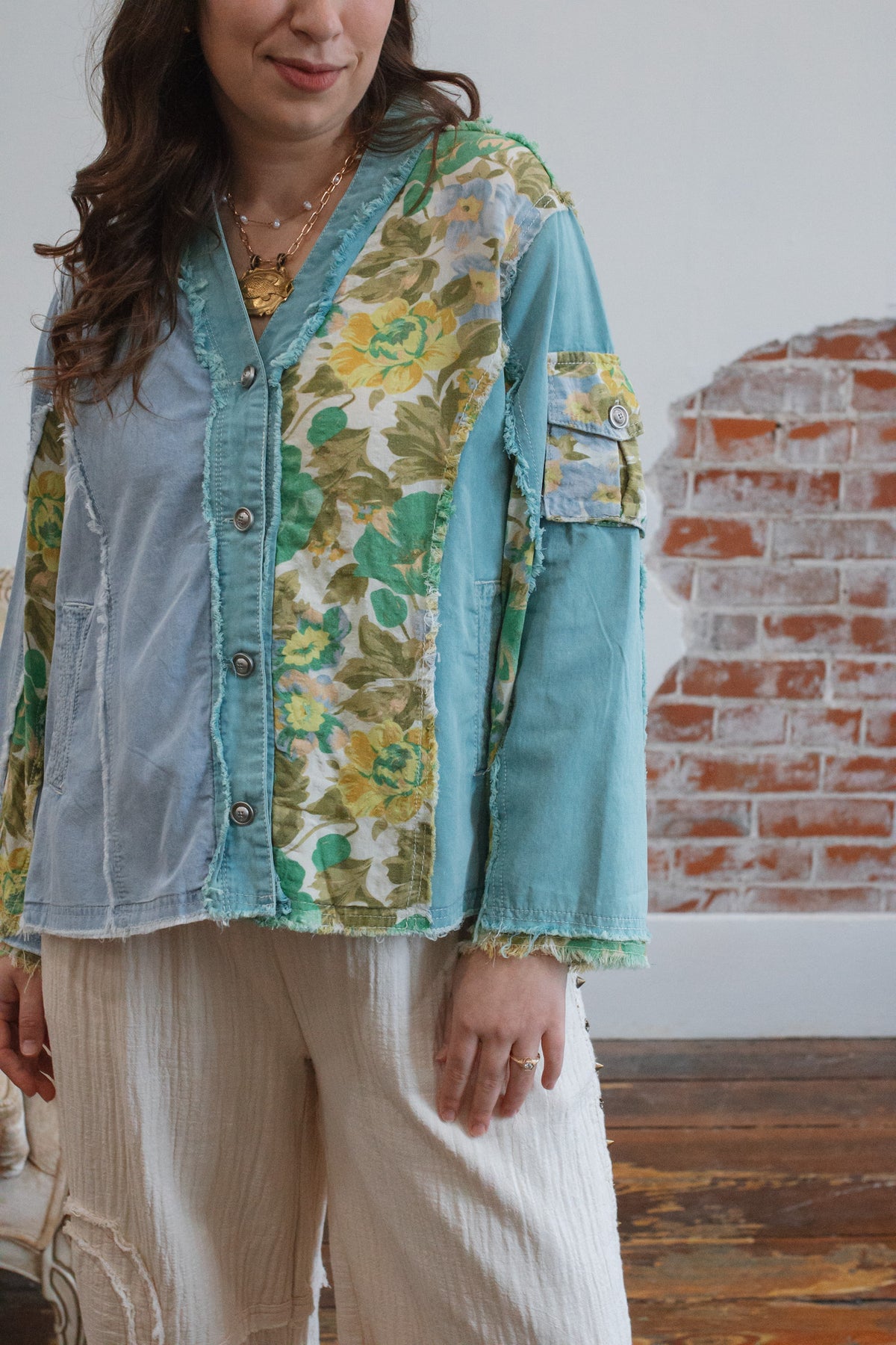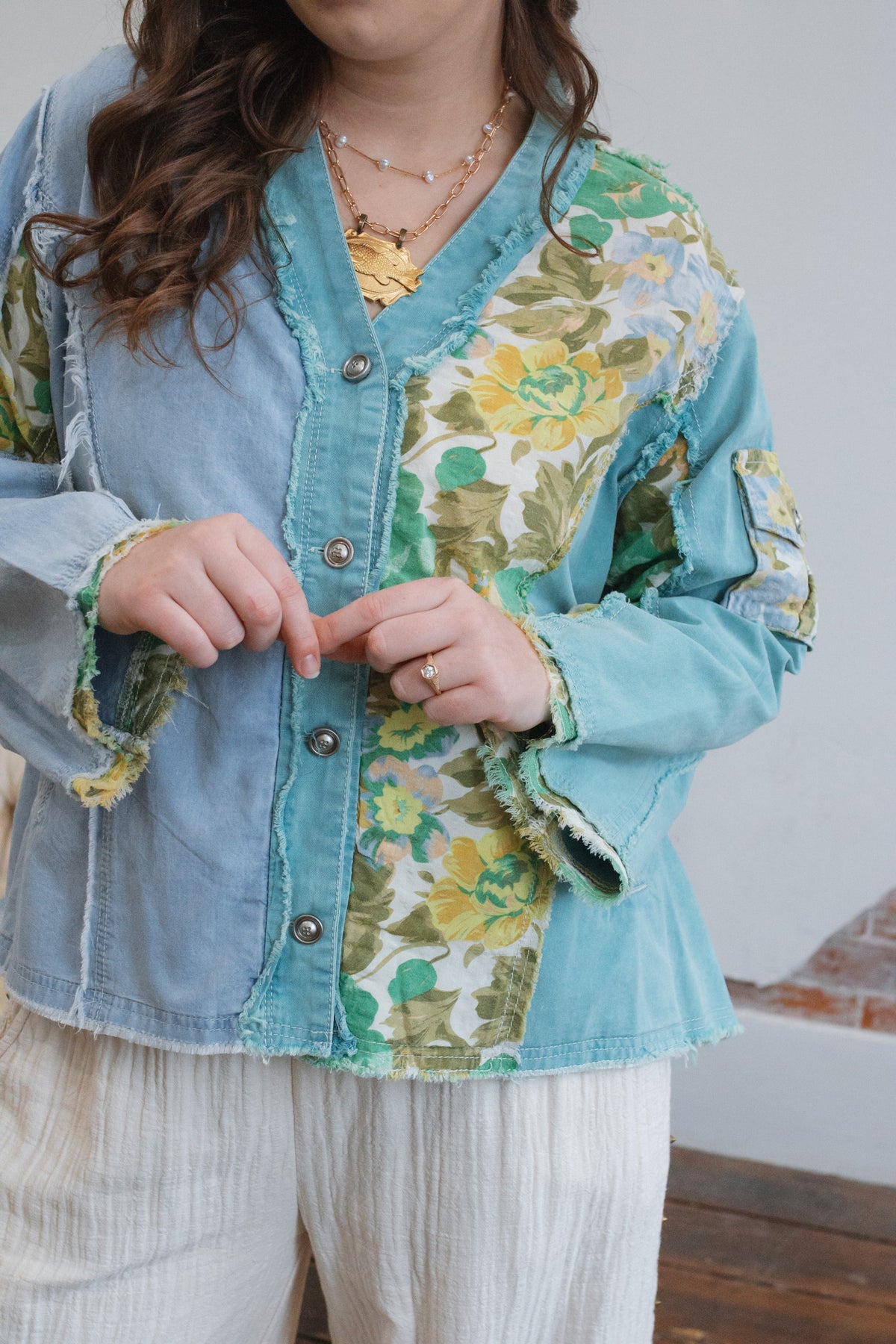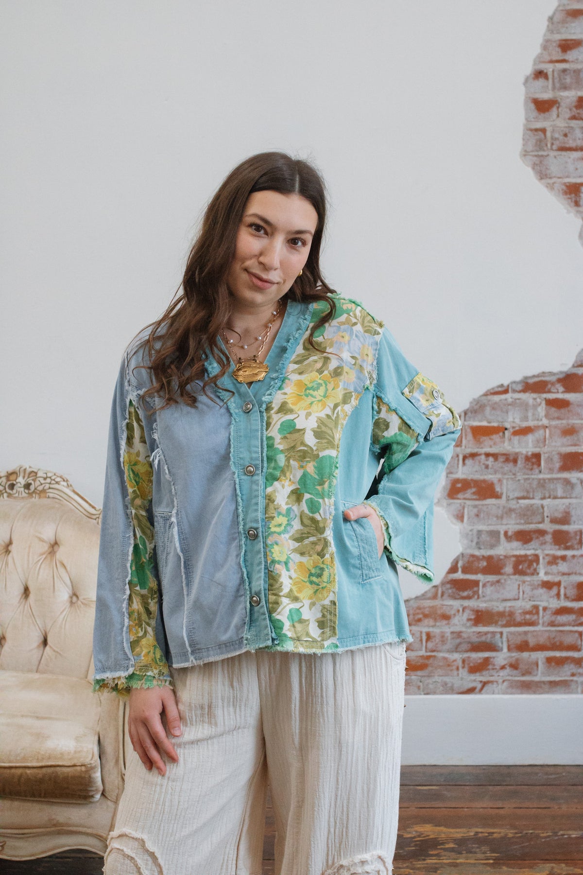Craving a lightweight jacket that feels like a work of art? The Laney Patchwork Floral Jacket blends vintage charm with a modern, free-spirited edge. Its soft cotton construction features a collage of florals, faded blues, and textured stitchwork that looks hand-assembled in the best way. Finished with raw hems, functional buttons, and roomy pockets, it’s a laid-back layer that adds instant personality to even the simplest outfit.