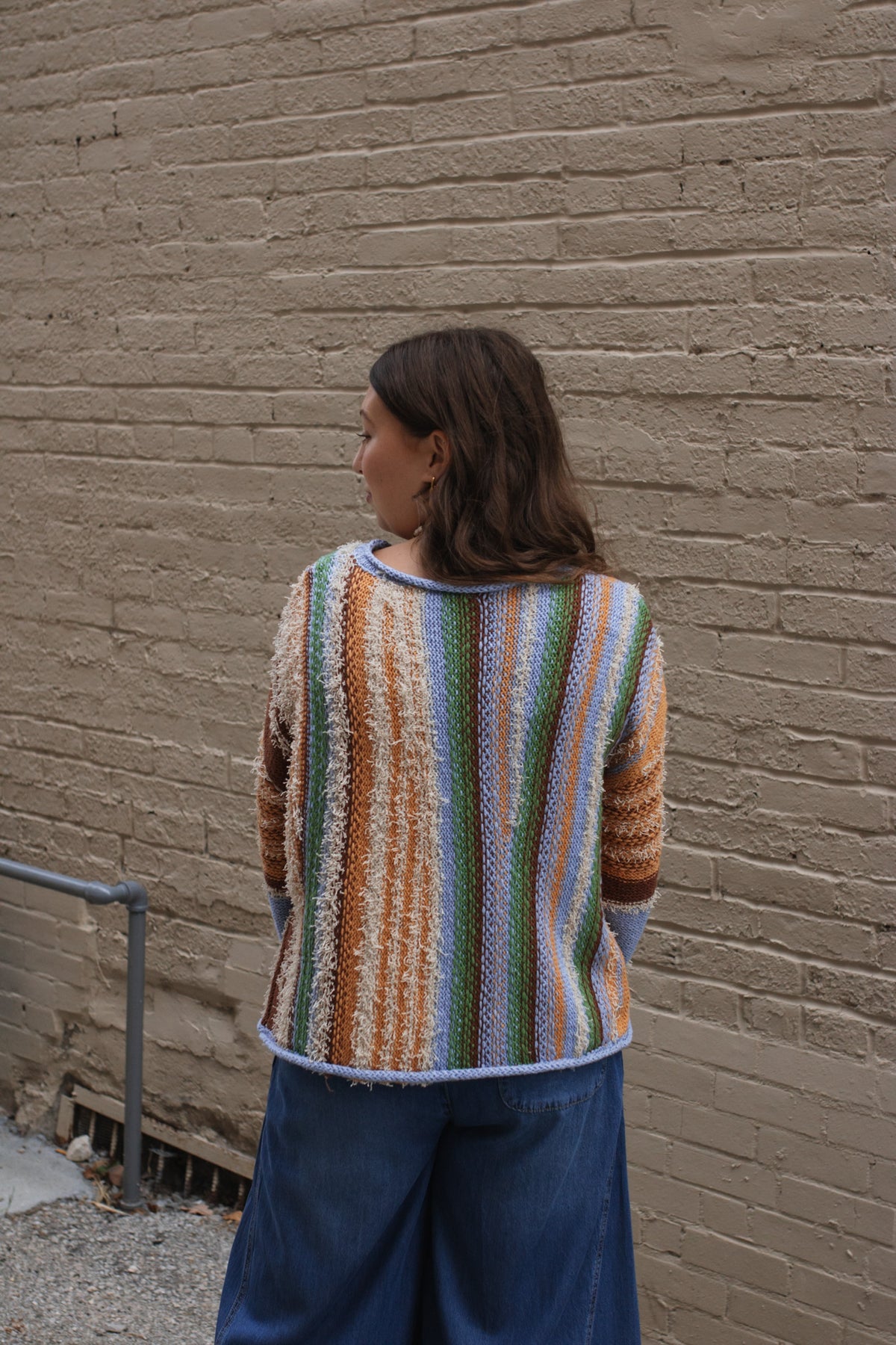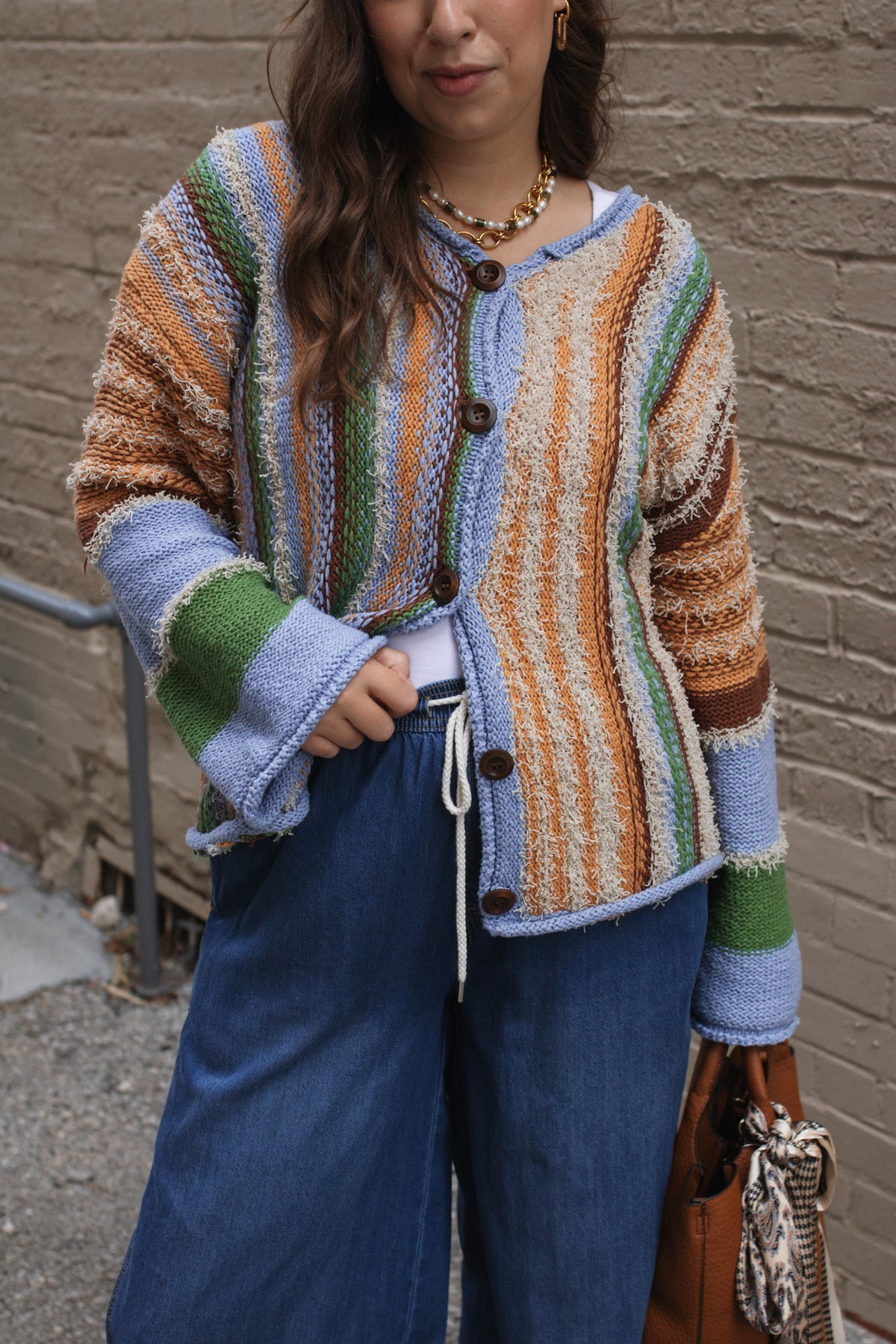 Looking for a cardigan that feels playful, versatile, and endlessly cozy? The Dala Striped Textured Knit Sweater brings together earthy, boho-inspired stripes with a relaxed fit and soft texture. With its button front and slightly oversized silhouette, this piece is easy to style layered over a tee, slipped off the shoulder, or worn on its own for everyday comfort.