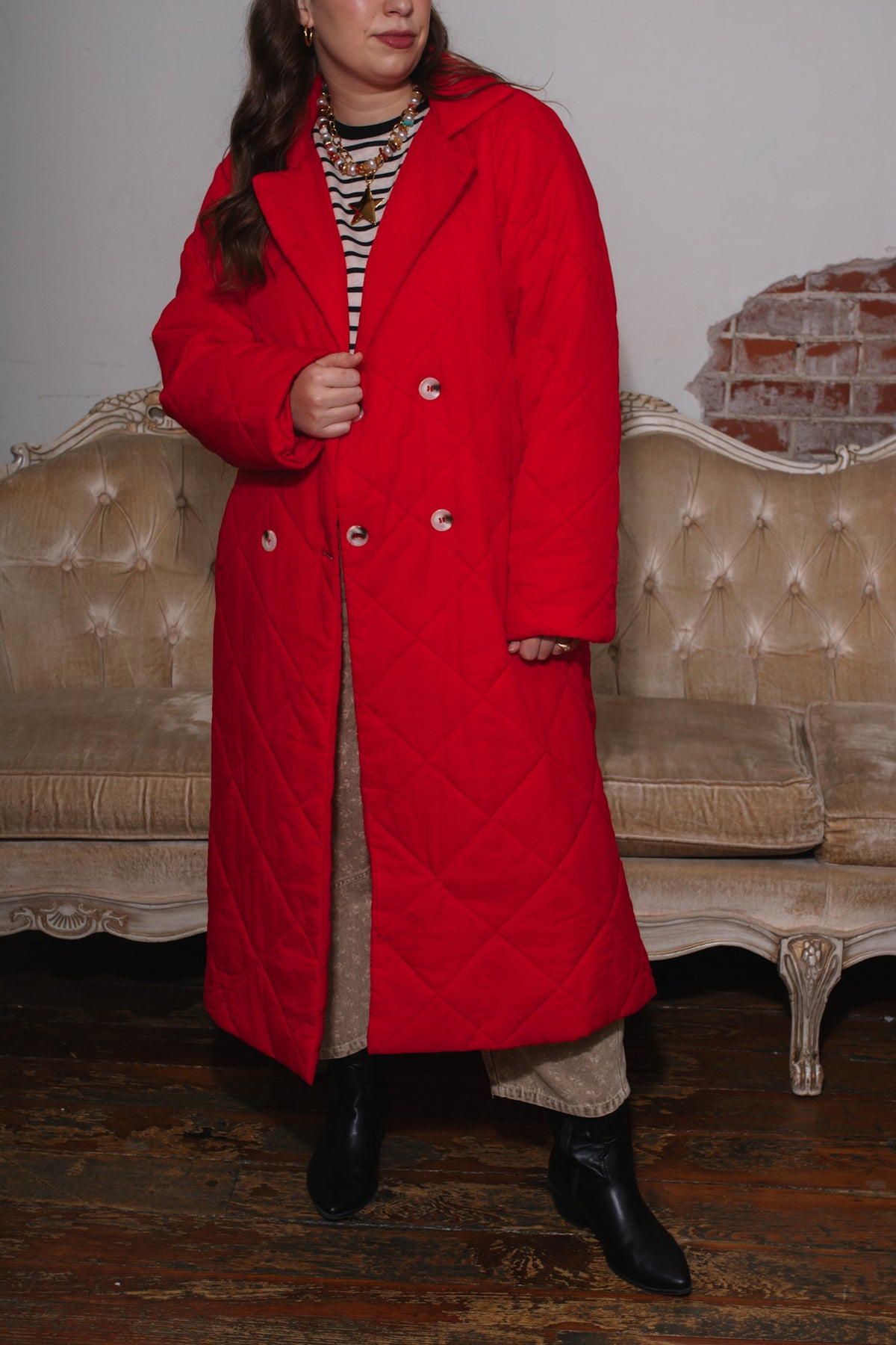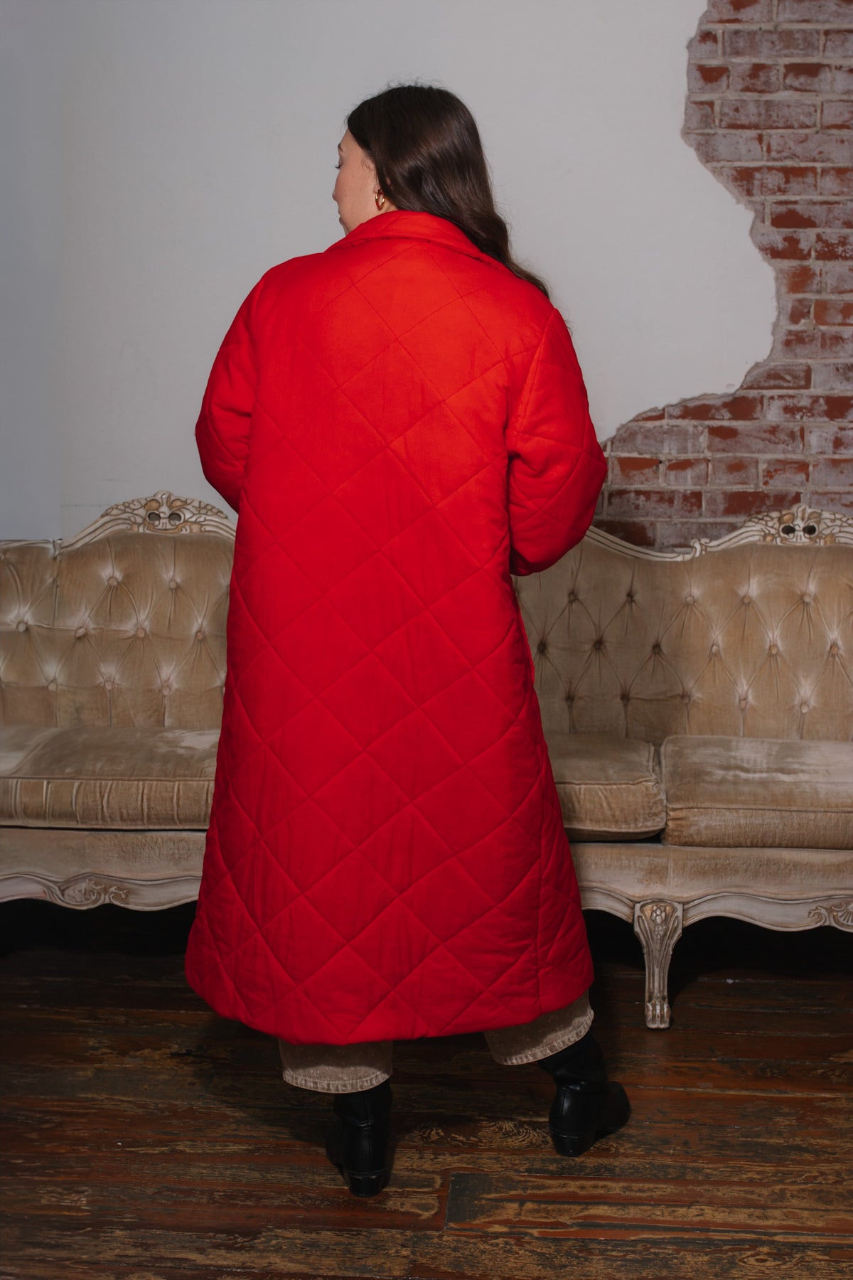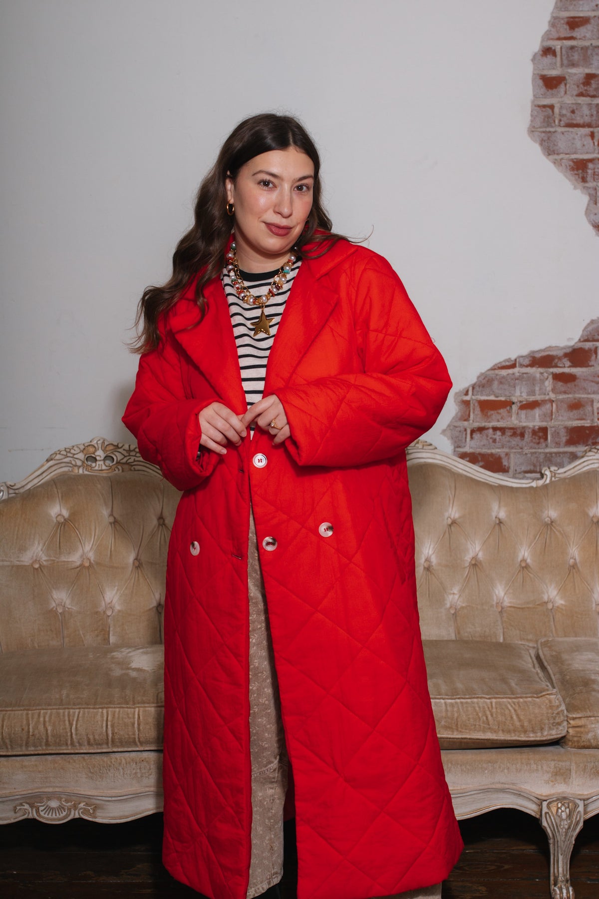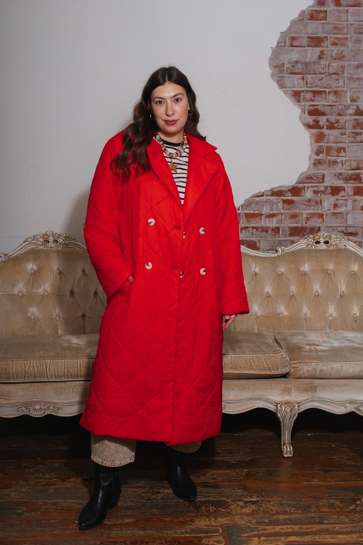 Looking for a coat that turns every sidewalk into a runway? The Caroline Long Quilted Coat is your bold pop of color in a timeless silhouette. With its vibrant red hue, oversized fit, and pillowy warmth, this coat does more than keep you cozy. It makes an entrance. Effortlessly layerable and fully lined, it's the outerwear piece you'll reach for when comfort and standout style are both non-negotiable.