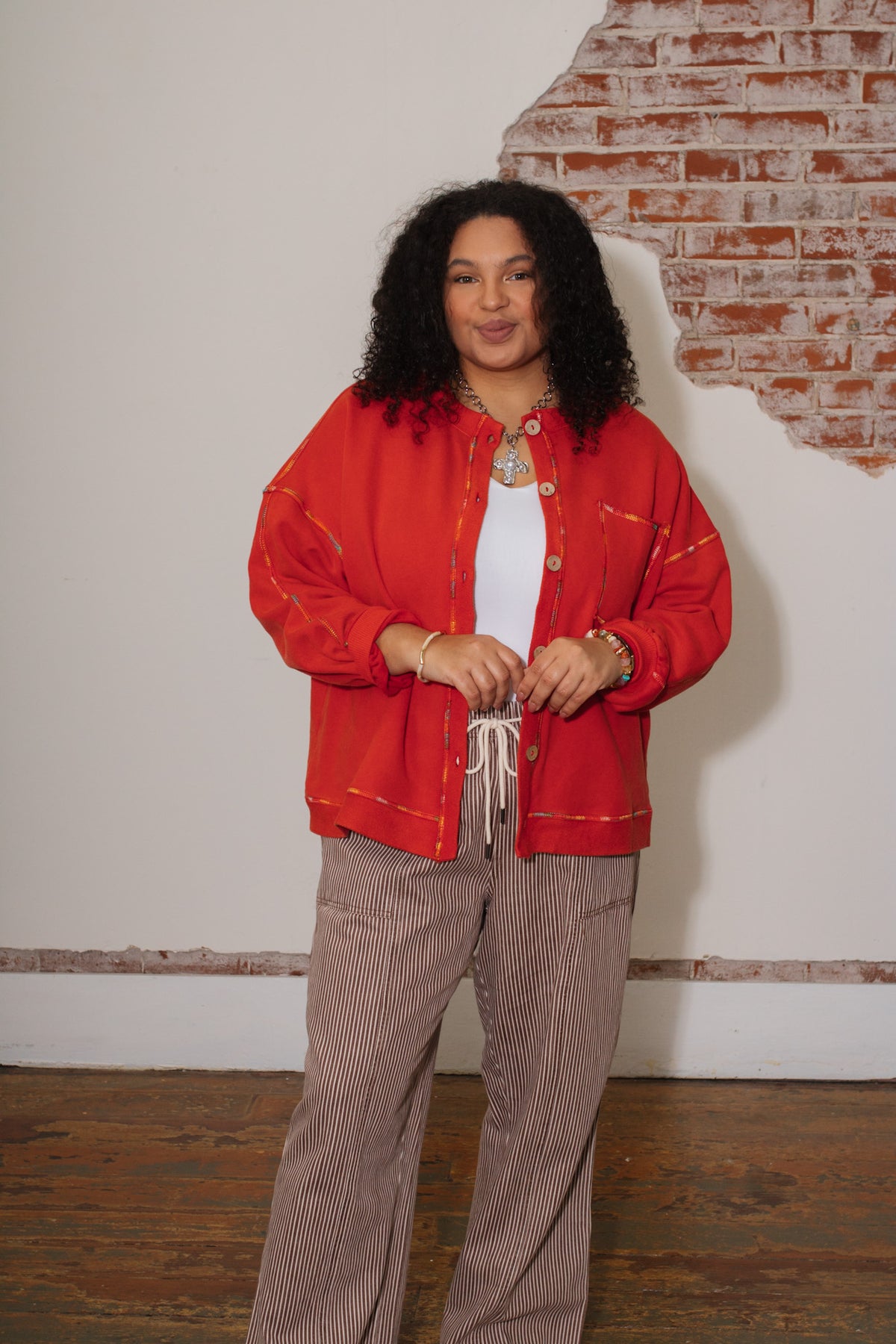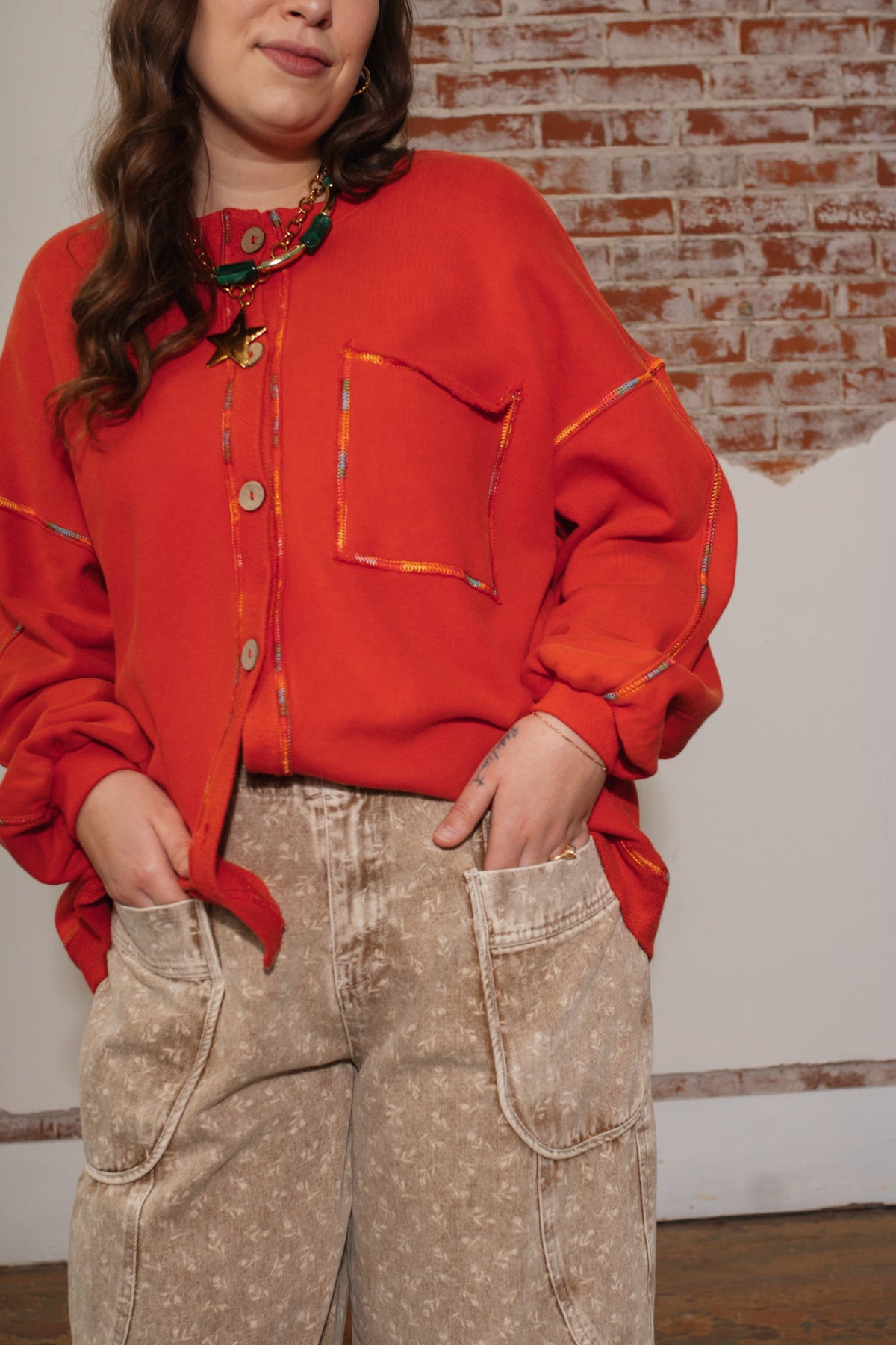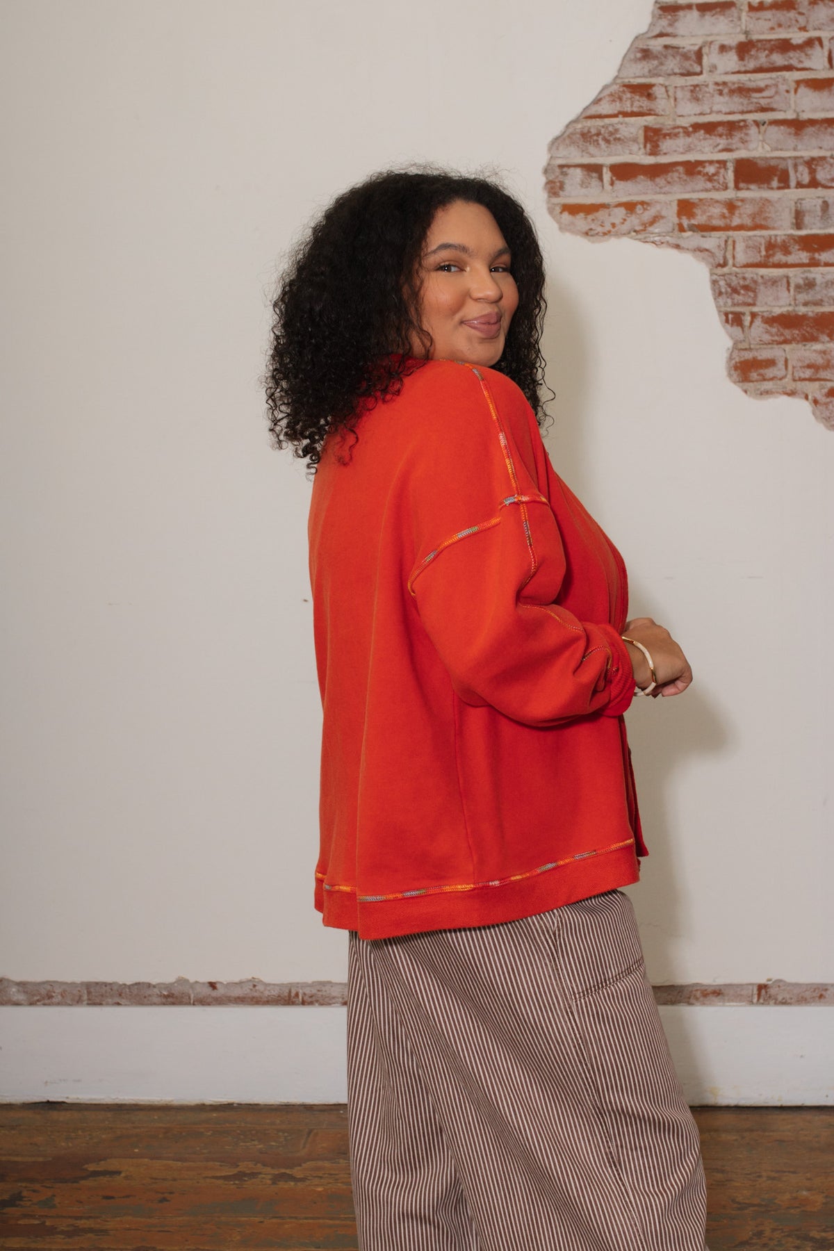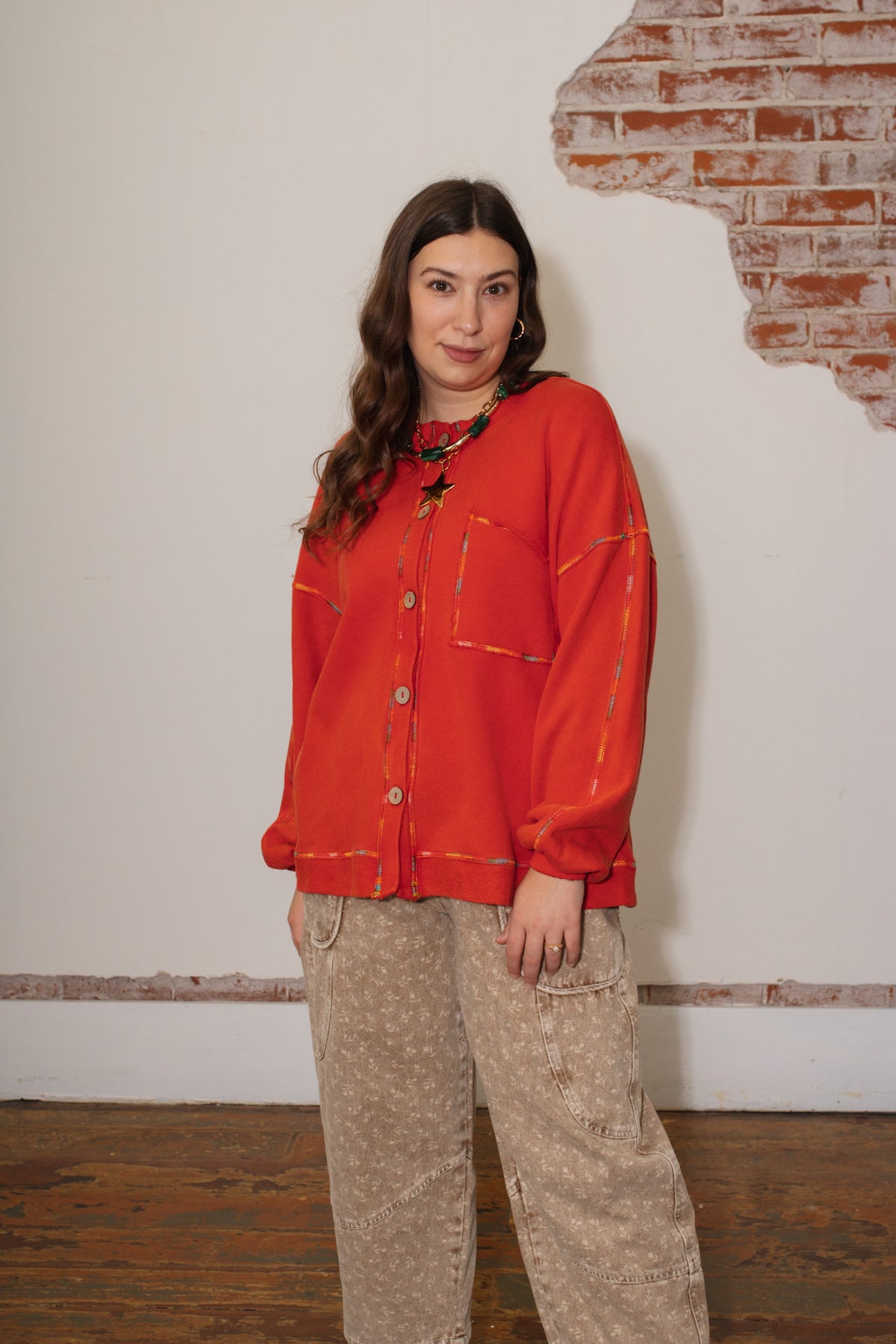 Looking for an everyday layer that’s relaxed, cheerful, and just a little unexpected? The Evie Oversized Button Up Crewneck adds a joyful twist to your basics with playful rainbow stitching and wooden buttons. Made from soft, substantial cotton, it wears like your favorite sweatshirt but brings the charm of a chore coat. Wear it open or closed — either way, it brings warmth and personality.