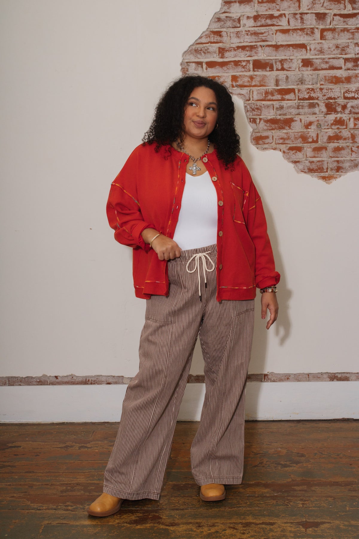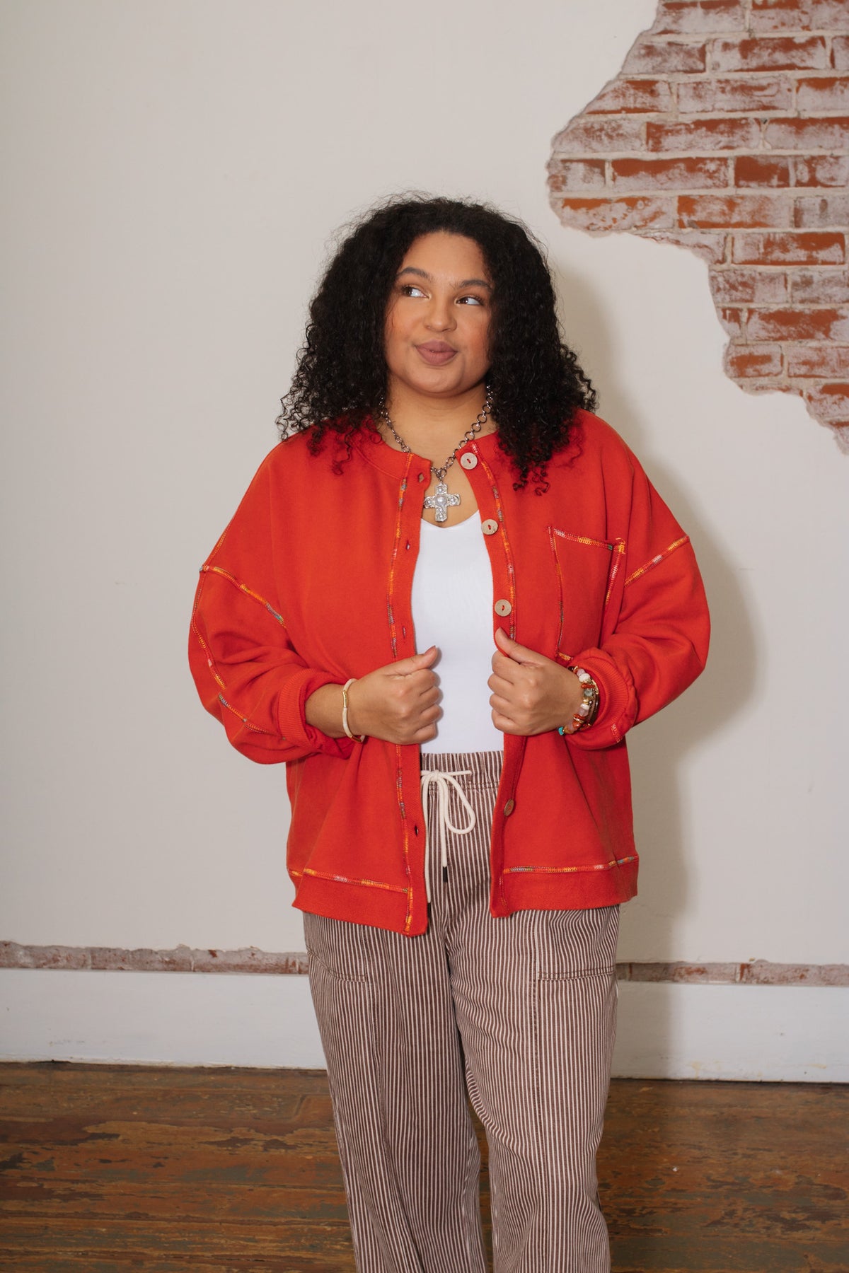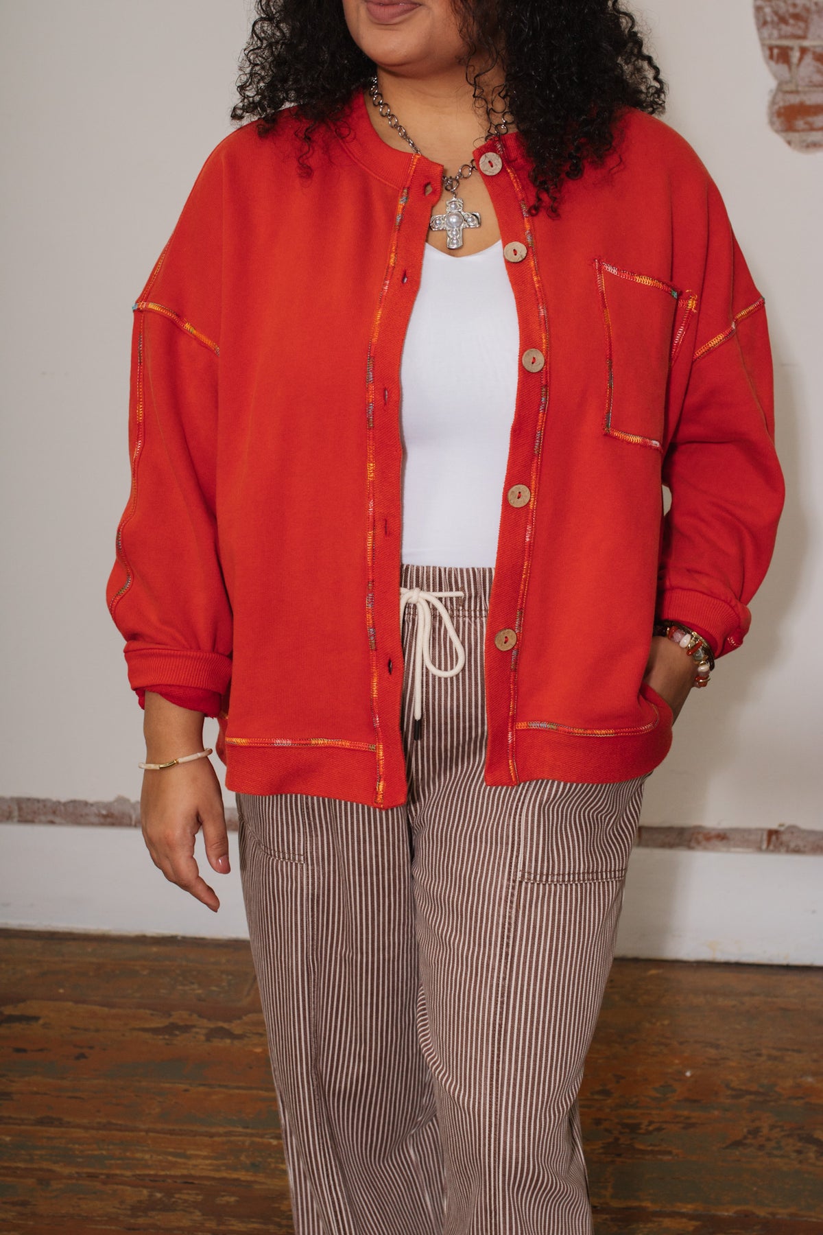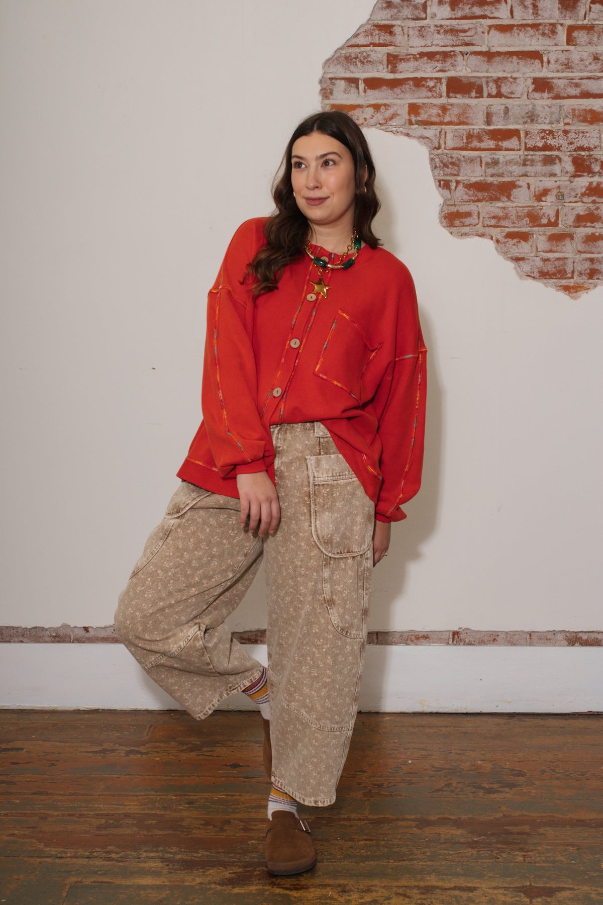Looking for an everyday layer that’s relaxed, cheerful, and just a little unexpected? The Evie Oversized Button Up Crewneck adds a joyful twist to your basics with playful rainbow stitching and wooden buttons. Made from soft, substantial cotton, it wears like your favorite sweatshirt but brings the charm of a chore coat. Wear it open or closed — either way, it brings warmth and personality.