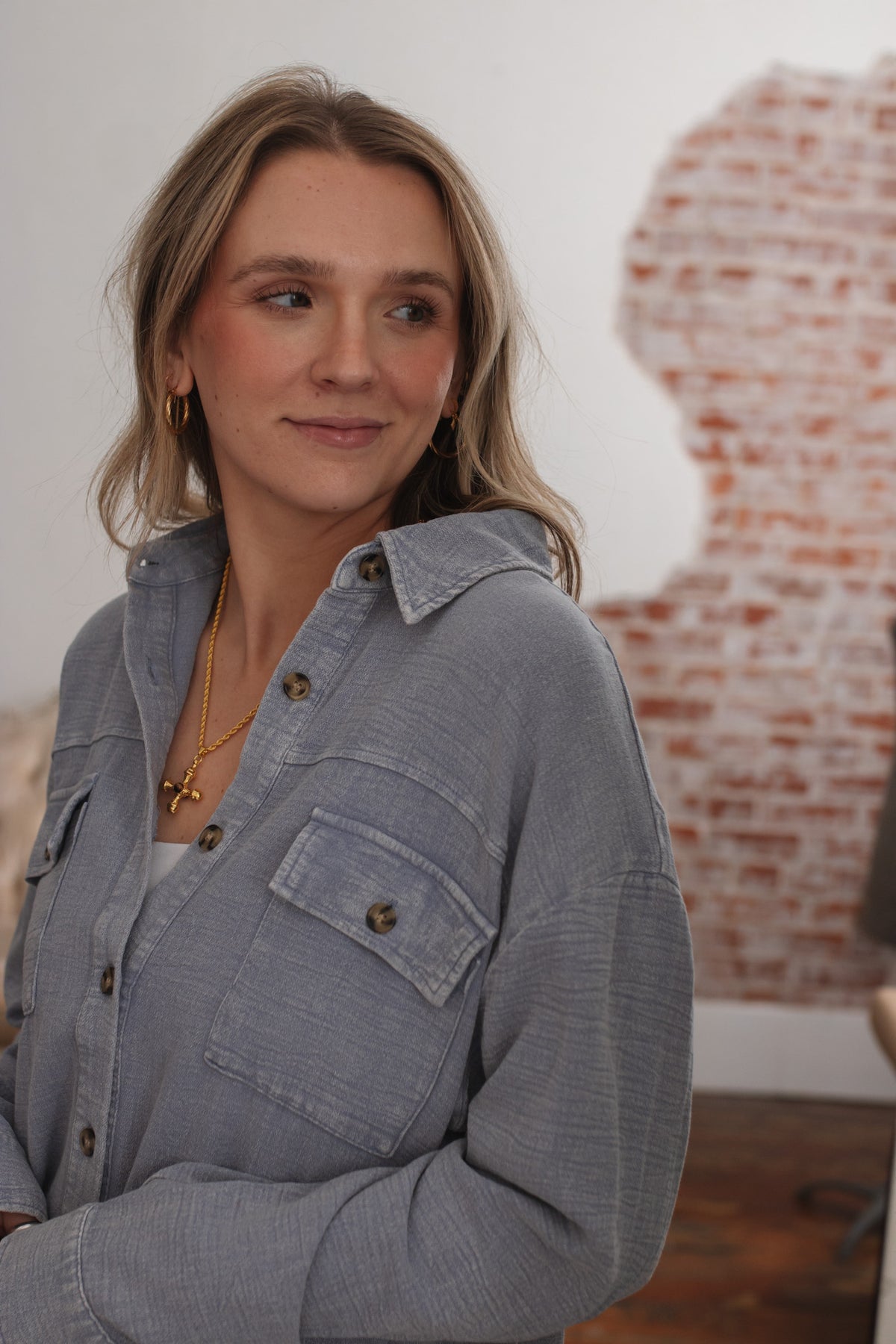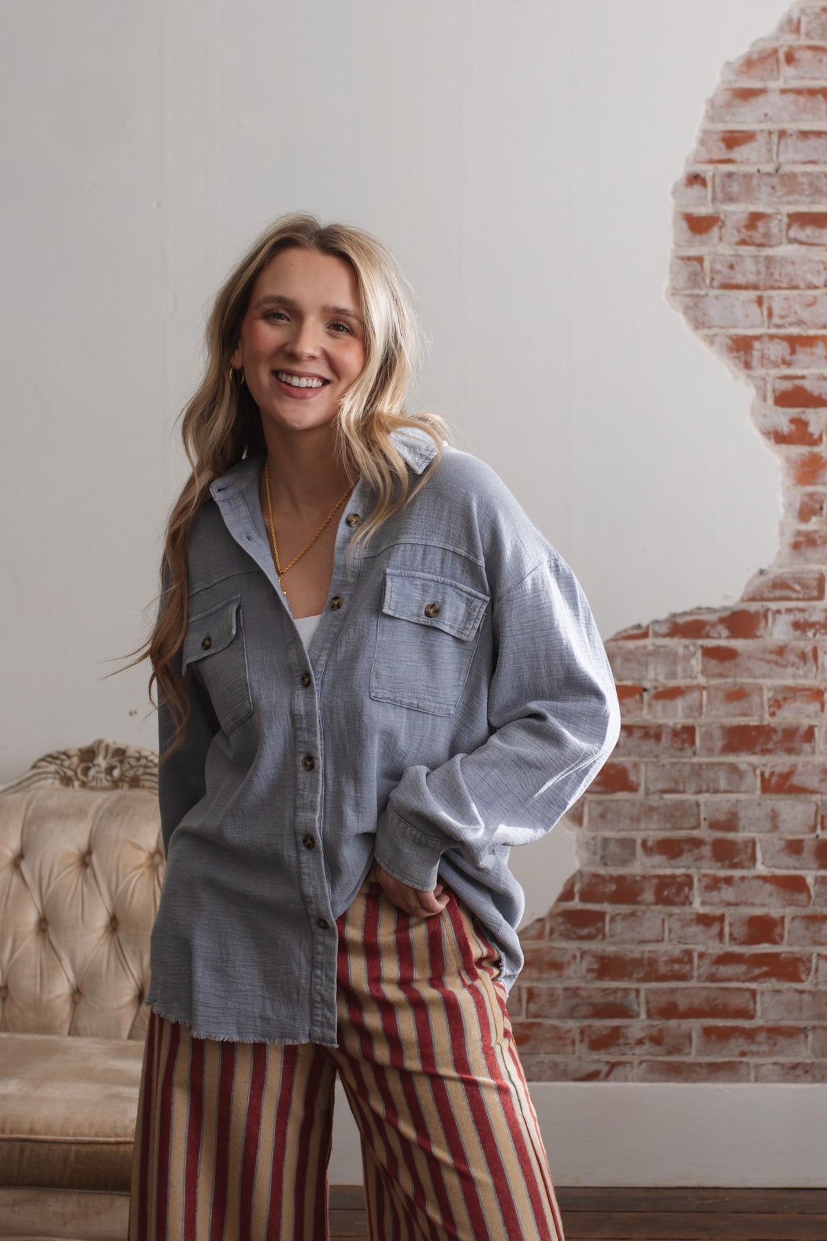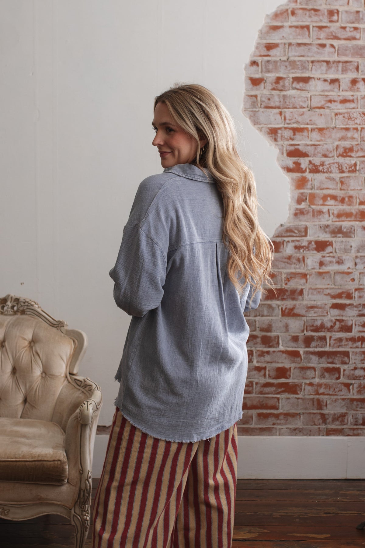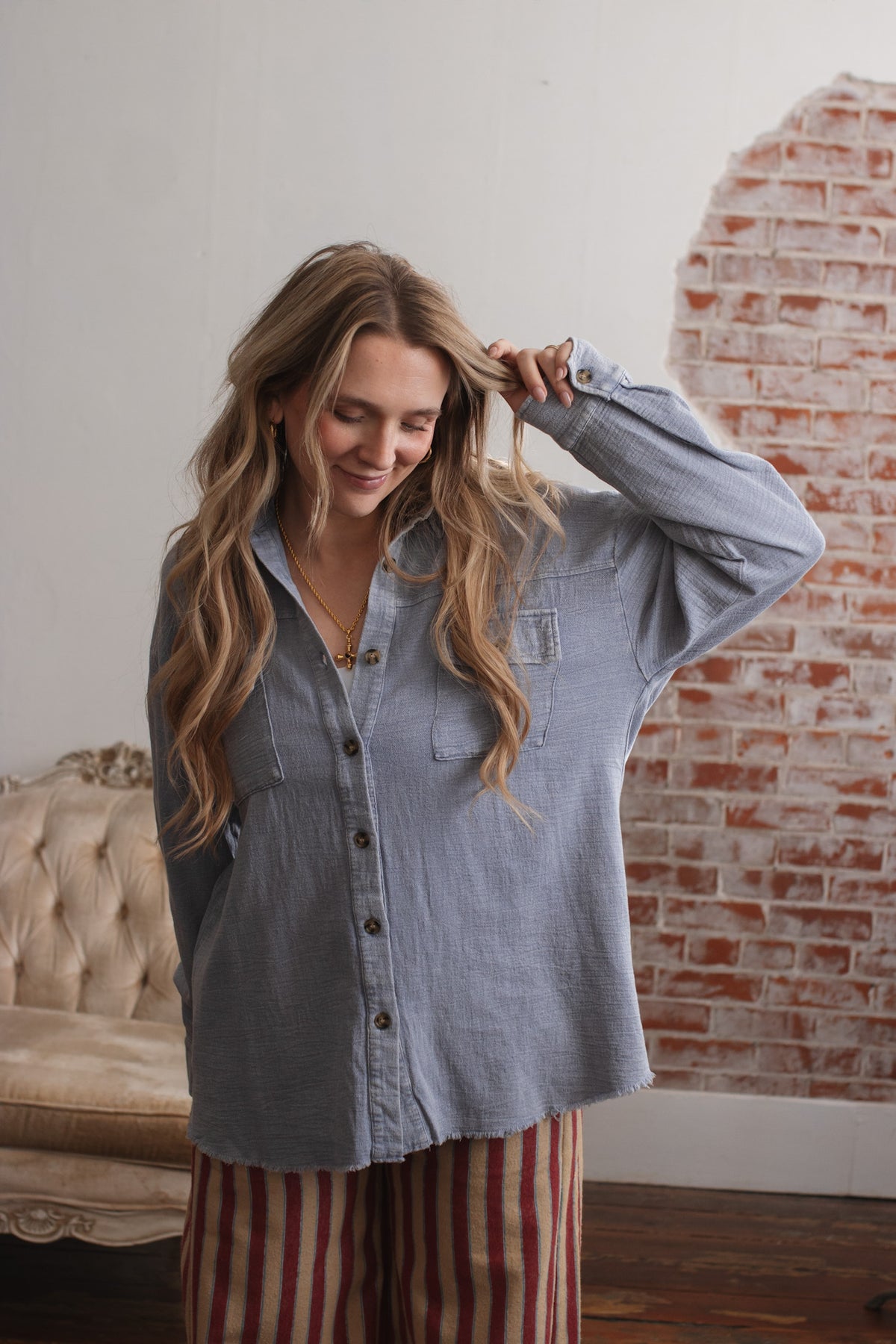 Looking for a lightweight button-down with a little extra texture? The Steele Shirt is that go-to layer you’ll reach for on cool mornings, casual workdays, or just when you want something easy and relaxed. Made from breathable cotton with a softly crinkled feel, it drapes beautifully while keeping things laid-back. The oversized fit adds a touch of borrowed-from-him charm that still feels effortlessly feminine.