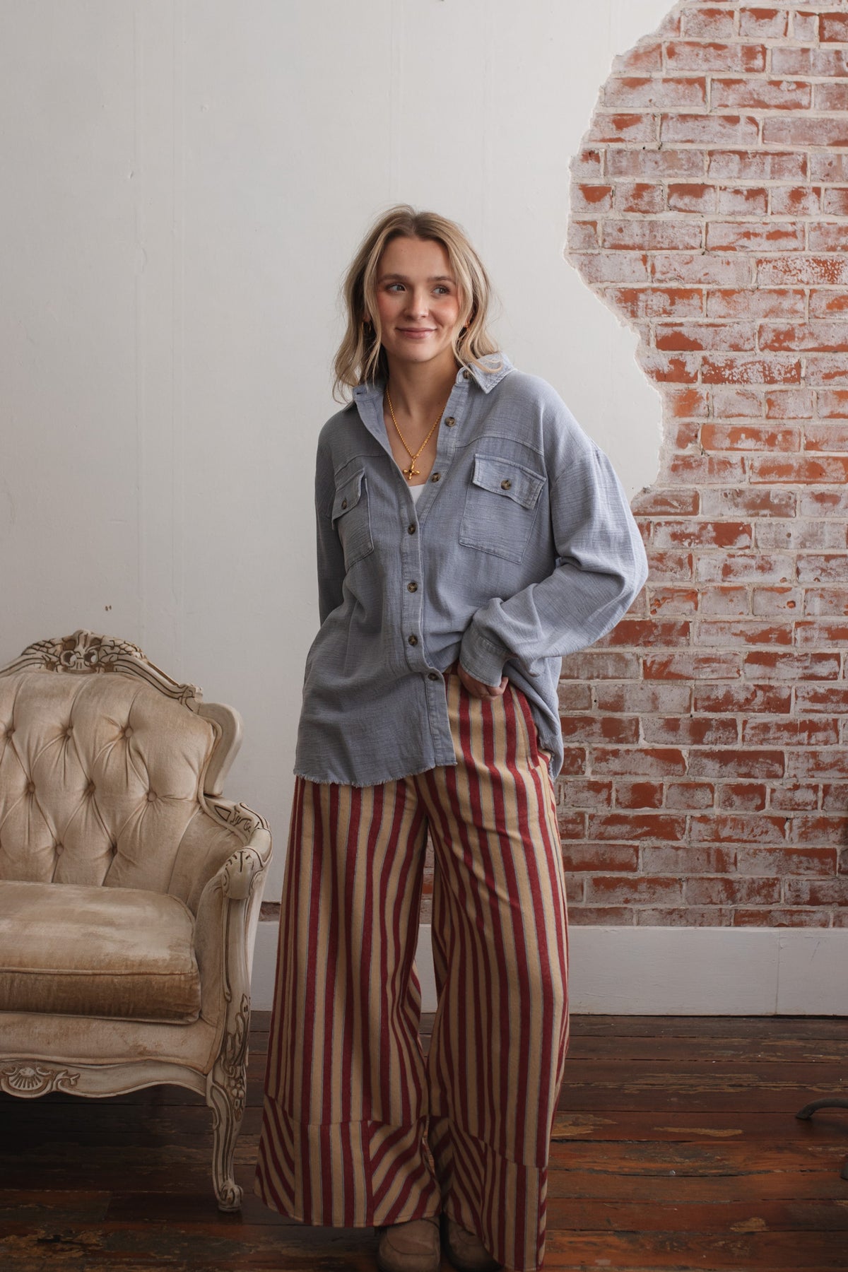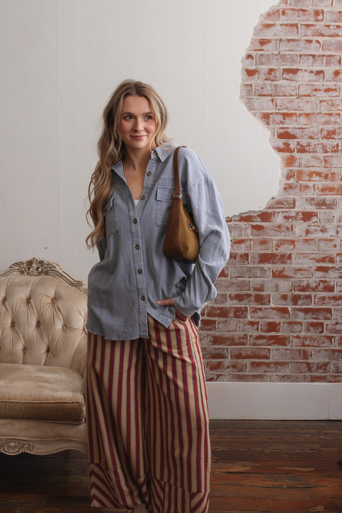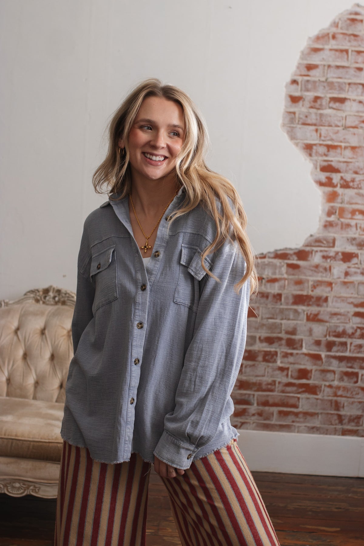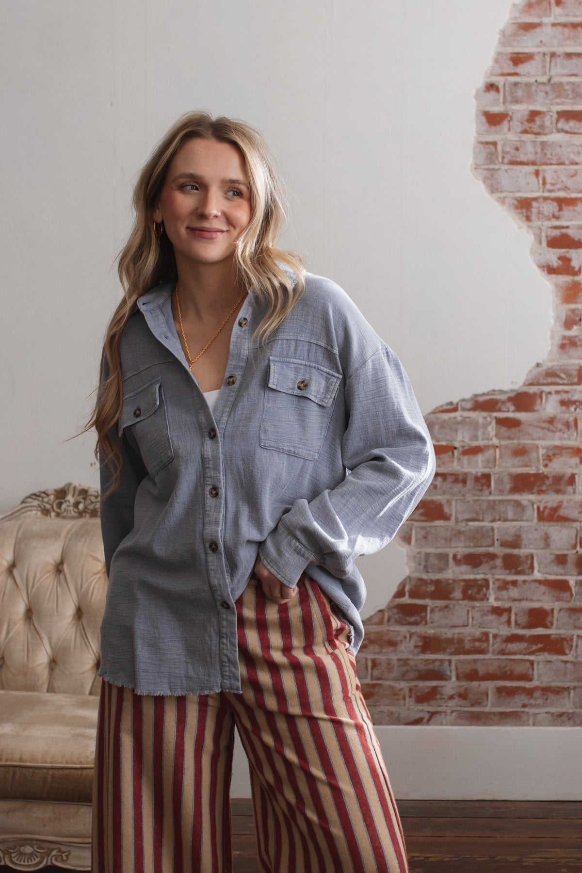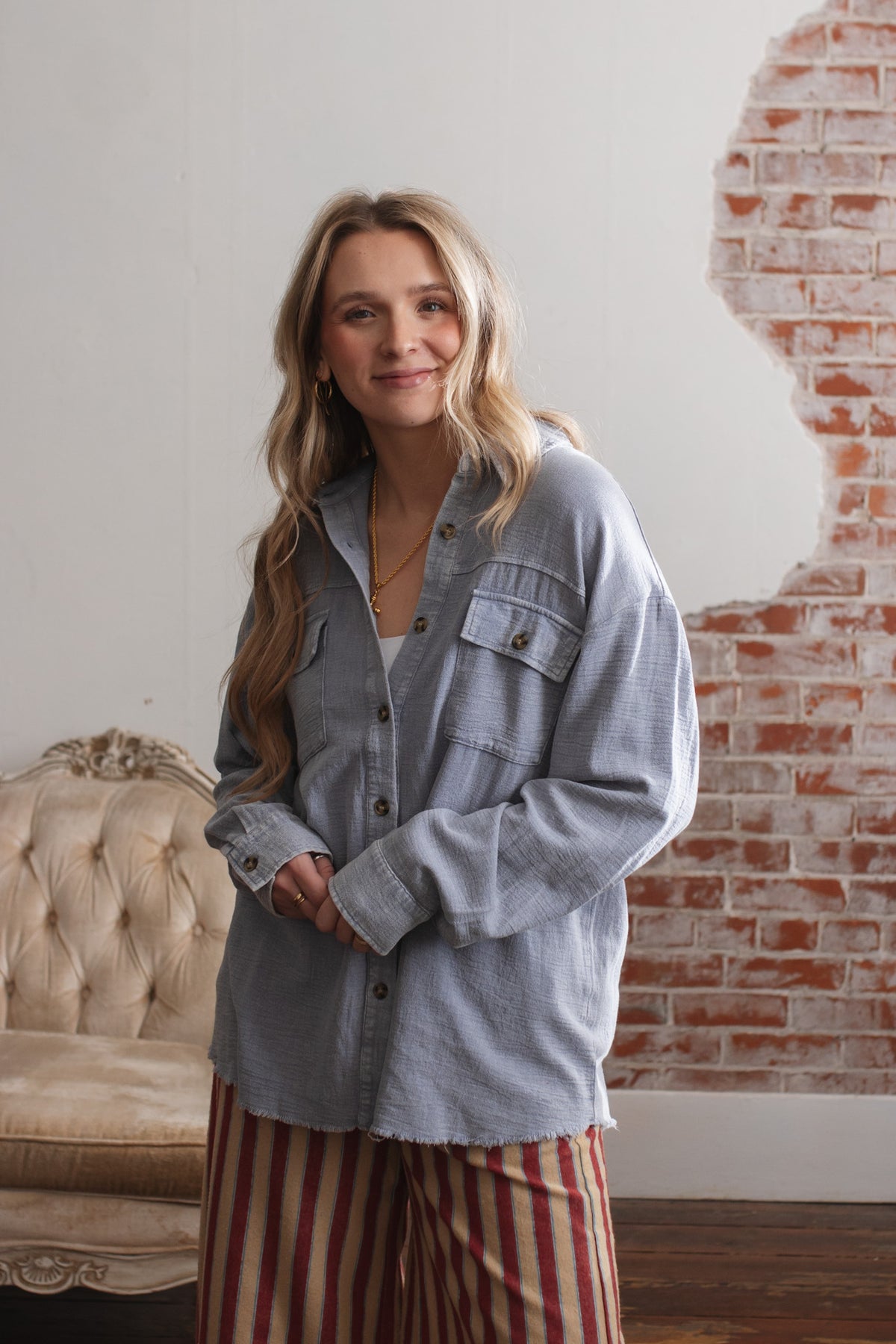 Looking for a lightweight button-down with a little extra texture? The Steele Shirt is that go-to layer you’ll reach for on cool mornings, casual workdays, or just when you want something easy and relaxed. Made from breathable cotton with a softly crinkled feel, it drapes beautifully while keeping things laid-back. The oversized fit adds a touch of borrowed-from-him charm that still feels effortlessly feminine.