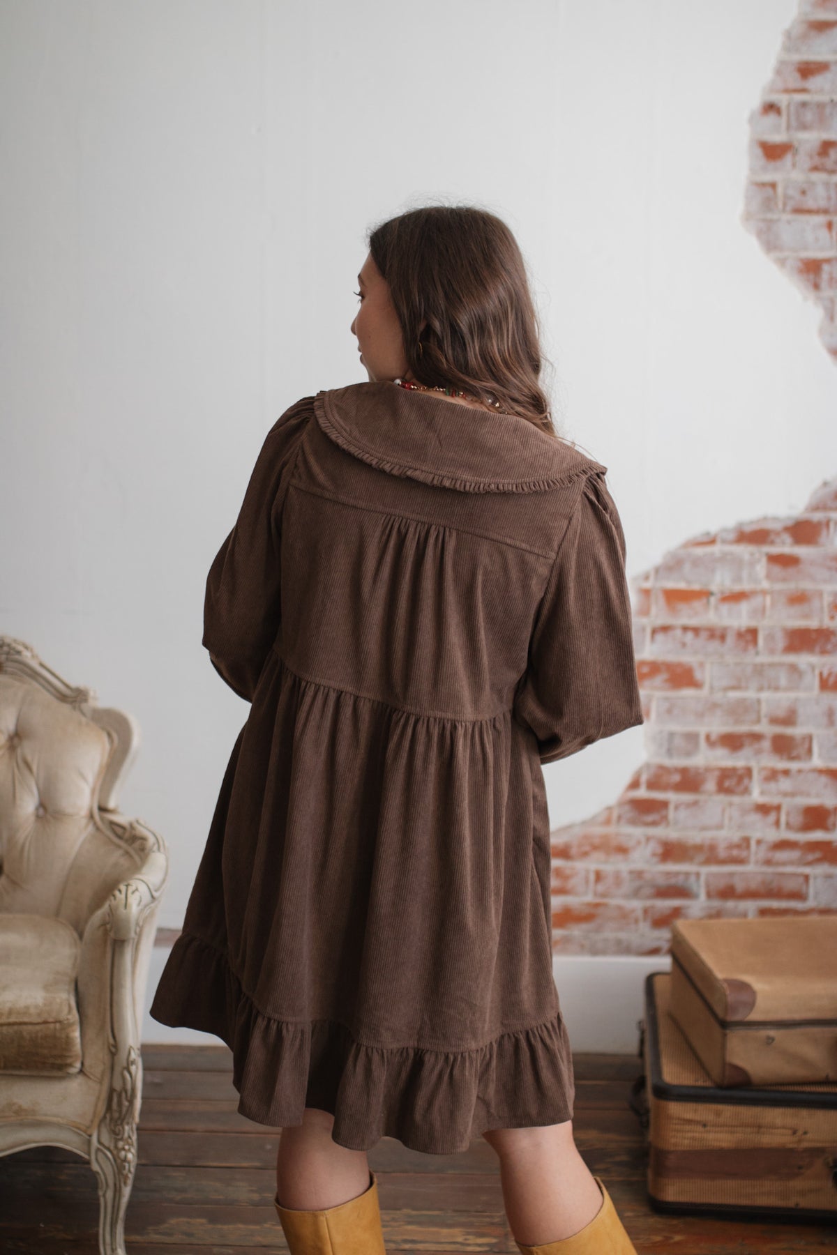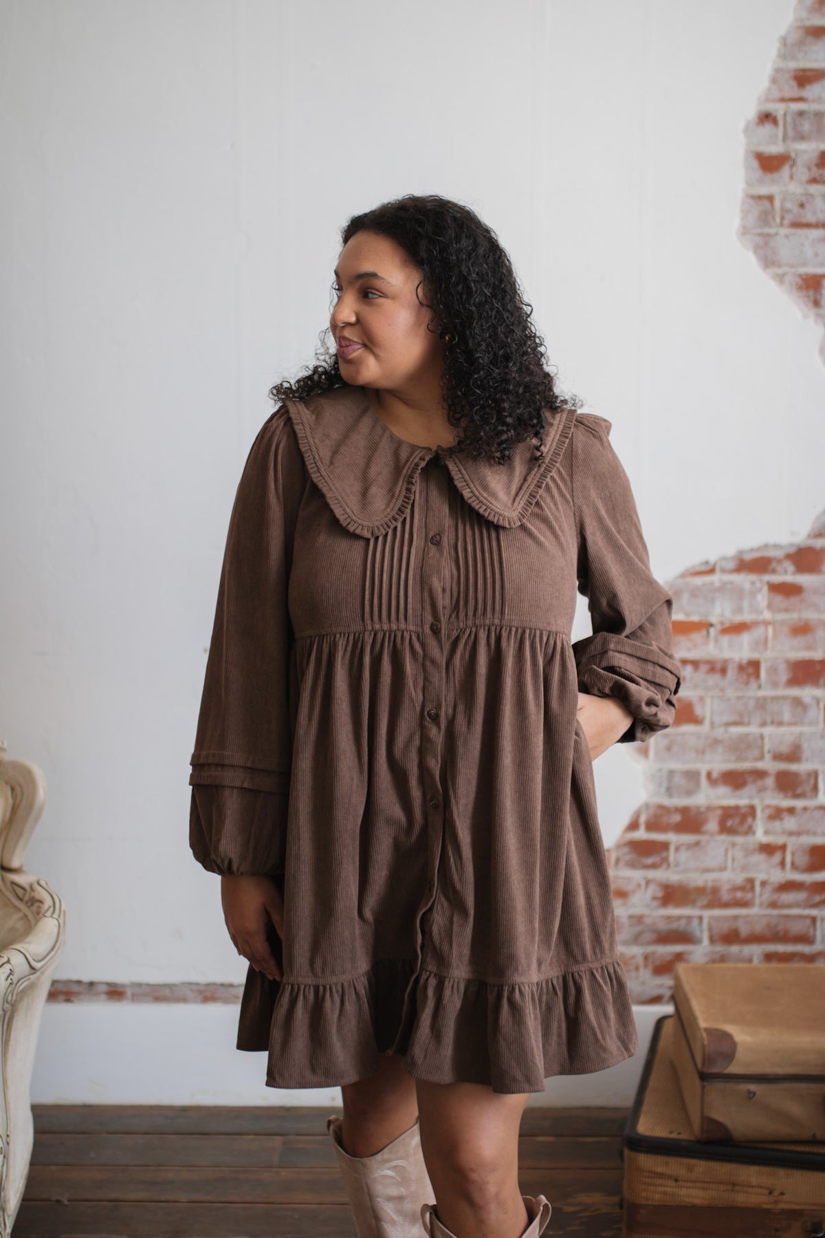 Whimsy meets winter in the Wendy Corduroy Babydoll Dress. Designed in a soft cocoa brown corduroy, this charming piece features a dramatic Peter Pan collar, subtle gathered tiers, and a babydoll silhouette. Functional buttons and hidden pockets add practicality to this playful yet polished look.