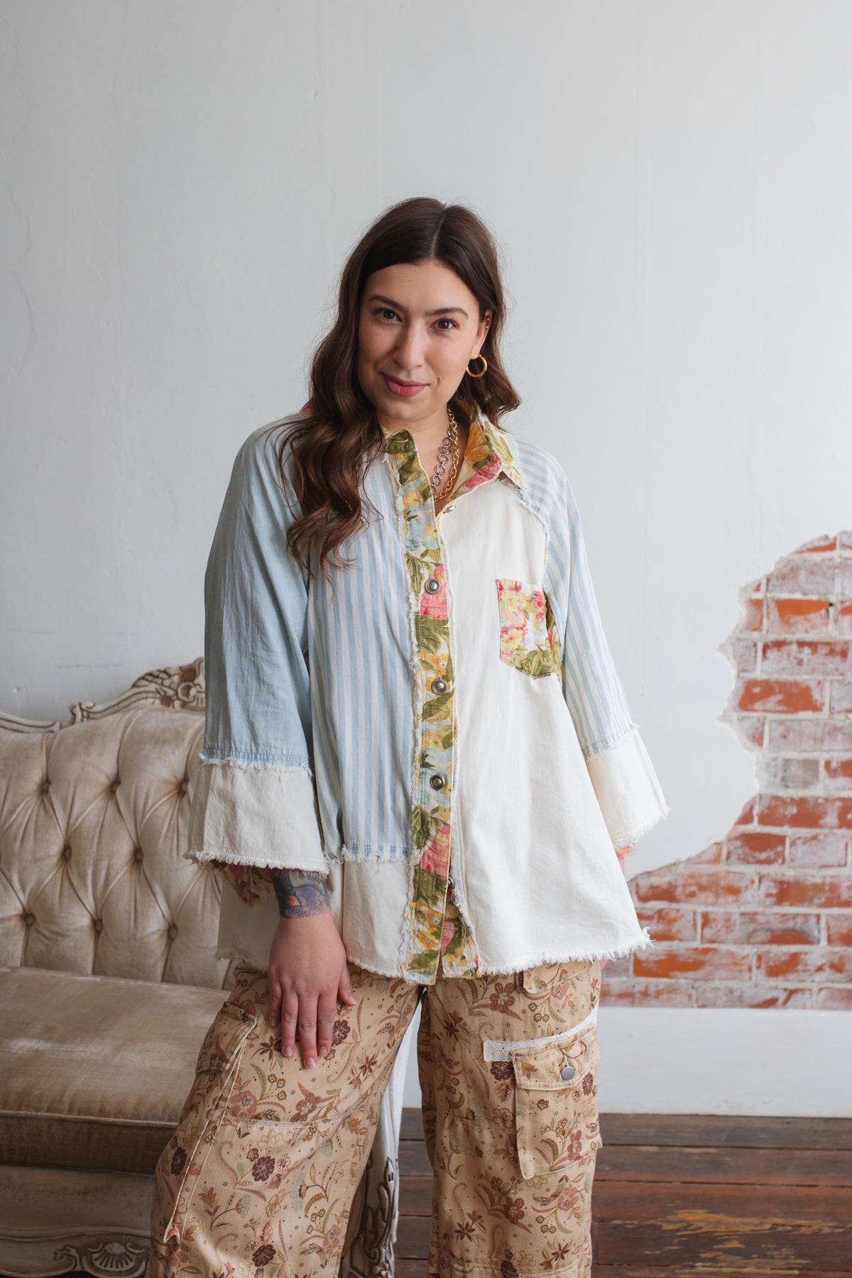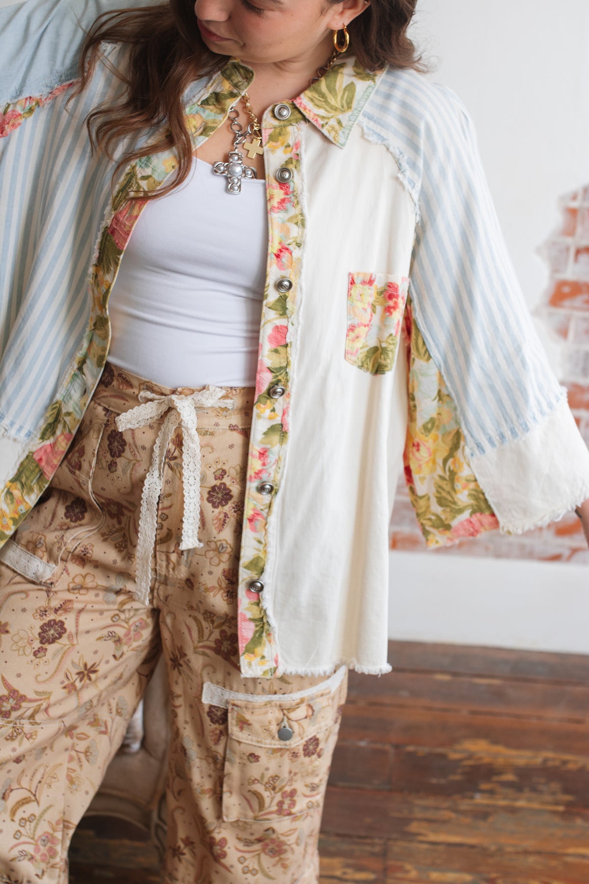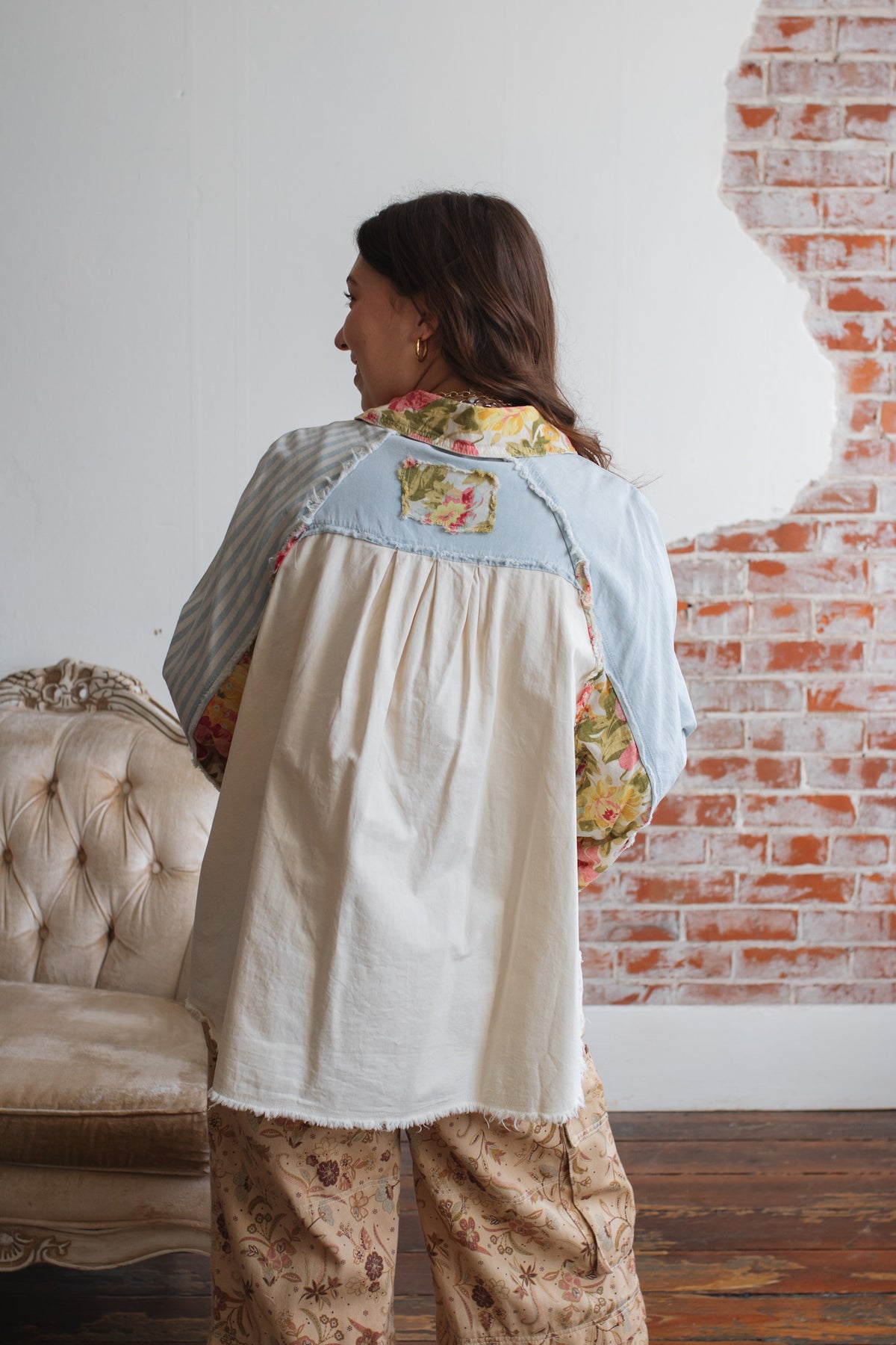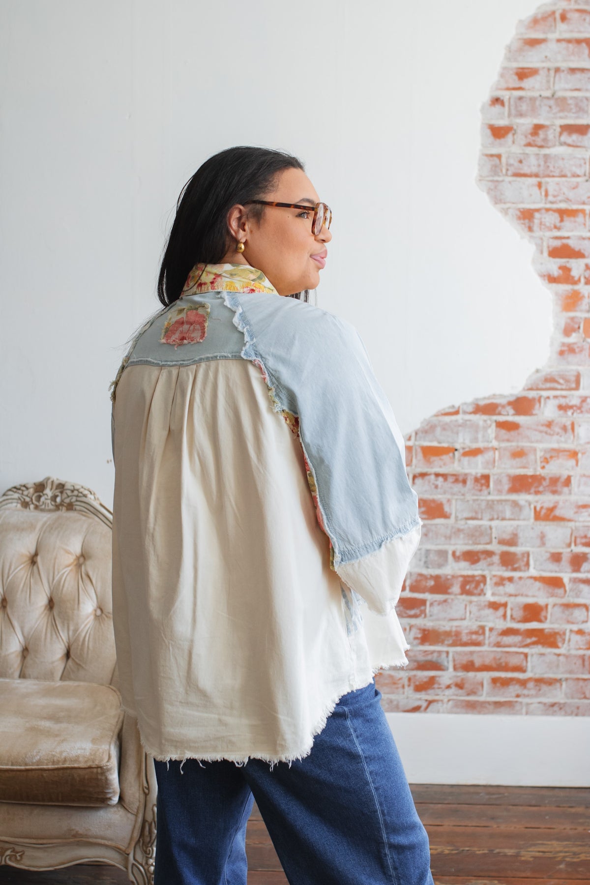 Looking for a lightweight jacket that feels playful, artsy, and one-of-a-kind? The Celo Patchwork Denim Jacket is a vintage soul’s dream, blending soft denim-like cotton with floral pops and raw-edge charm. Whether you wear it open over a tank or buttoned up as a statement shirt, this piece brings an effortless touch of character to everyday outfits.