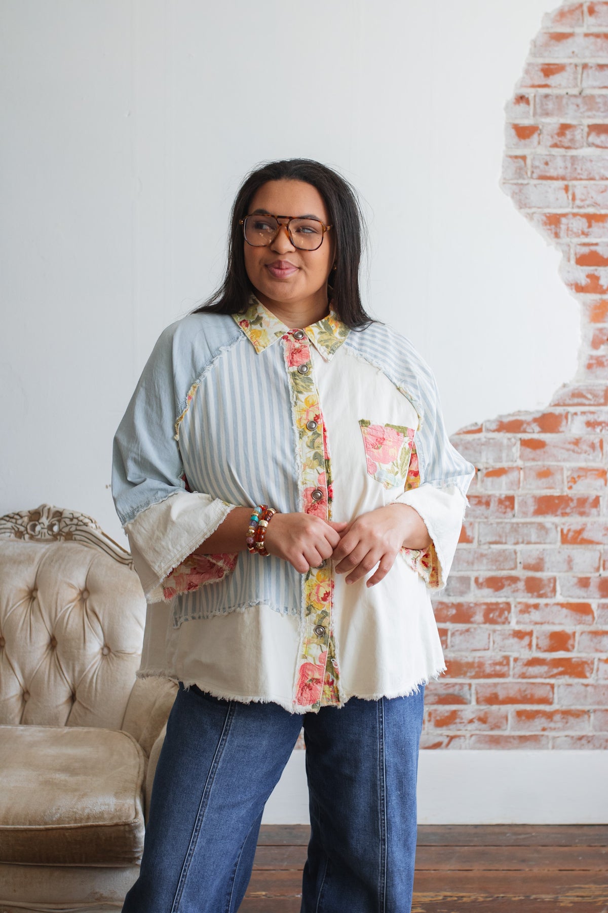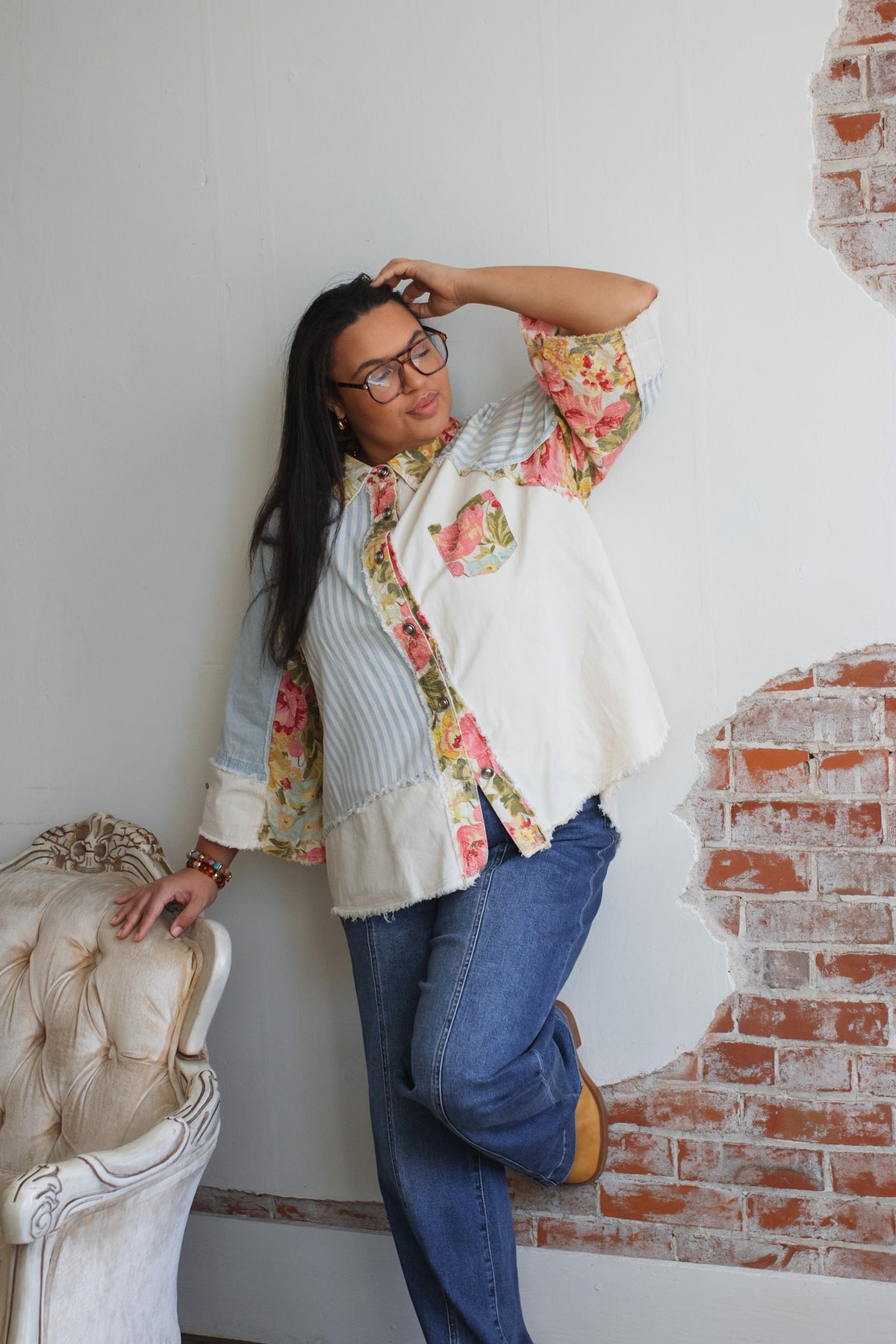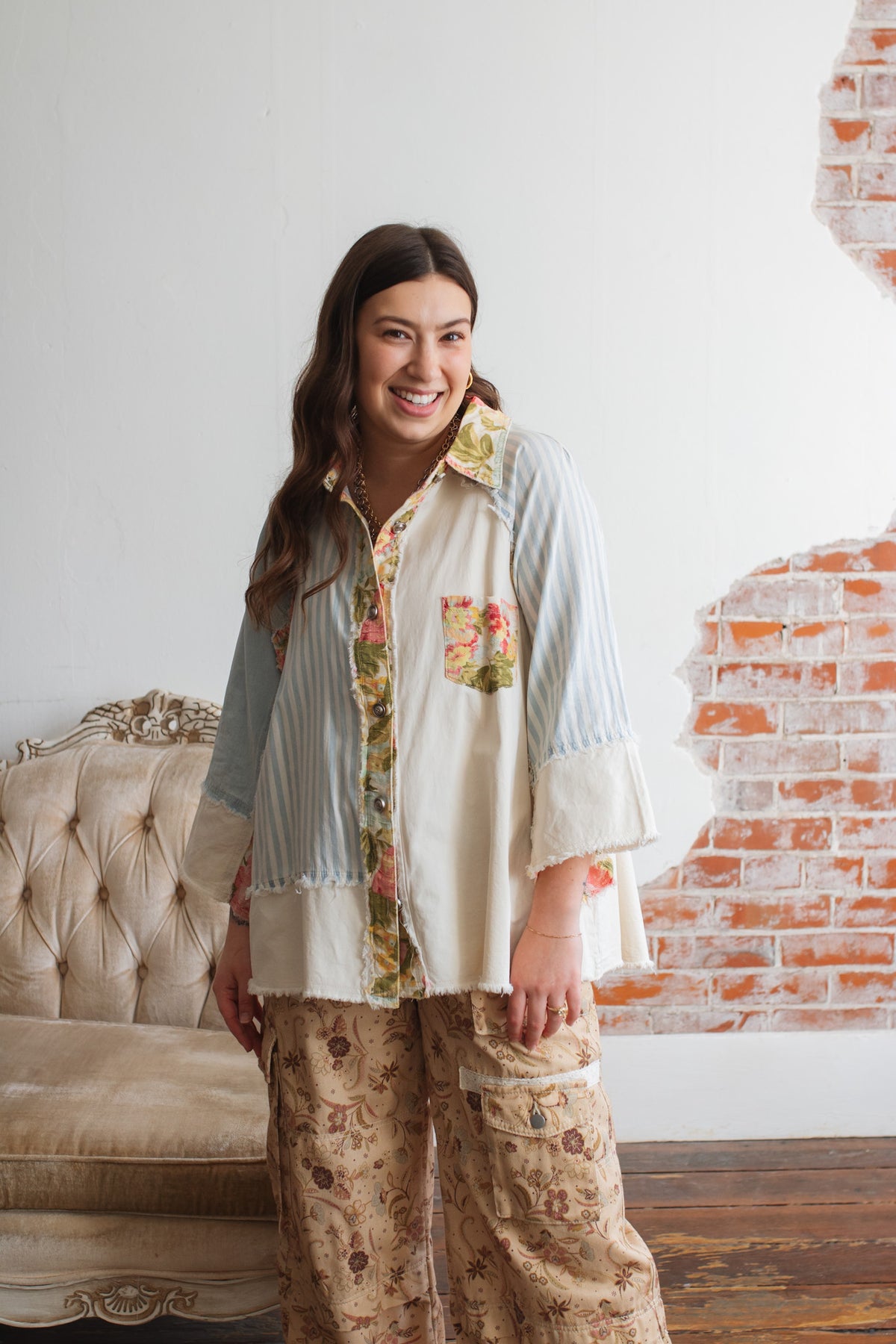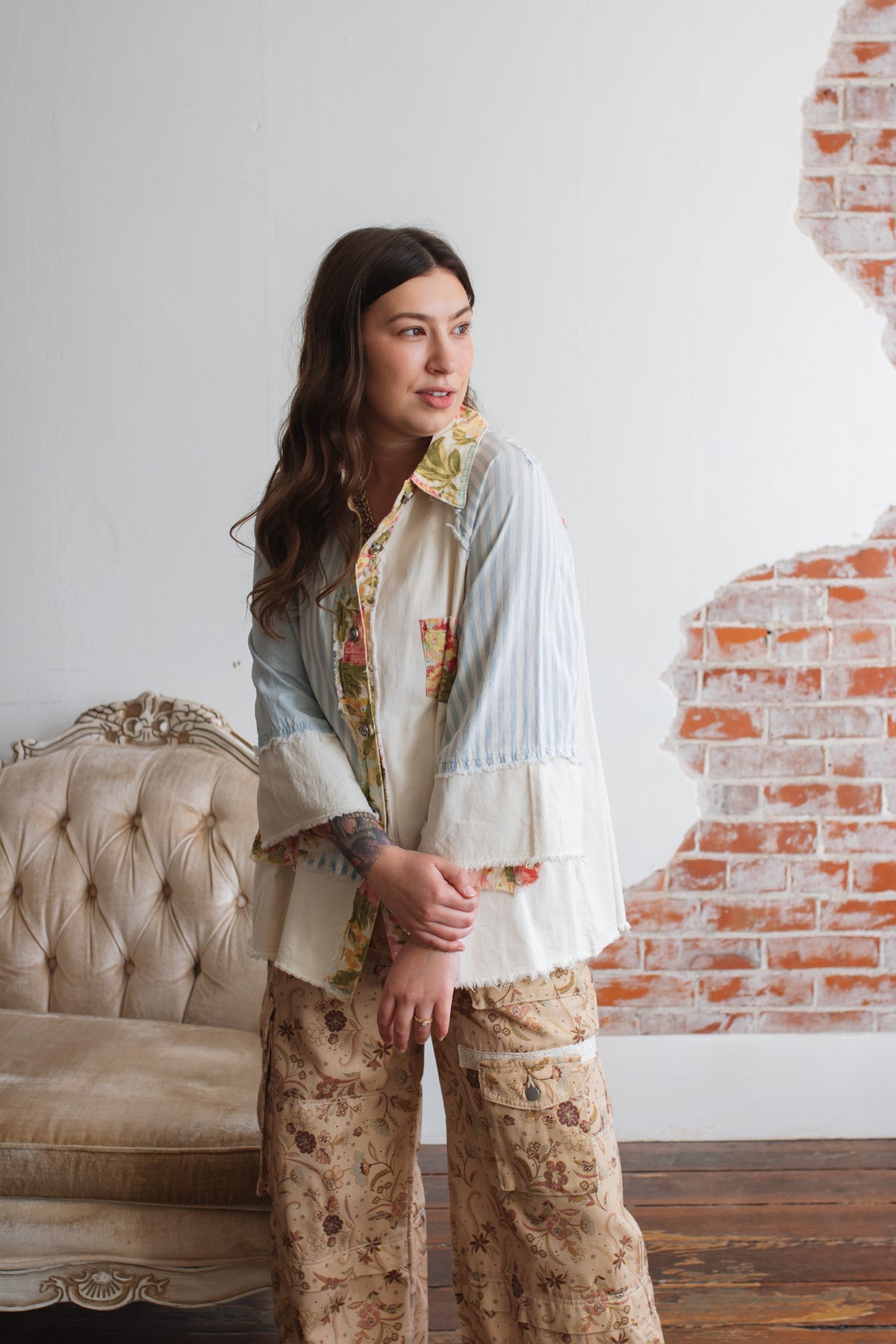 Looking for a lightweight jacket that feels playful, artsy, and one-of-a-kind? The Celo Patchwork Denim Jacket is a vintage soul’s dream, blending soft denim-like cotton with floral pops and raw-edge charm. Whether you wear it open over a tank or buttoned up as a statement shirt, this piece brings an effortless touch of character to everyday outfits.
