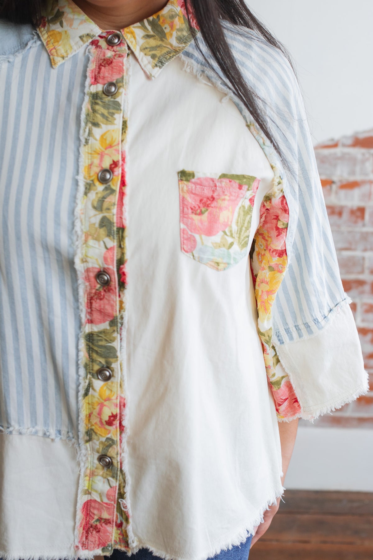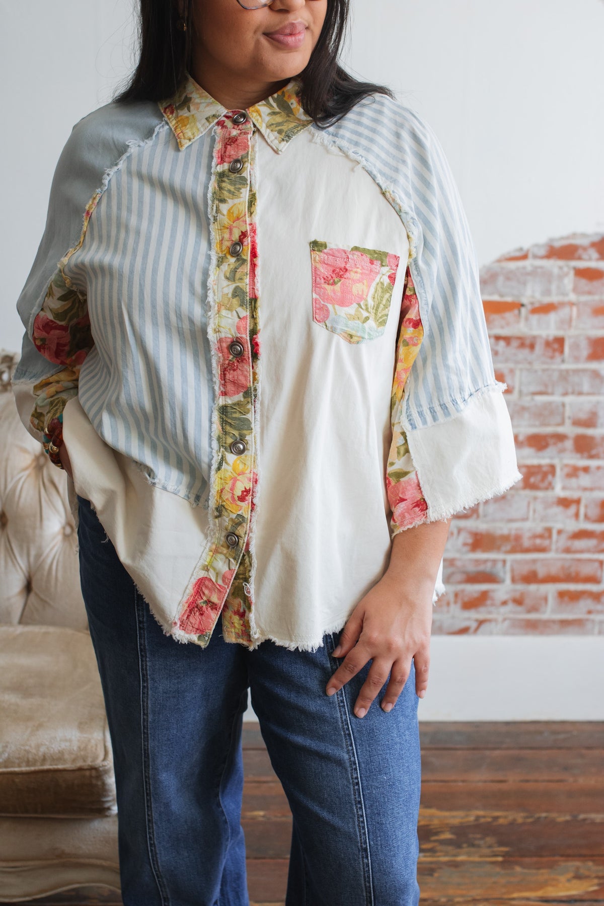 Contrast floral trim at collar, placket, pocket, and sleeves