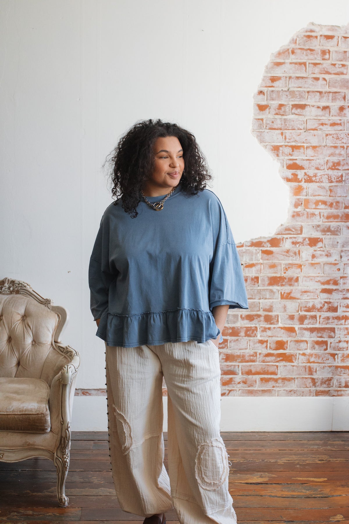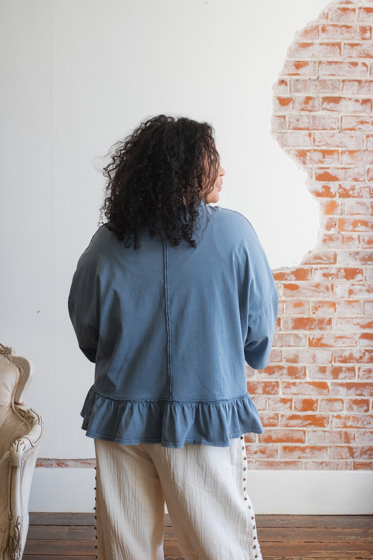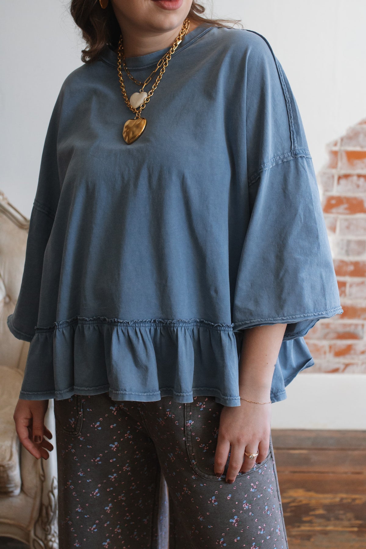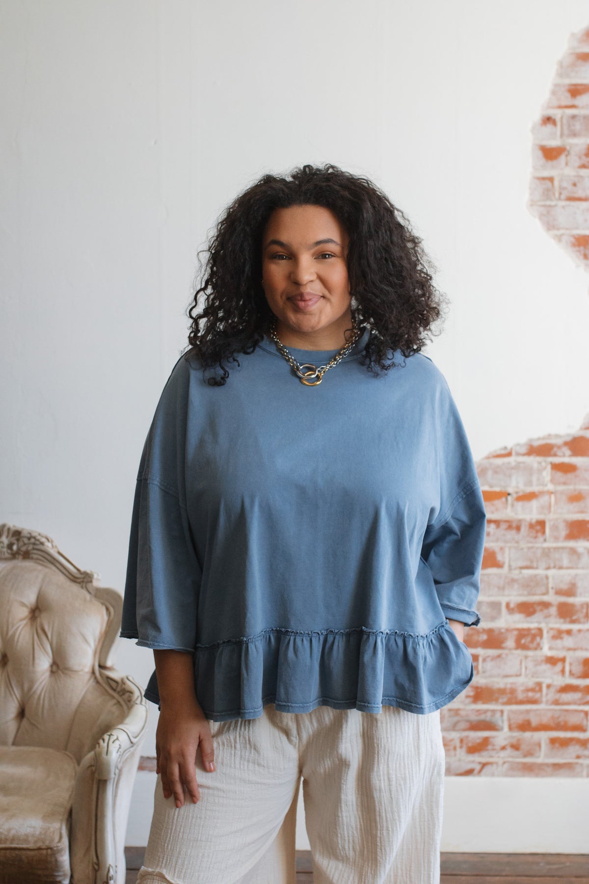 Need a not-so-basic tee that works just as hard as you do? The Emilee Relaxed Ruffle Tee is your new go-to for mornings on the move and weekends that don’t stop. With its roomy fit, soft cotton feel, and playful ruffle hem, it brings just enough flair to your everyday. Toss it on with denim, cargos, or even a flowy skirt — it’s built for real life but still feels a little special.