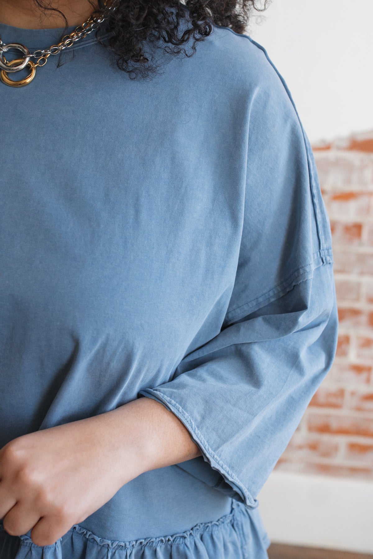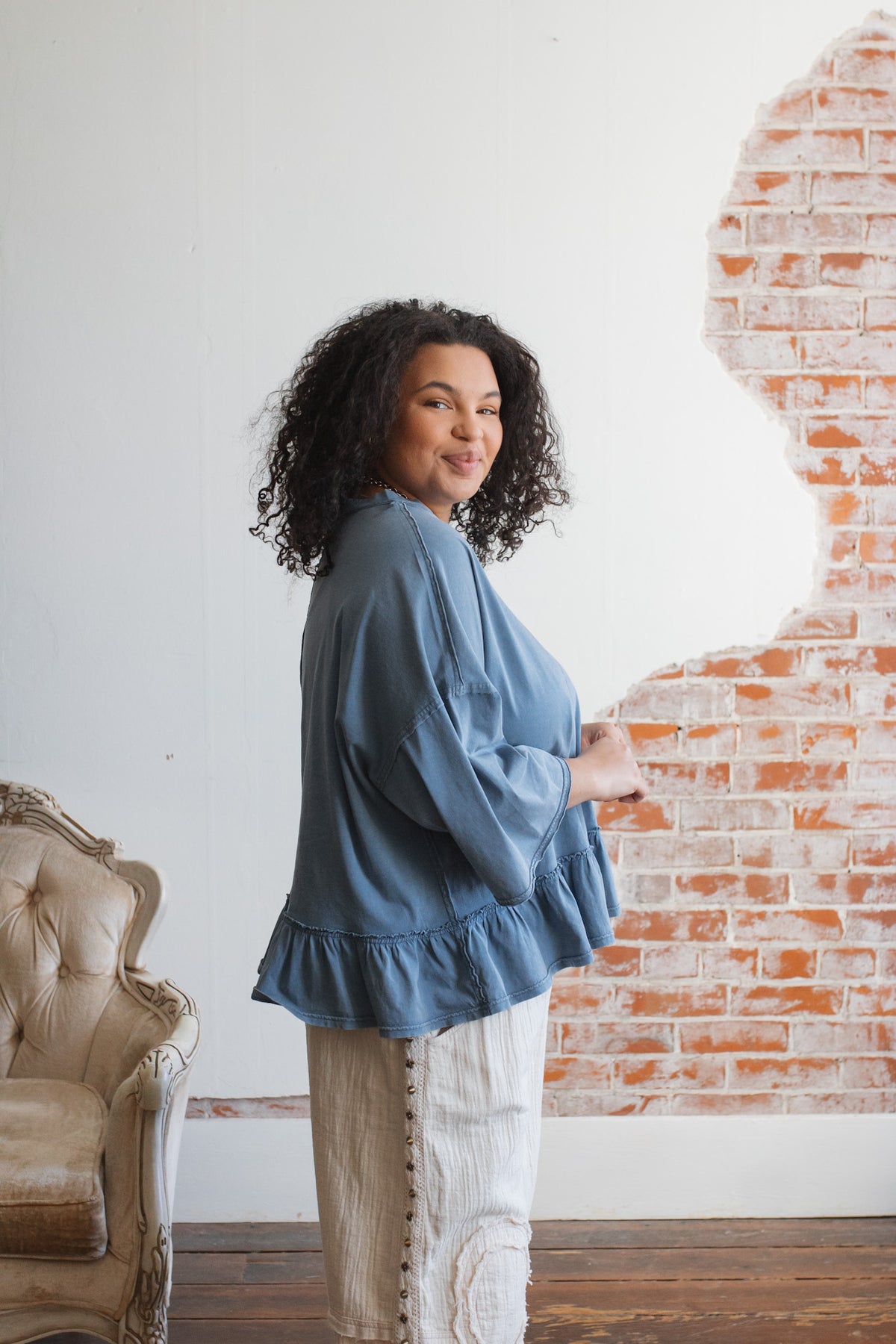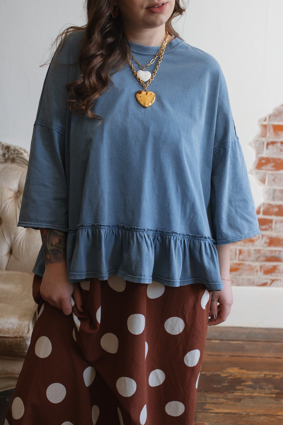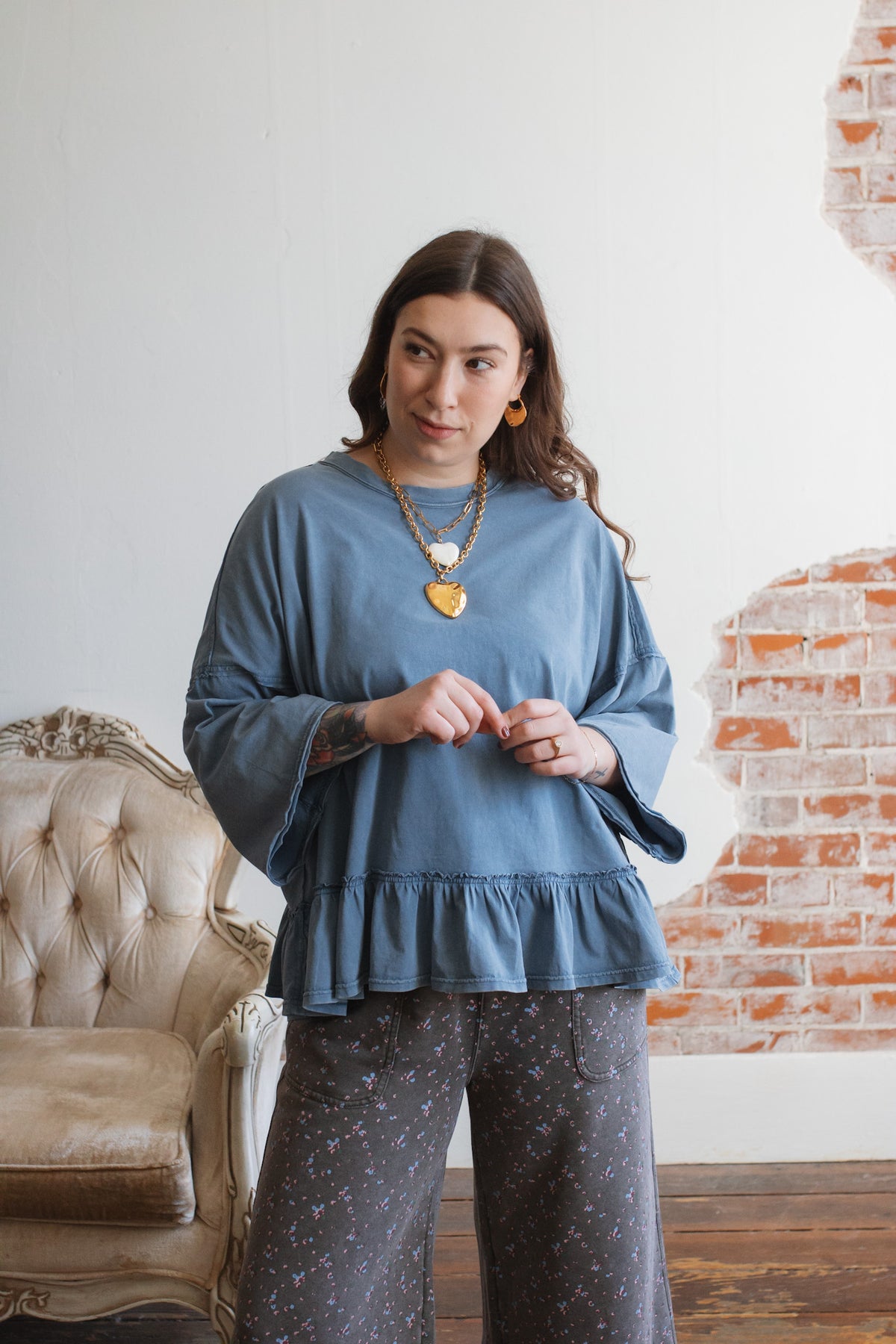 Need a not-so-basic tee that works just as hard as you do? The Emilee Relaxed Ruffle Tee is your new go-to for mornings on the move and weekends that don’t stop. With its roomy fit, soft cotton feel, and playful ruffle hem, it brings just enough flair to your everyday. Toss it on with denim, cargos, or even a flowy skirt — it’s built for real life but still feels a little special.