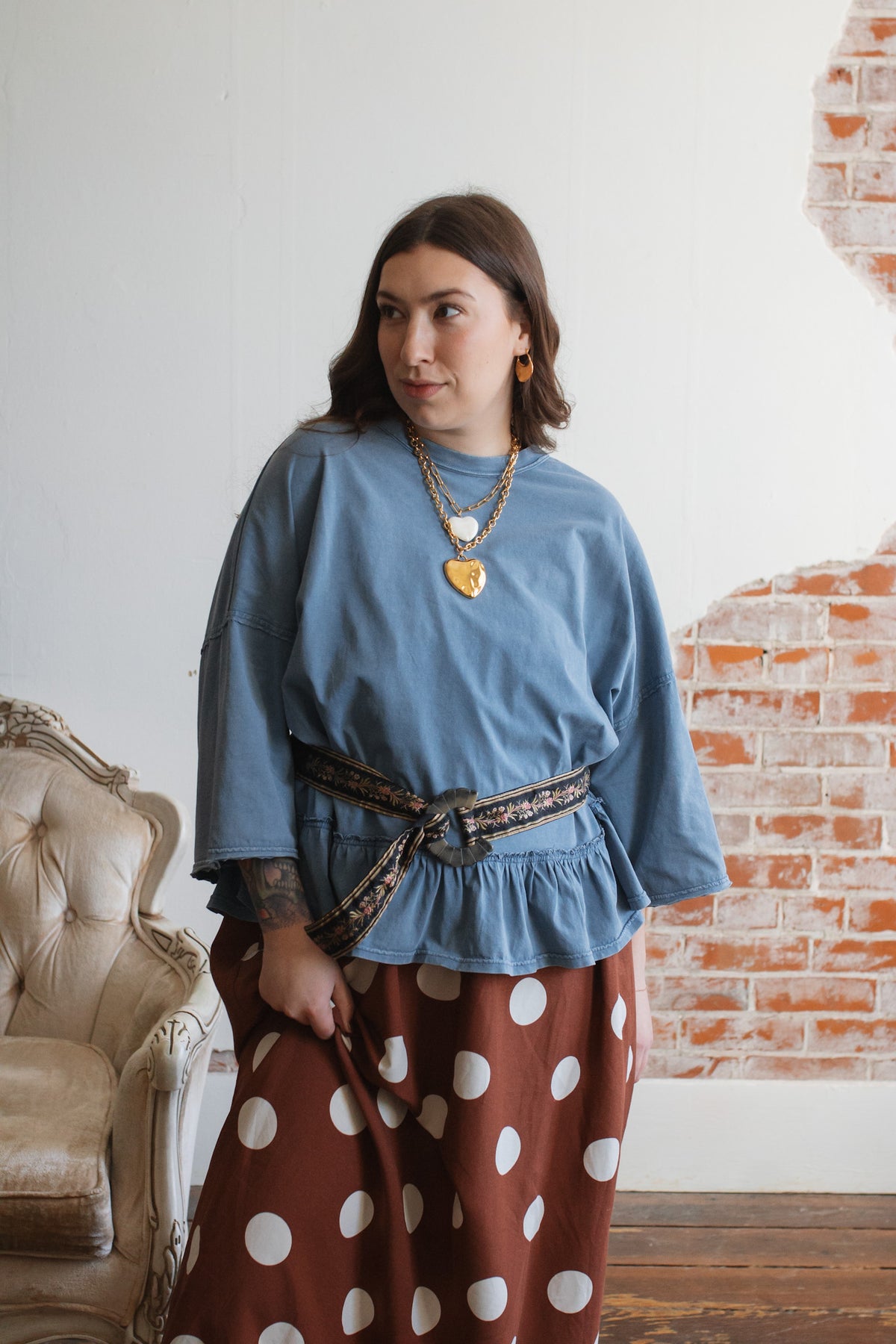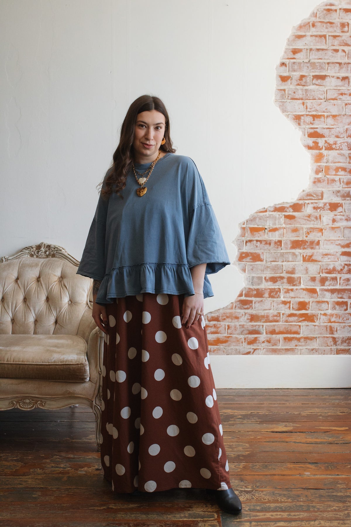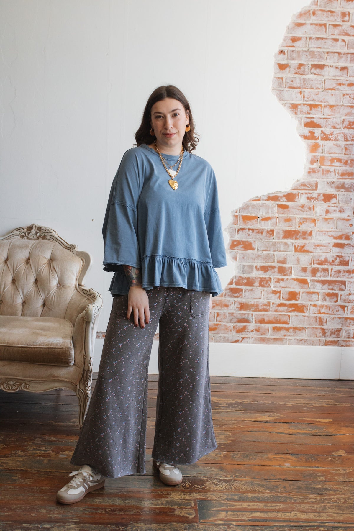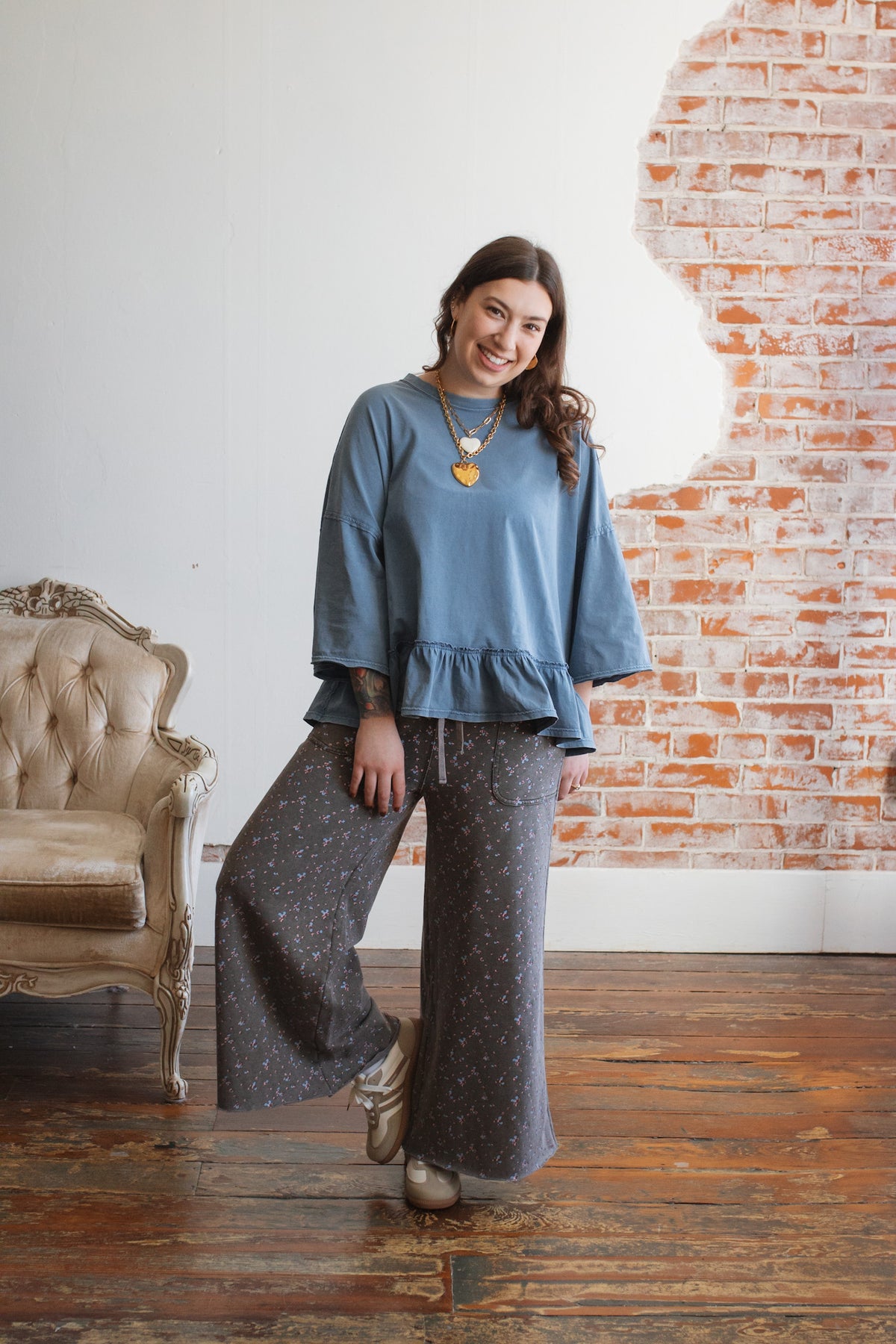 Need a not-so-basic tee that works just as hard as you do? The Emilee Relaxed Ruffle Tee is your new go-to for mornings on the move and weekends that don’t stop. With its roomy fit, soft cotton feel, and playful ruffle hem, it brings just enough flair to your everyday. Toss it on with denim, cargos, or even a flowy skirt — it’s built for real life but still feels a little special.