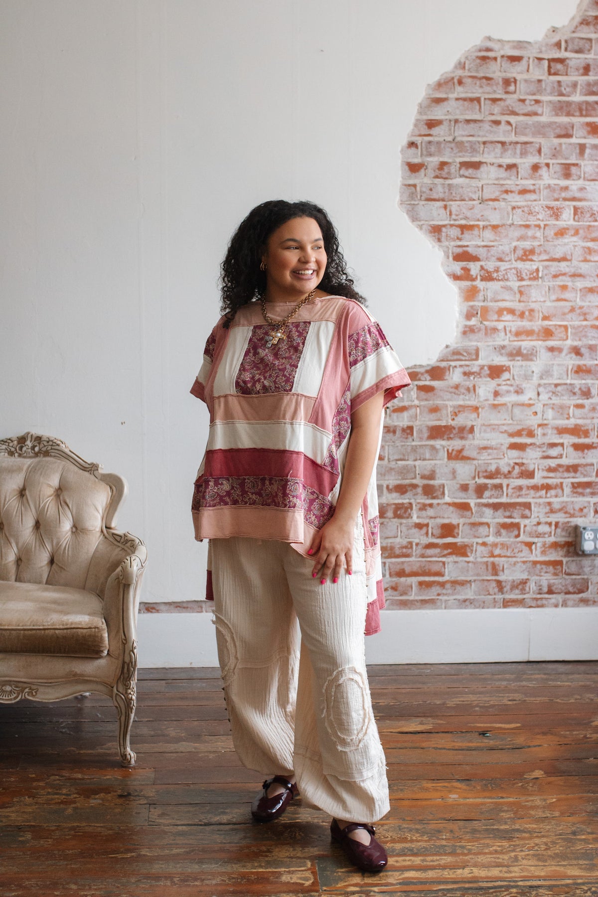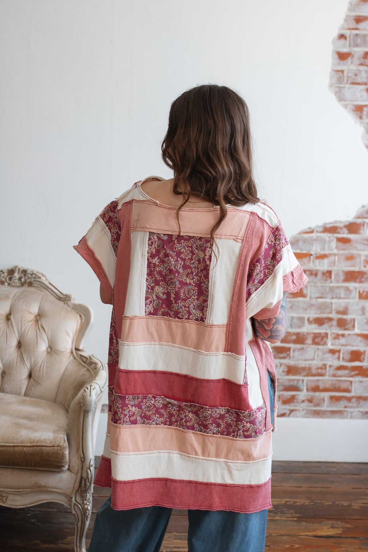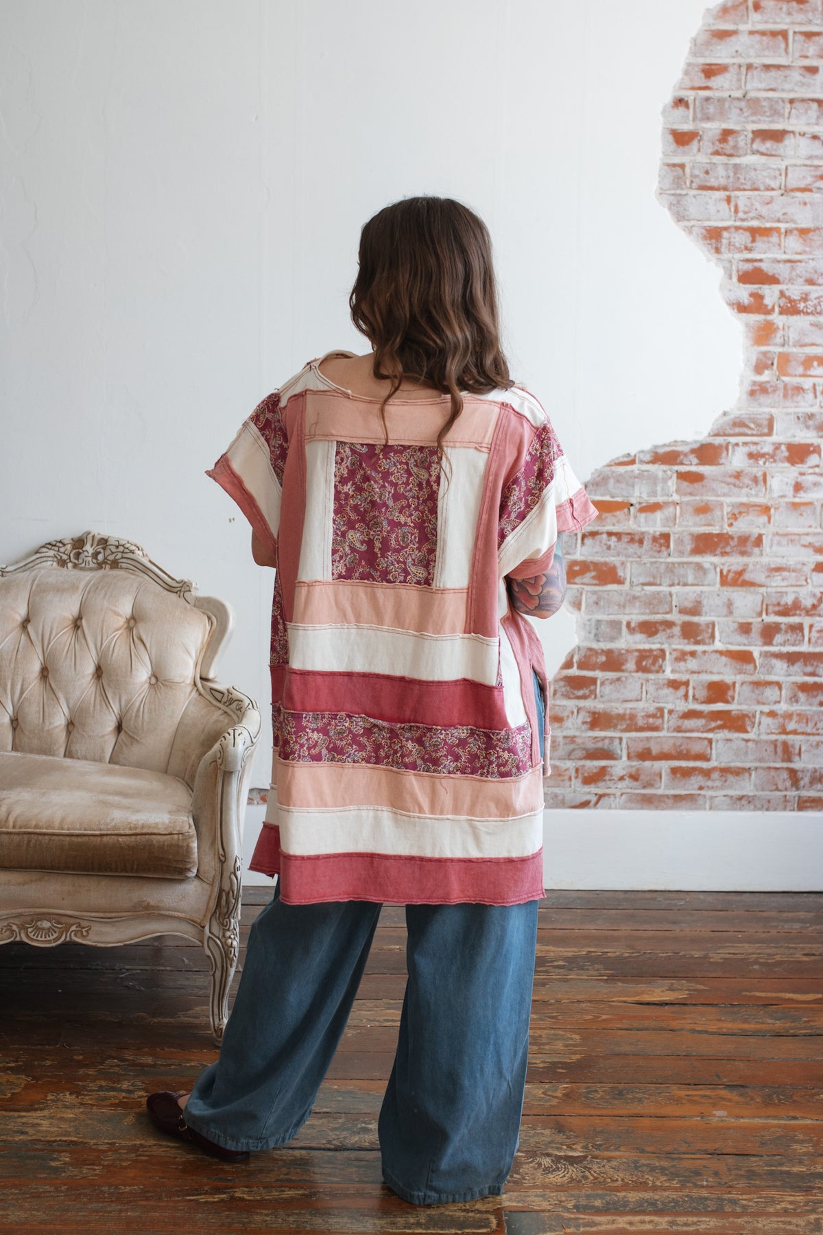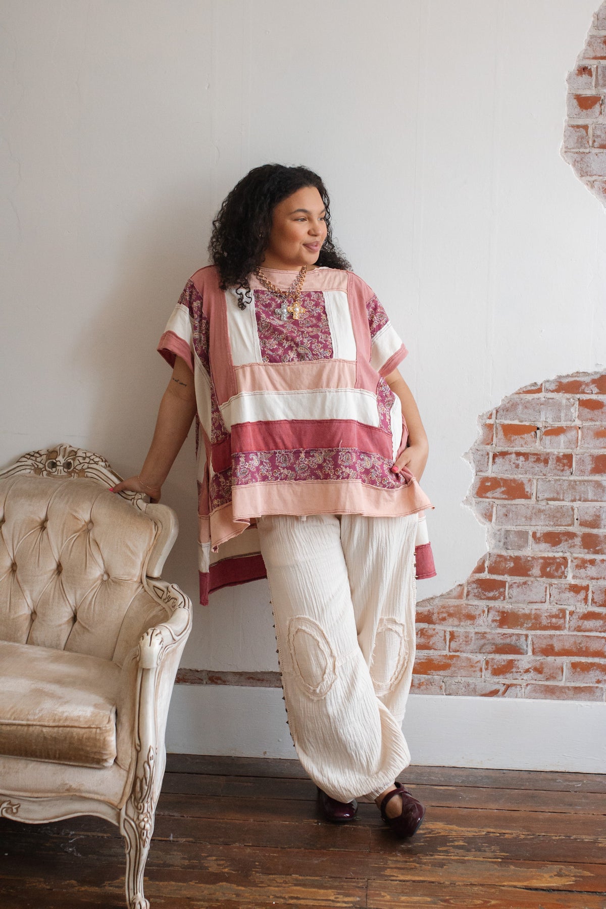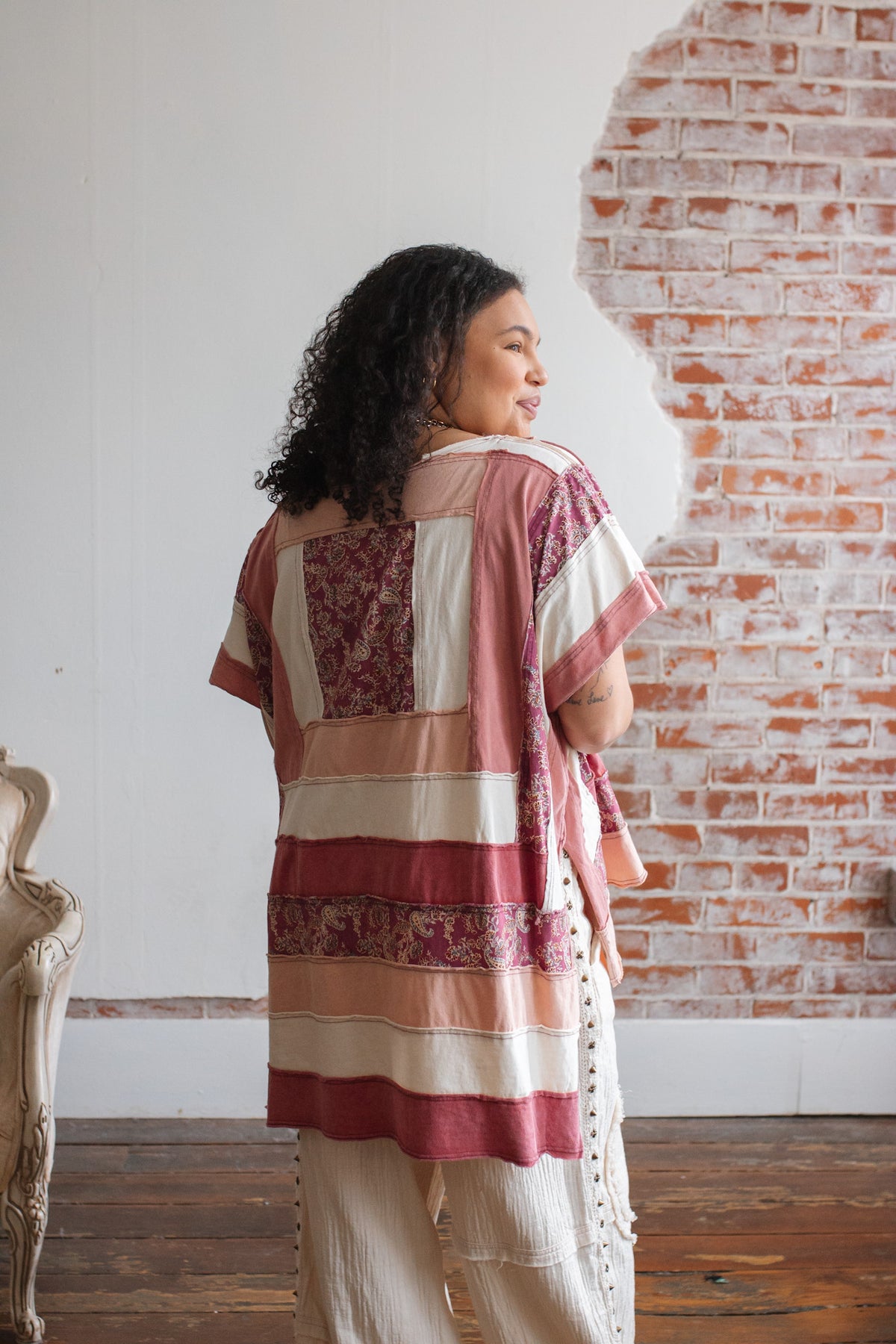 The soft cotton construction keeps it light and breathable, while the mixed panels create a curated, heirloom feel. The oversized shape drapes beautifully, and the side slits give it that effortless swing that moves with you.