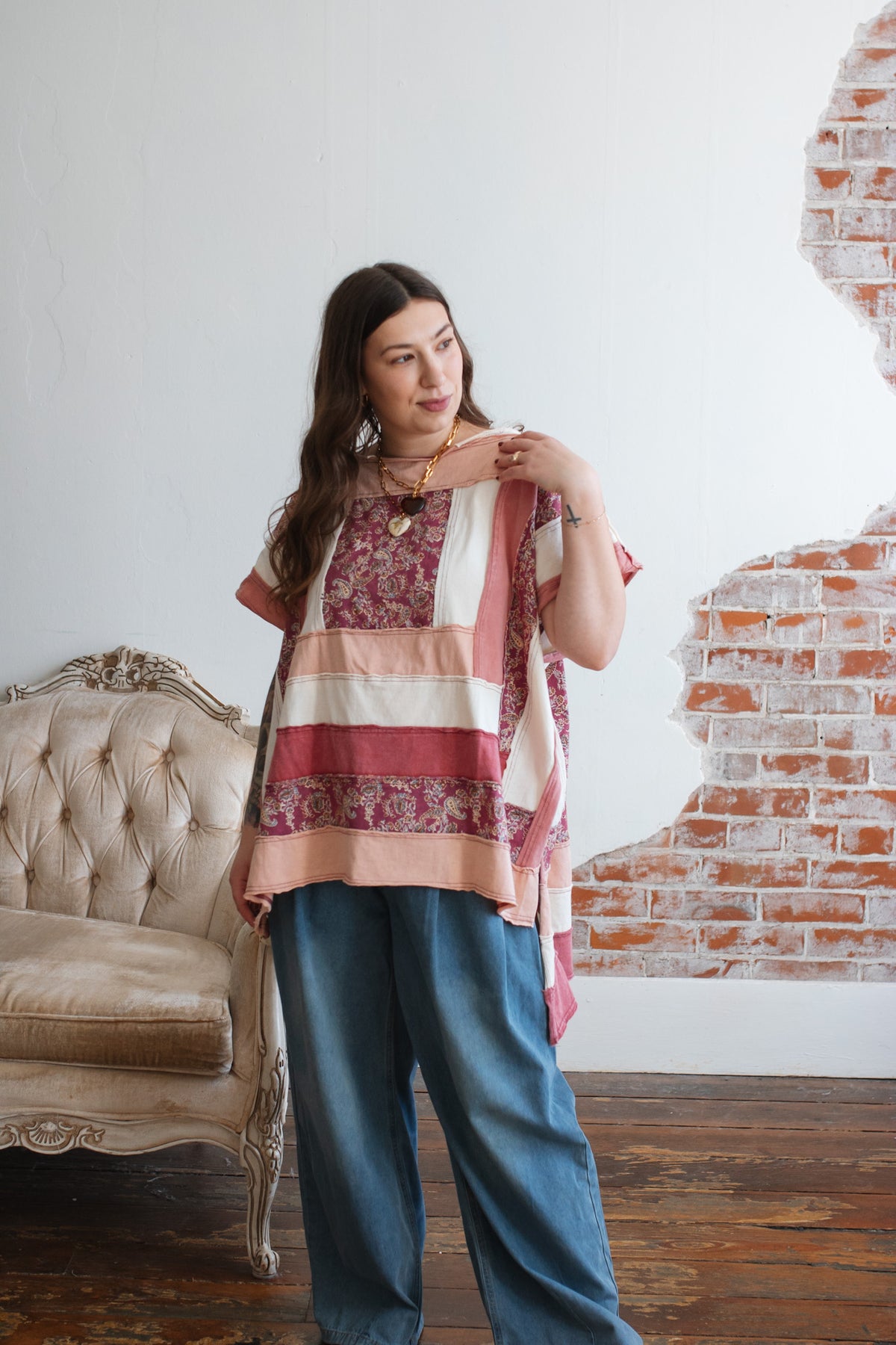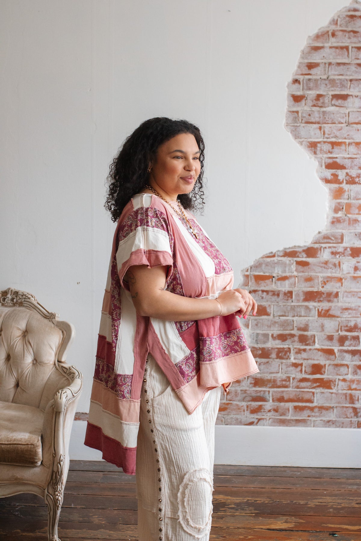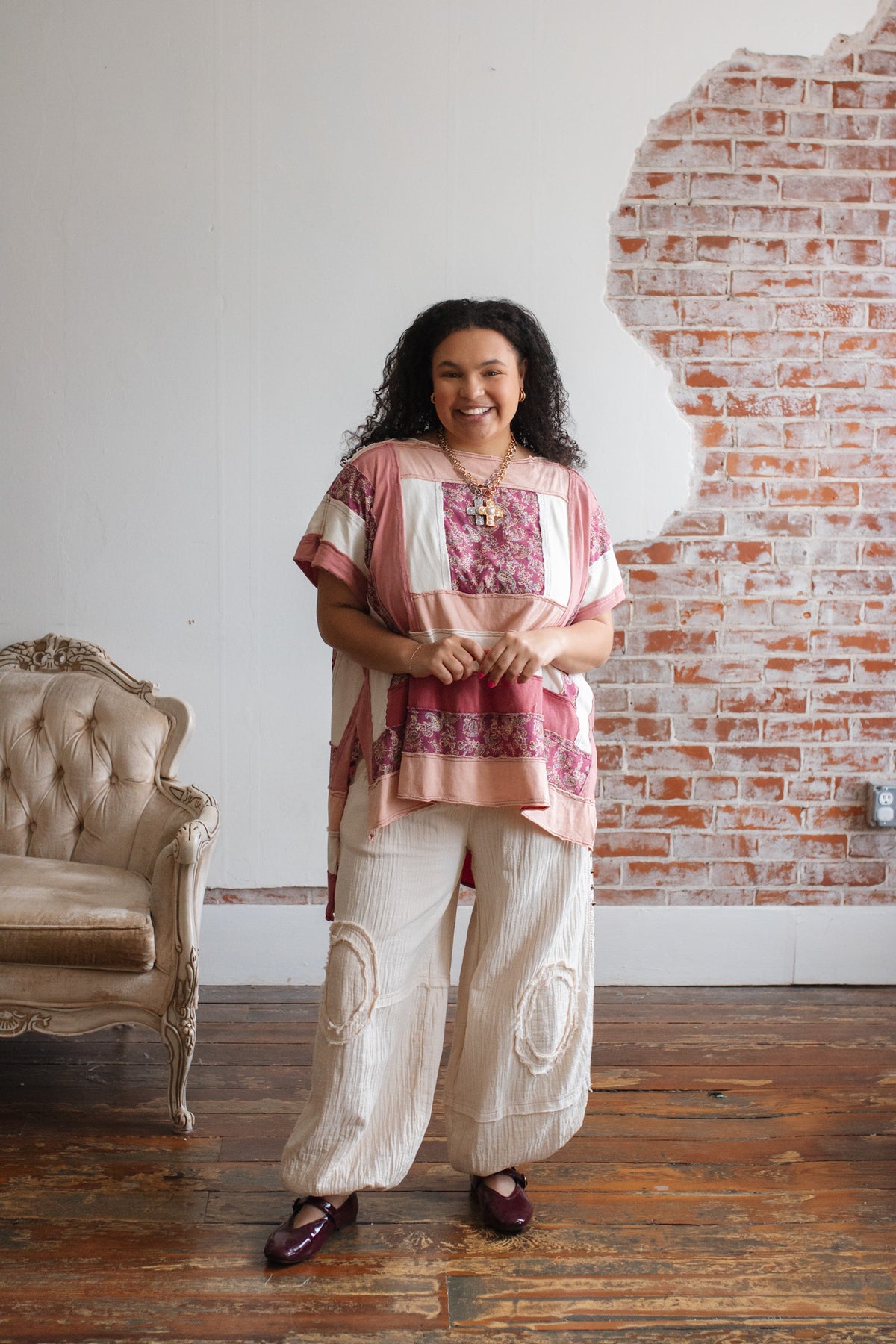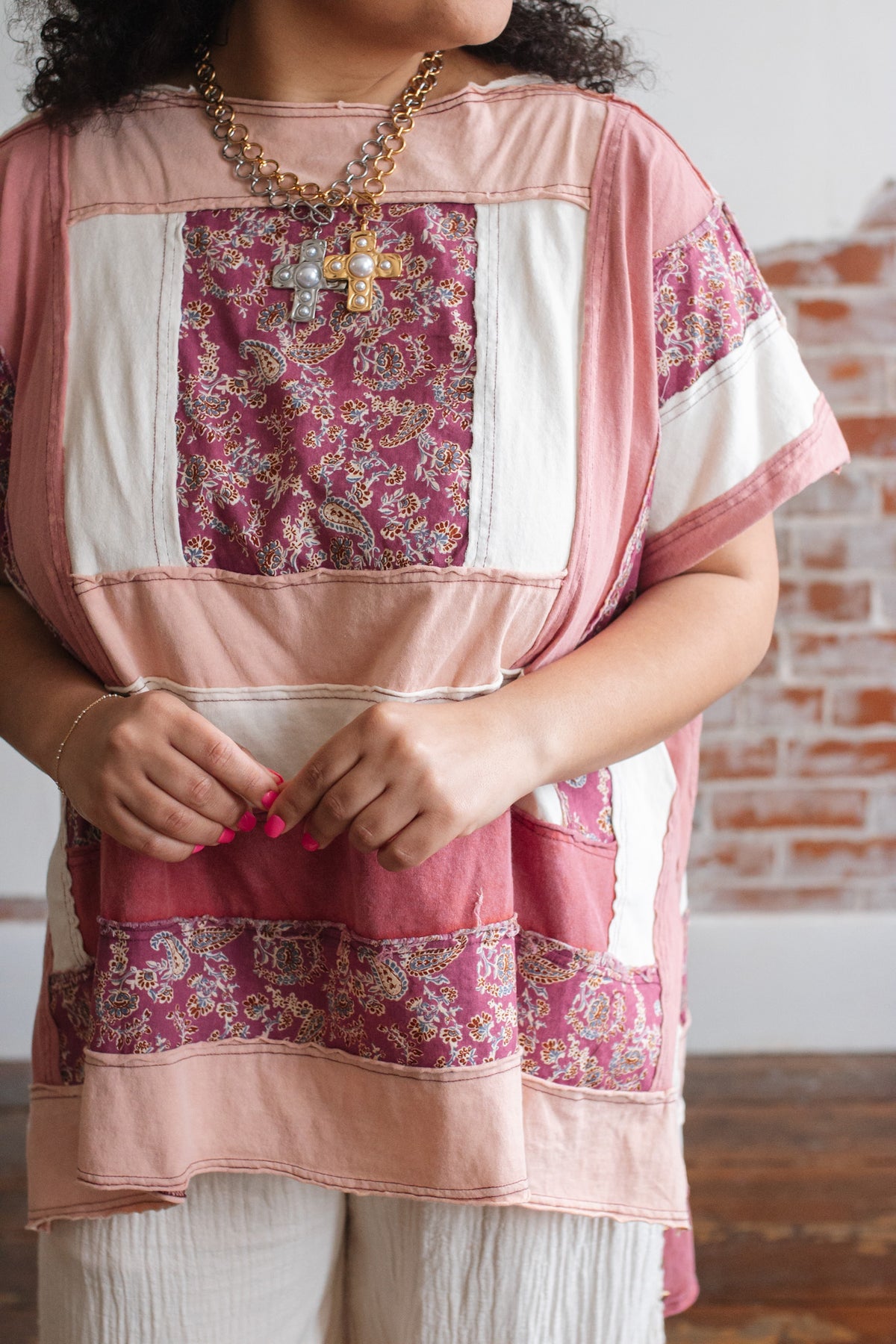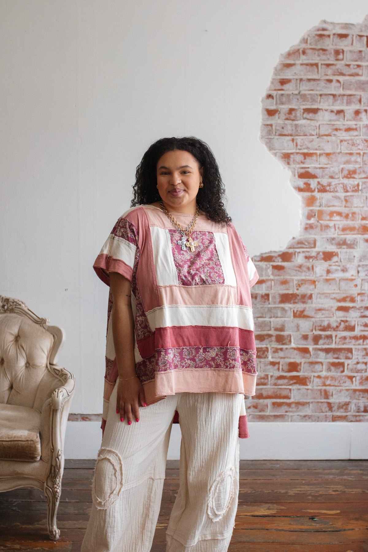 The soft cotton construction keeps it light and breathable, while the mixed panels create a curated, heirloom feel. The oversized shape drapes beautifully, and the side slits give it that effortless swing that moves with you.