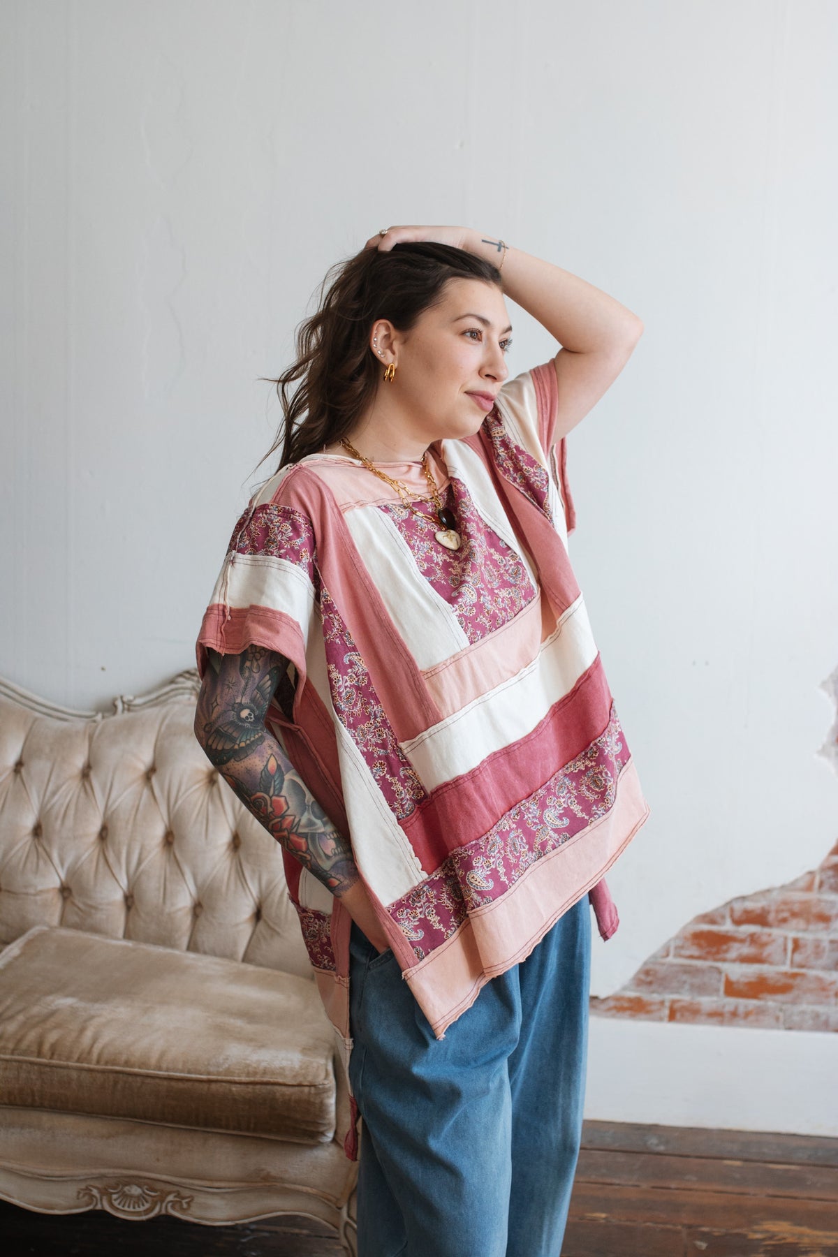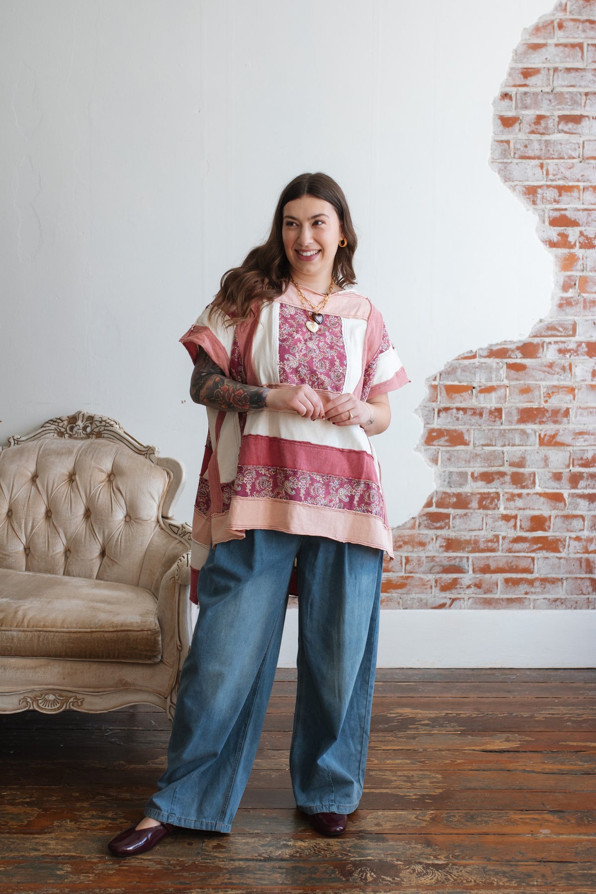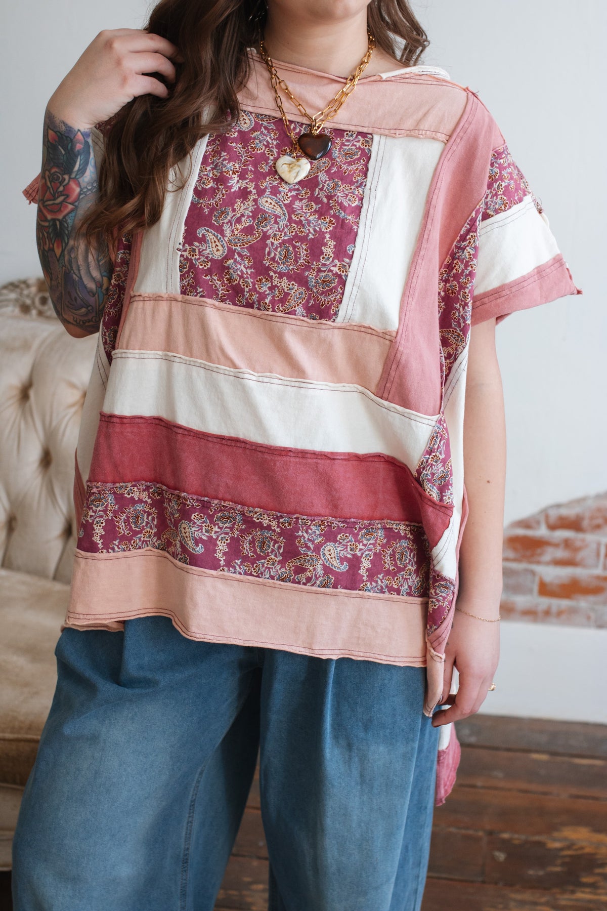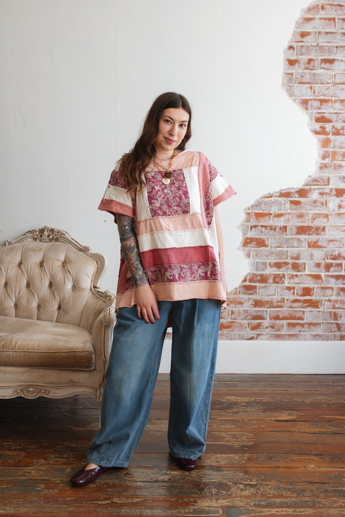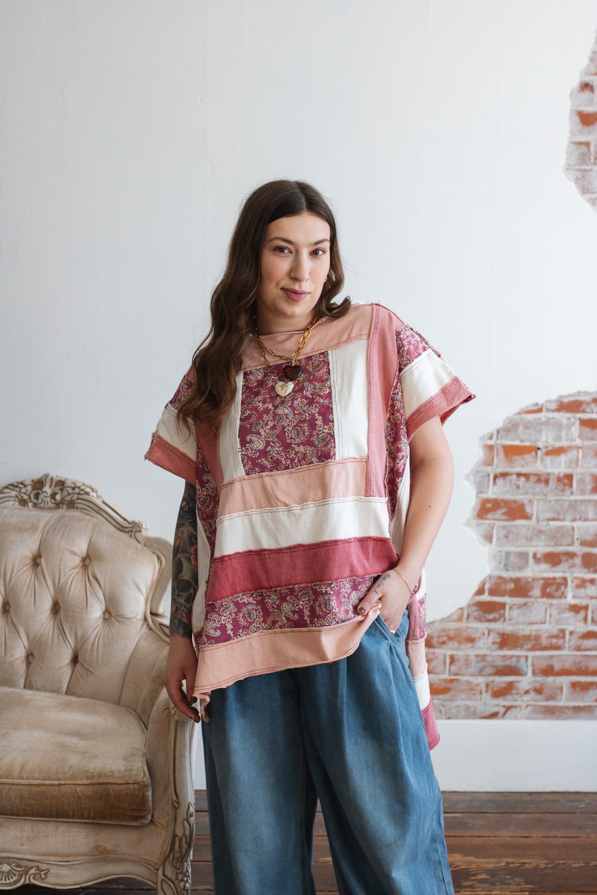 The soft cotton construction keeps it light and breathable, while the mixed panels create a curated, heirloom feel. The oversized shape drapes beautifully, and the side slits give it that effortless swing that moves with you.