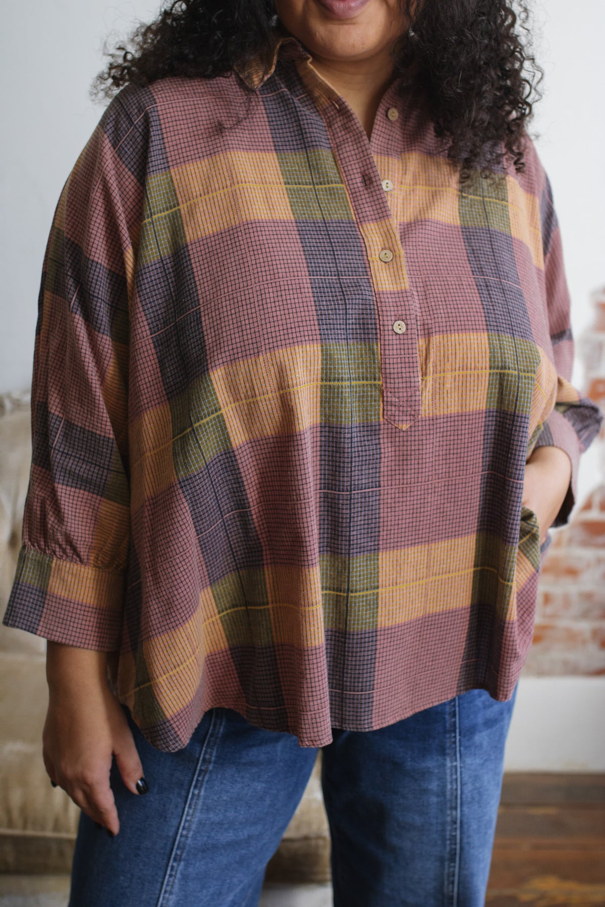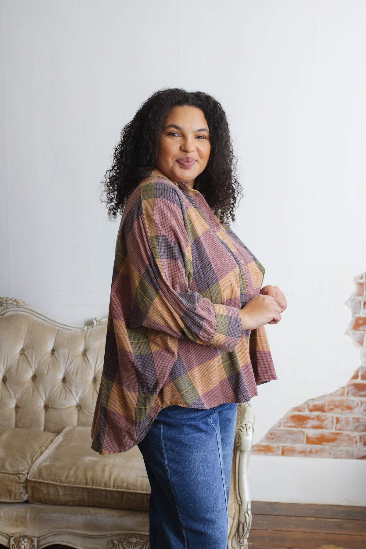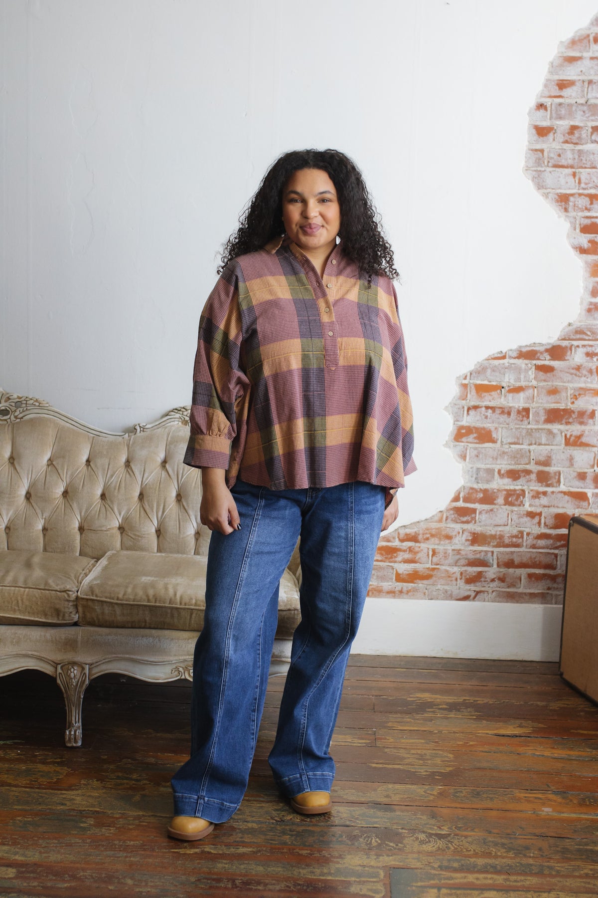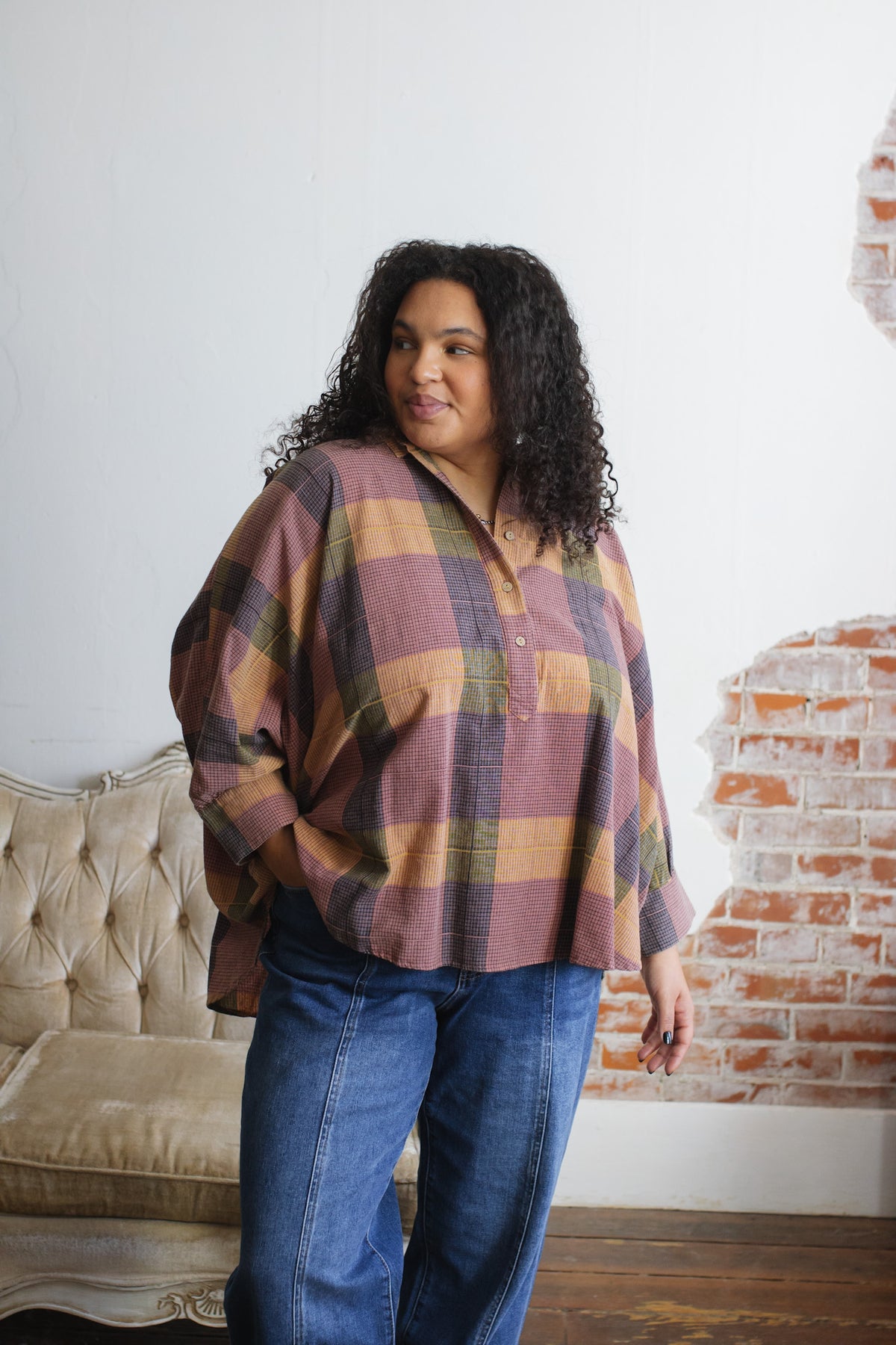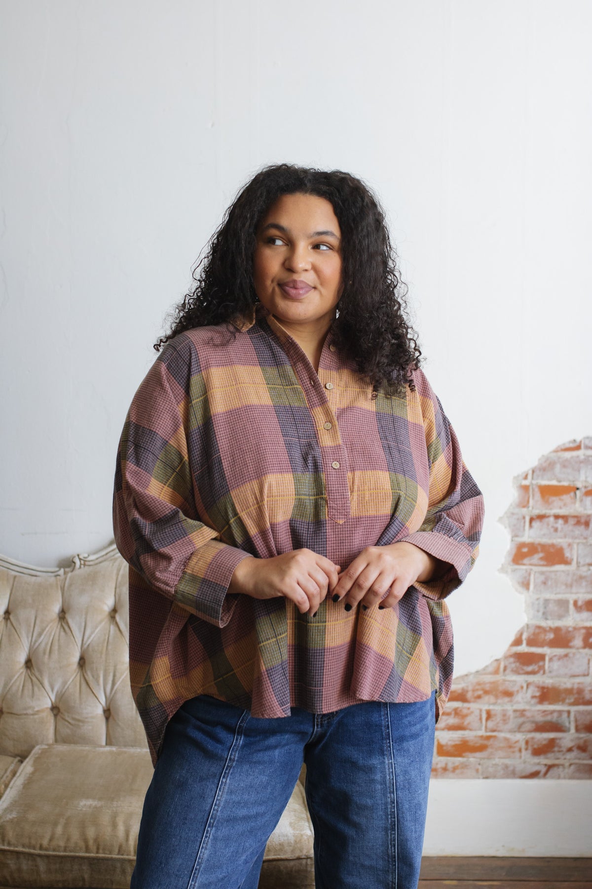 If you’re all about easygoing comfort with a splash of personality, the Alex Oversized Plaid Henley Top checks every box. Designed in a lived-in cotton blend with a bold, warm-toned plaid, this top features functional henley buttons, a relaxed drop shoulder, and a roomy fit that drapes like a dream. The soft 3/4 sleeves and curved hem keep things casual—but the color combo keeps it anything but boring.