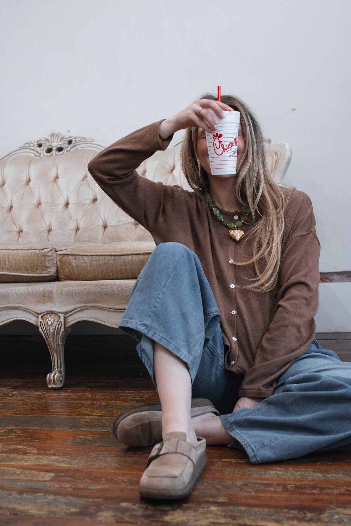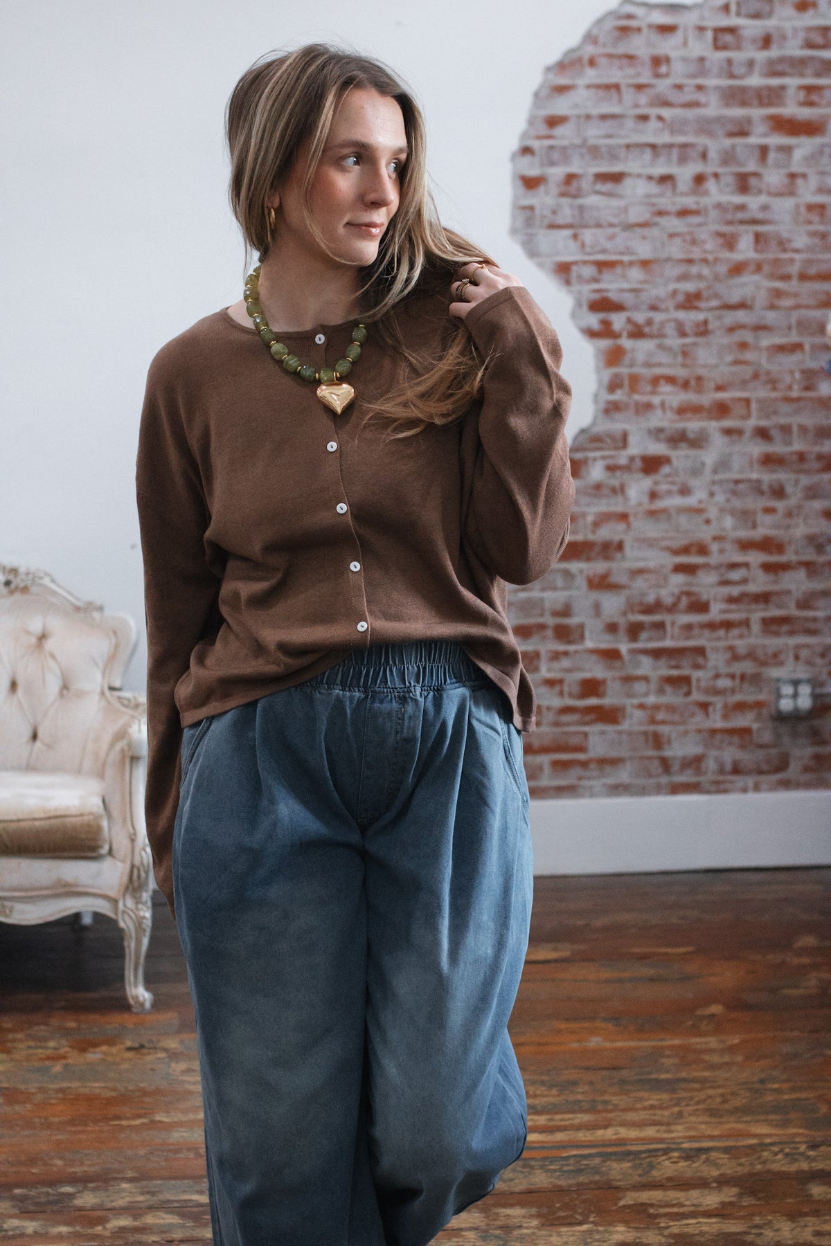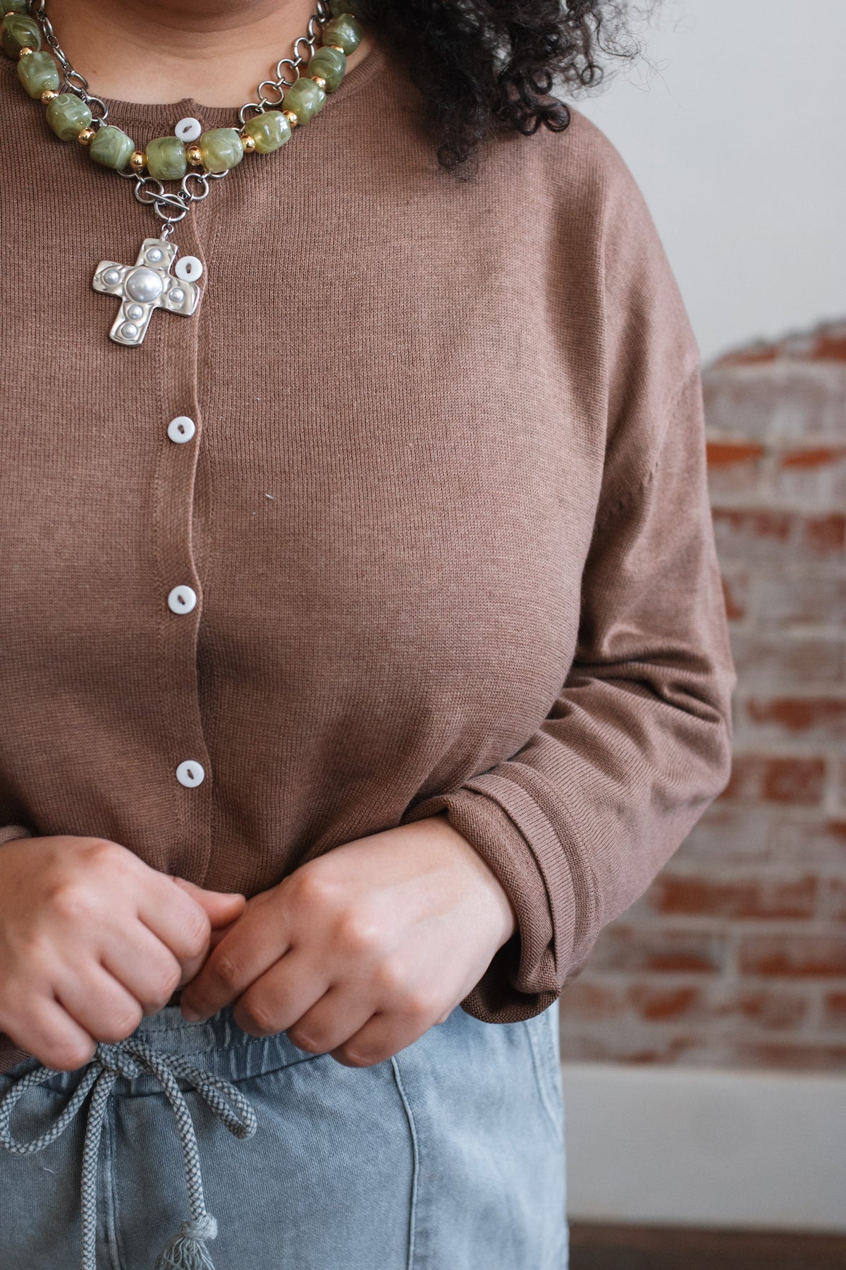 Looking for a cardigan that layers like a dream without feeling bulky? The Anneliese Lightweight Knit Cardigan is your go-to. Spun in a soft cocoa brown, this button-front layer drapes easily over dresses, tanks, or tees, thanks to its lightweight knit and relaxed silhouette. With a slightly oversized fit and dainty contrast buttons, it balances cozy ease with a refined feel. Wear it buttoned up or left open - it’s endlessly versatile and surprisingly polished.