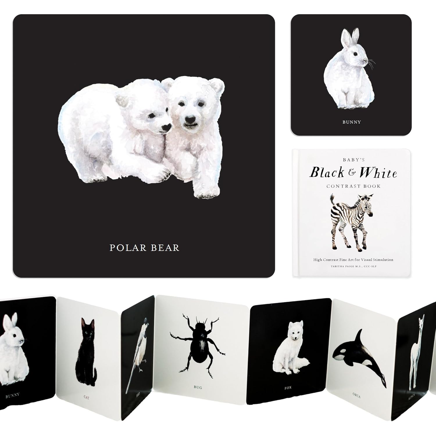 Infants have limited capabilities with vision upon birth and respond well to high-contrast images, which is why this black-and-white contrast book is perfect for their young and growing minds. This beautiful accordion-style board book provides developmentally appropriate visual stimuli for your baby’s visual development, while exposing them to life-like imagery that can grow with them and expand their vocabulary. Each animal painting was designed by Tabitha Paige, artist, speech pathologist, and author of the best-selling series Our Little Adventures.