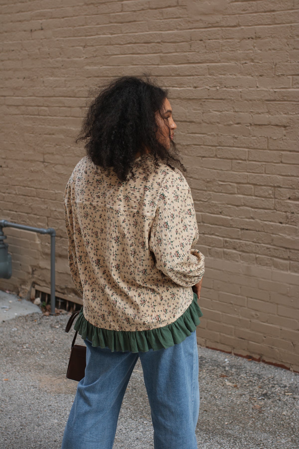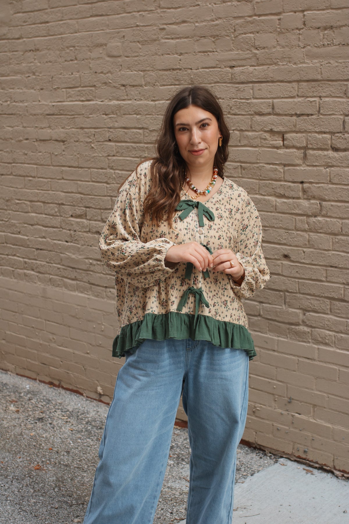 Meet the Clara Ruffle Tie Blouse, a romantic and cozy piece made for winter days and festive nights. With its soft floral print, sweet tie-front detail, and deep green ruffled hem, this blouse feels like vintage charm wrapped in modern ease. The flowy silhouette and relaxed fit make it effortlessly wearable from day to night.