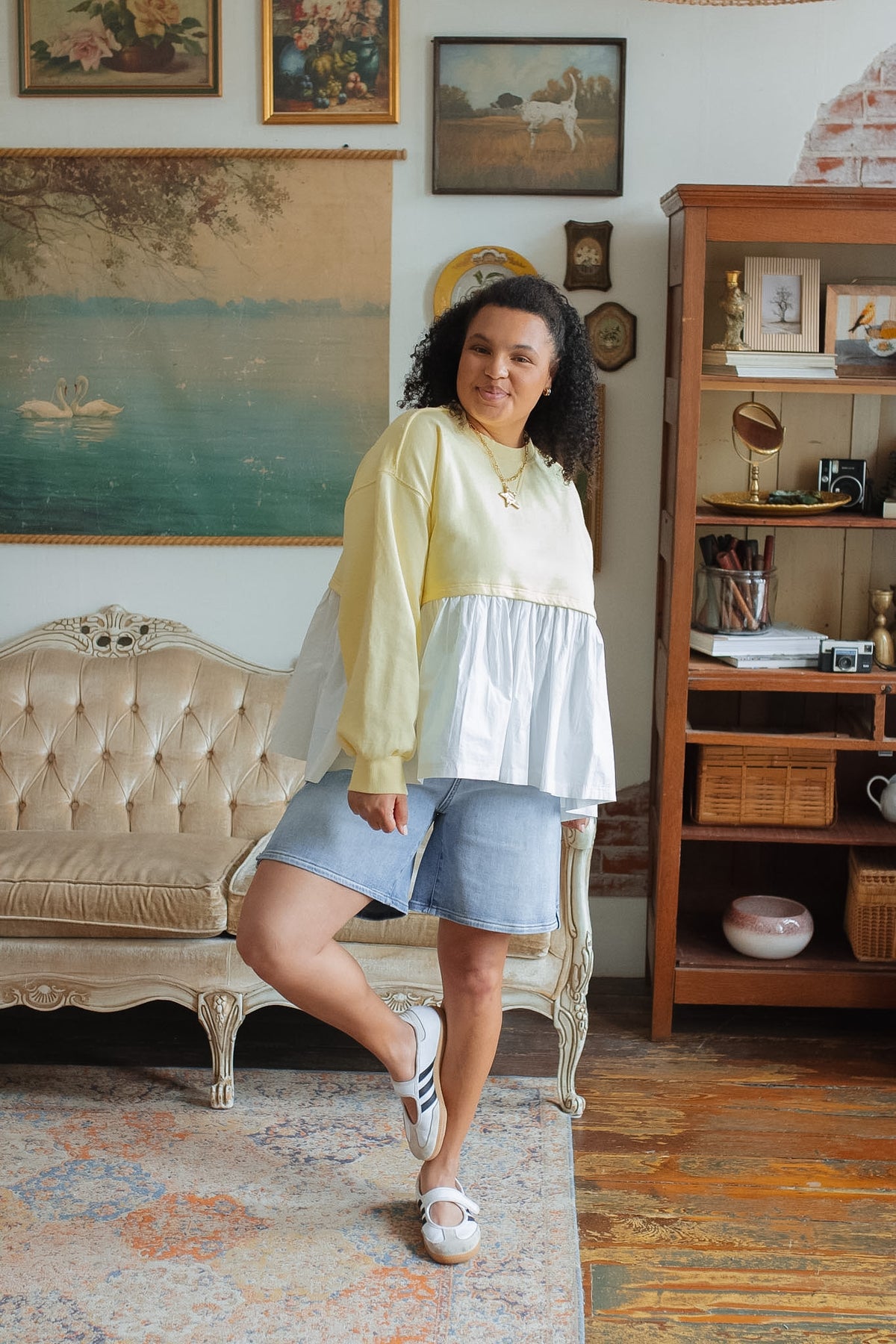 The kind of sweatshirt that makes your everyday outfits feel a little more fun. The Eleanor Layered Sweatshirt takes a classic, cozy pullover and gives it a fresh twist with a contrast poplin hem, easy, playful, and just elevated enough to stand out. It’s soft, relaxed, and perfect for throwing on when you still want to look put together.