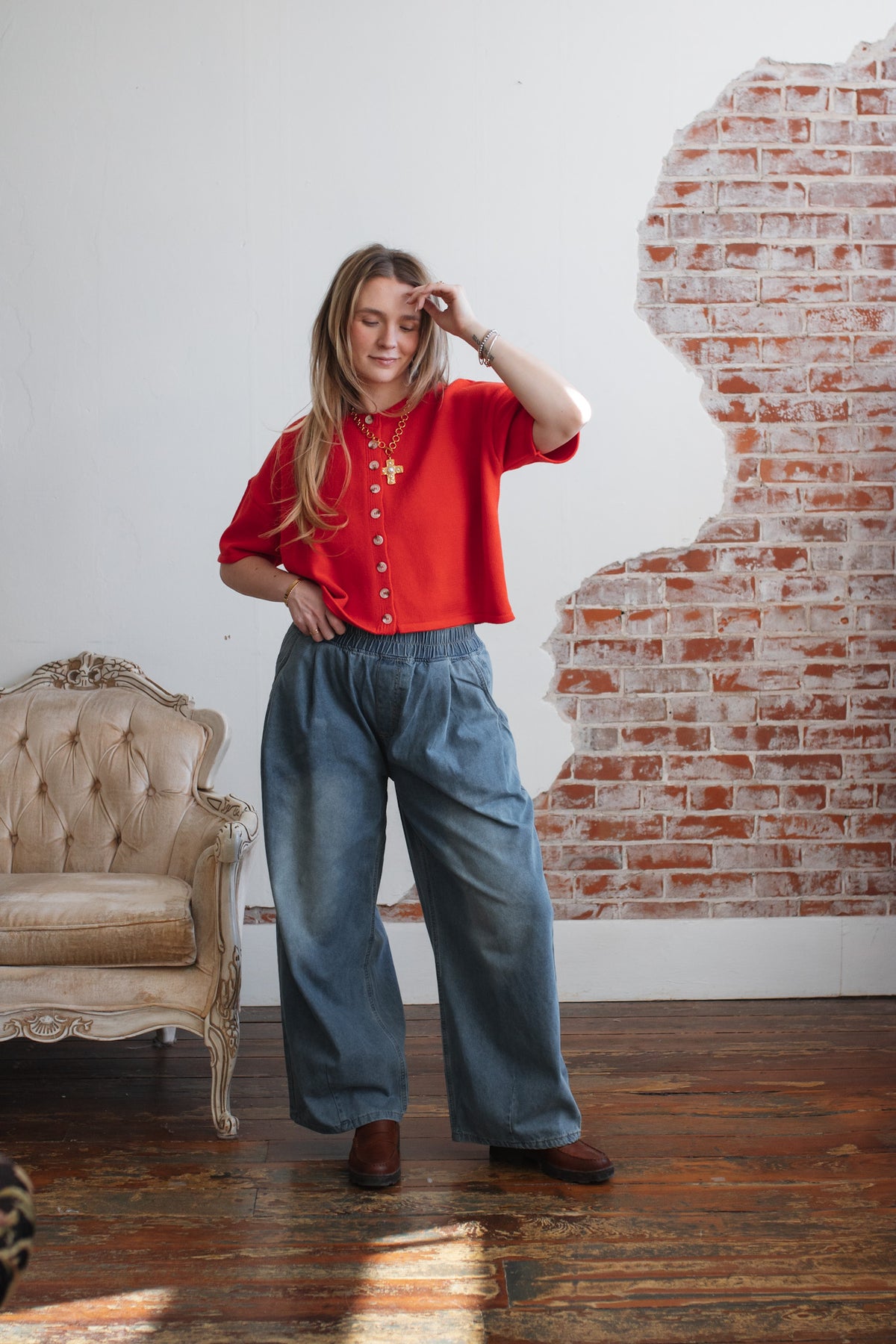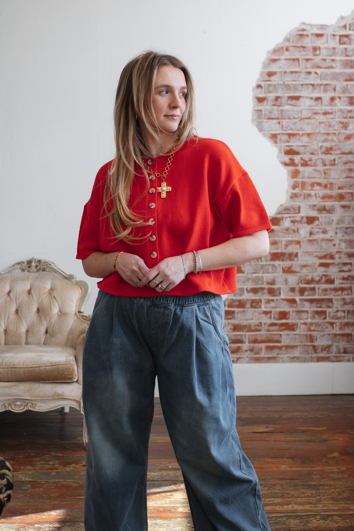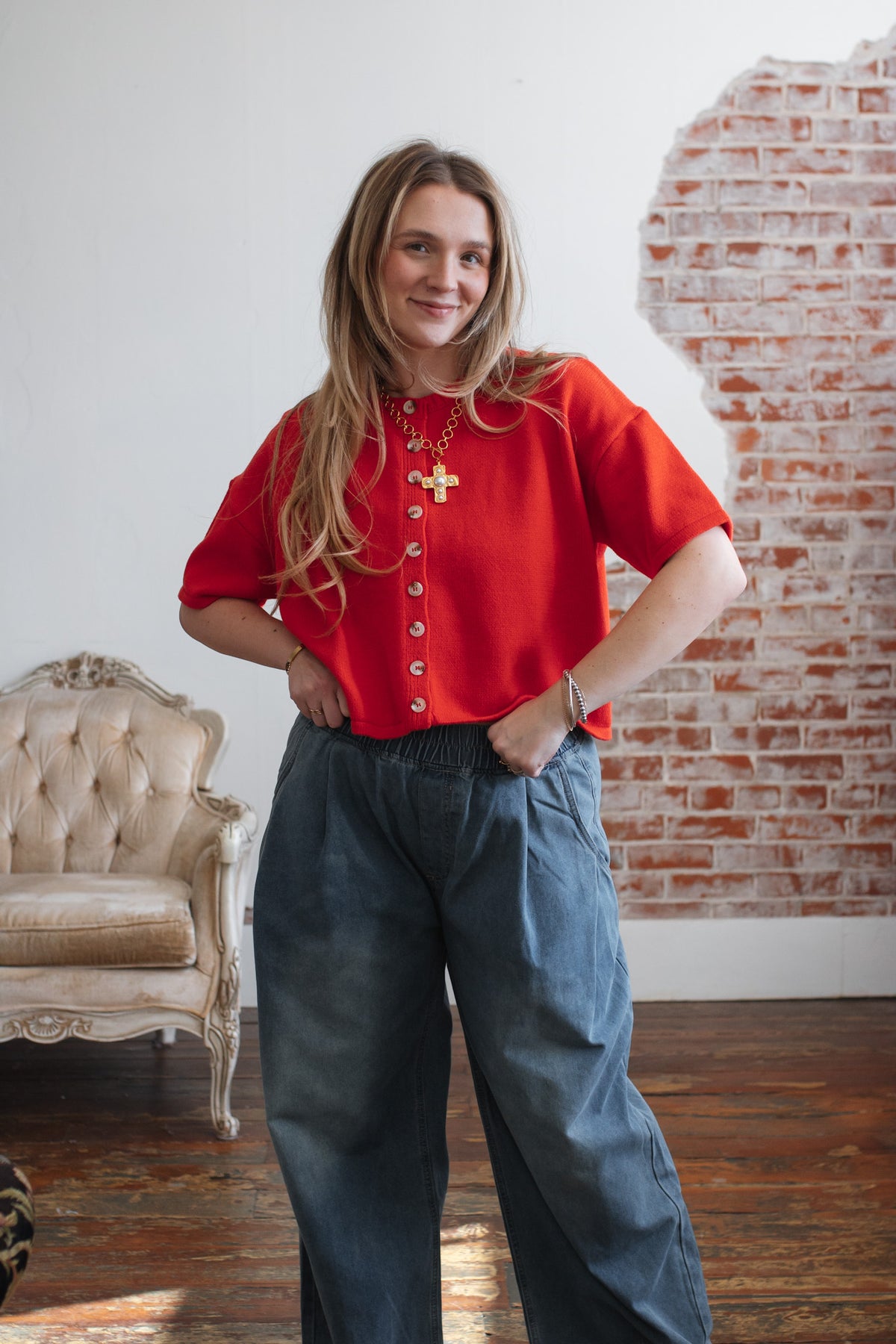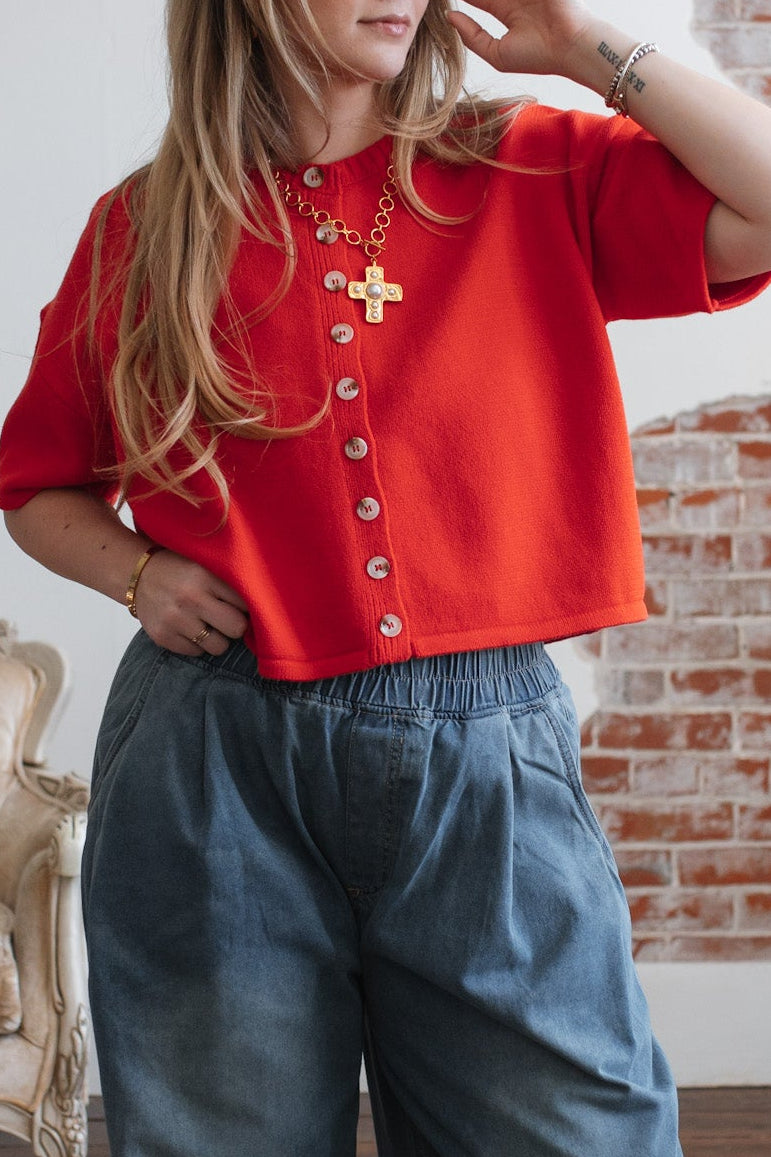Looking for a bold layer that’s equal parts cozy and standout? The Elizabeth Knit Short Sleeve Cardigan brings a fresh twist to classic knitwear with its cropped silhouette, loose shape, and stunning poppy hue. Wooden buttons add just the right touch of texture, while the short sleeves make it ideal for transitional dressing. Wear it solo as a top or layered open over a dress - this cardigan is your wardrobe’s new pop of personality.