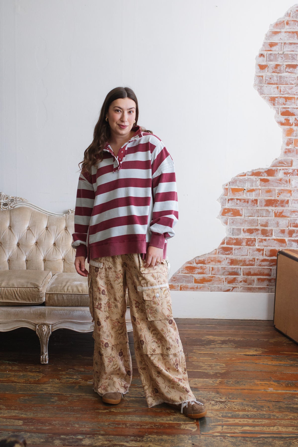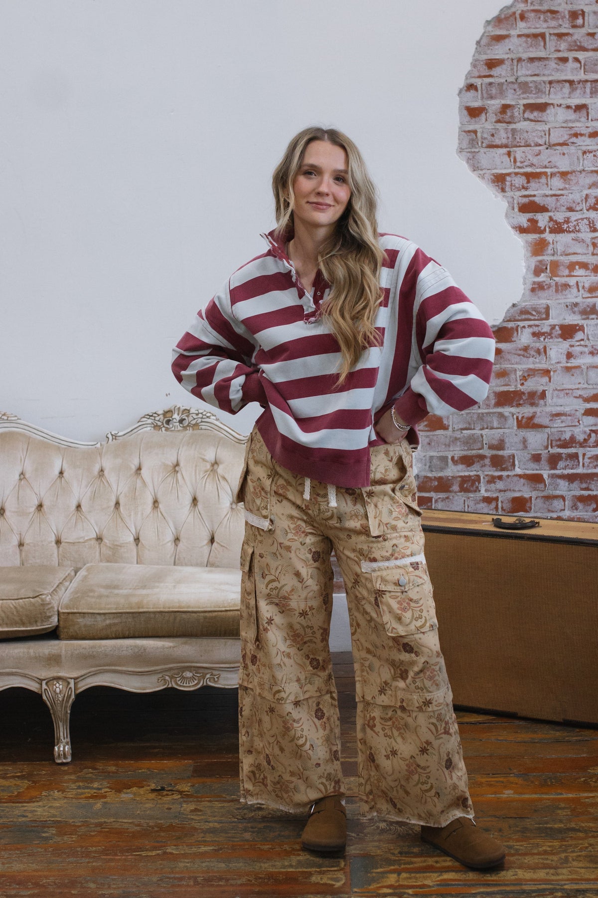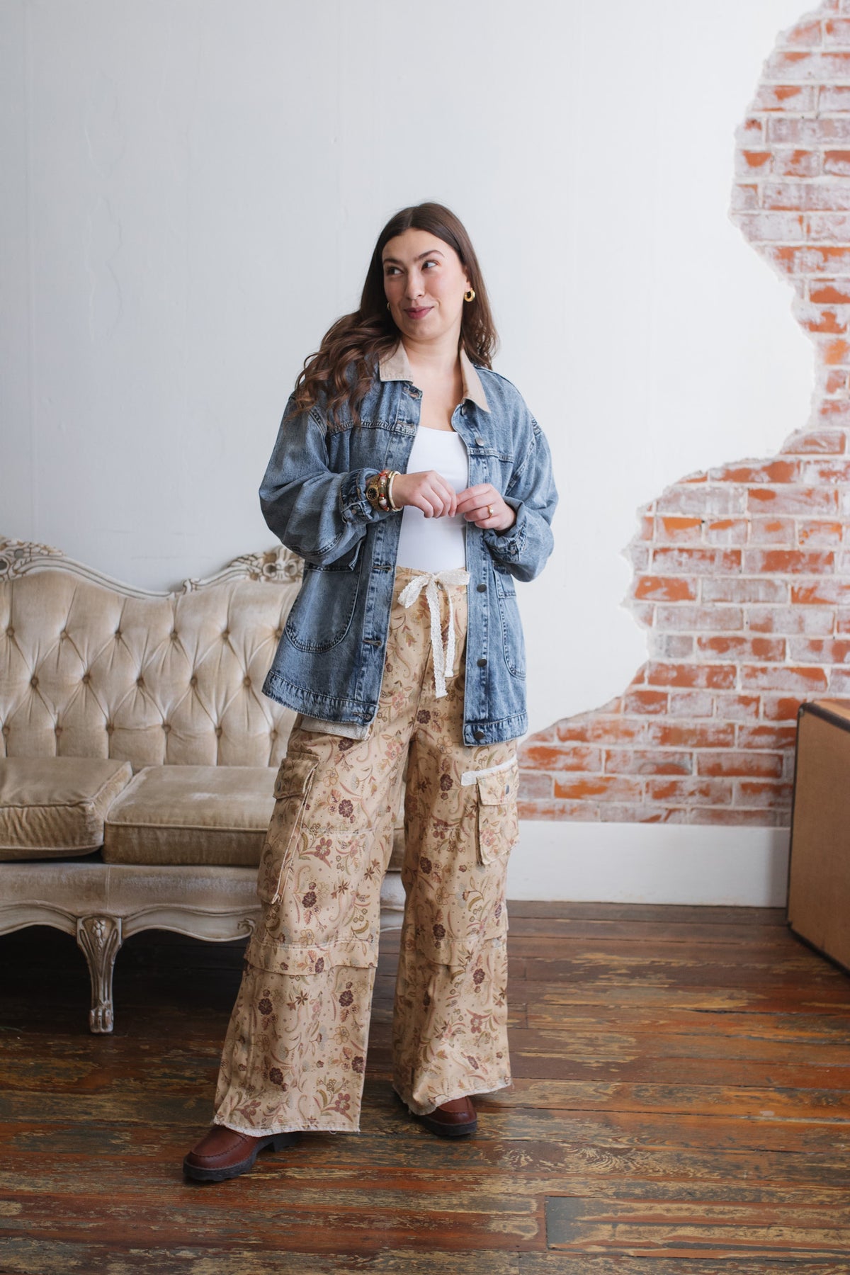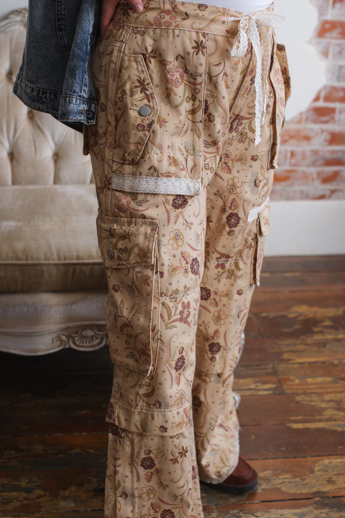 Looking for cargos with a softer side? The Emery Floral Cargo Pants blend utility and charm with their vintage-inspired floral print, roomy silhouette, and sweet lace trim. Designed with a relaxed, wide-leg cut and plenty of functional pockets, these pants are made for lounging, exploring, or layering up in laid-back style. The drawstring waist adds an extra touch of comfort, while the allover pattern keeps things playful yet grounded.