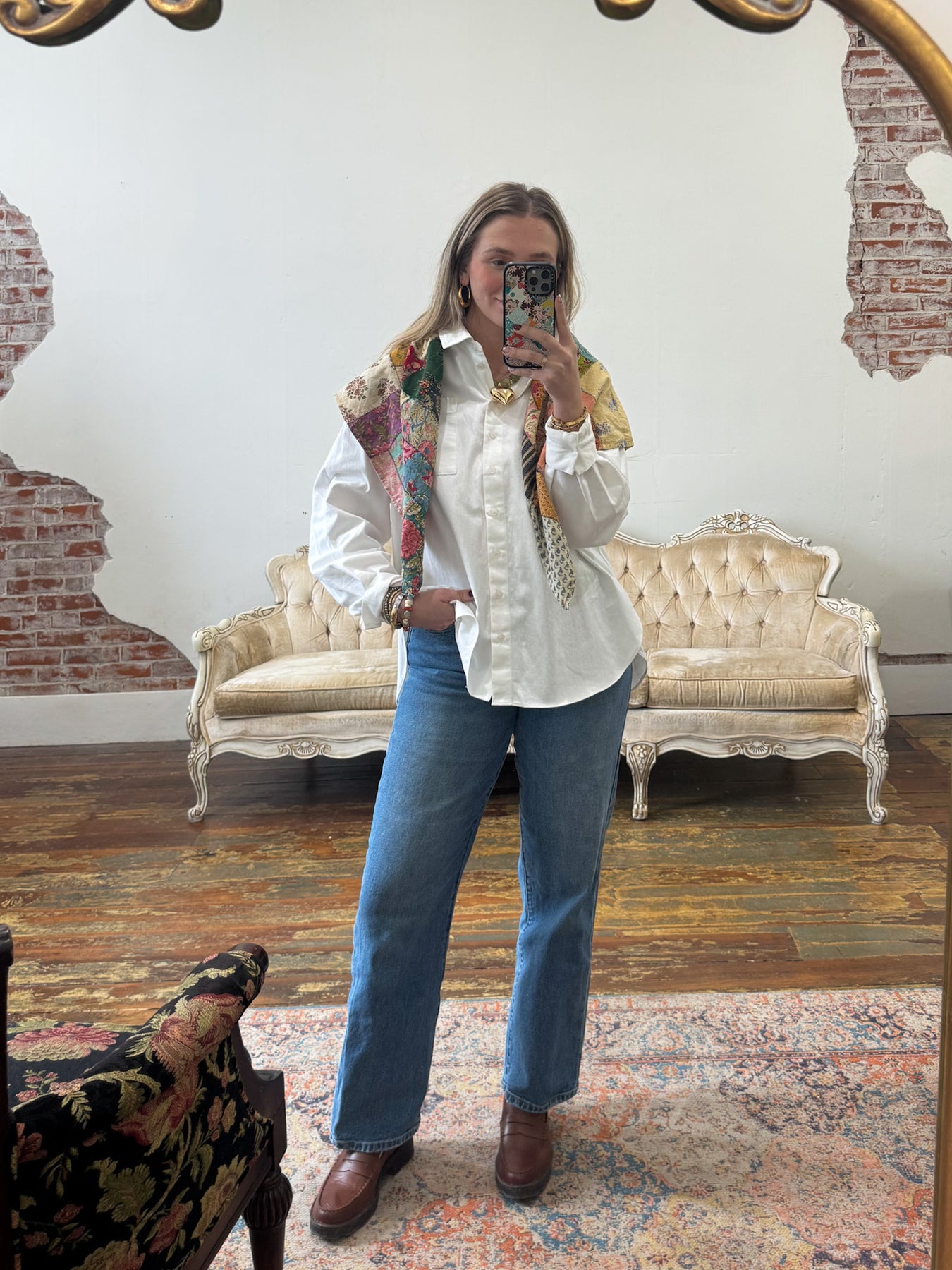 Each oversized scarf is made from a curated blend of vintage-inspired prints in the same rich, eclectic colorway, so no two are exactly alike (but they all play beautifully together). Lightweight with a silky-soft drape, this piece brings storytelling and slow fashion into every fold.