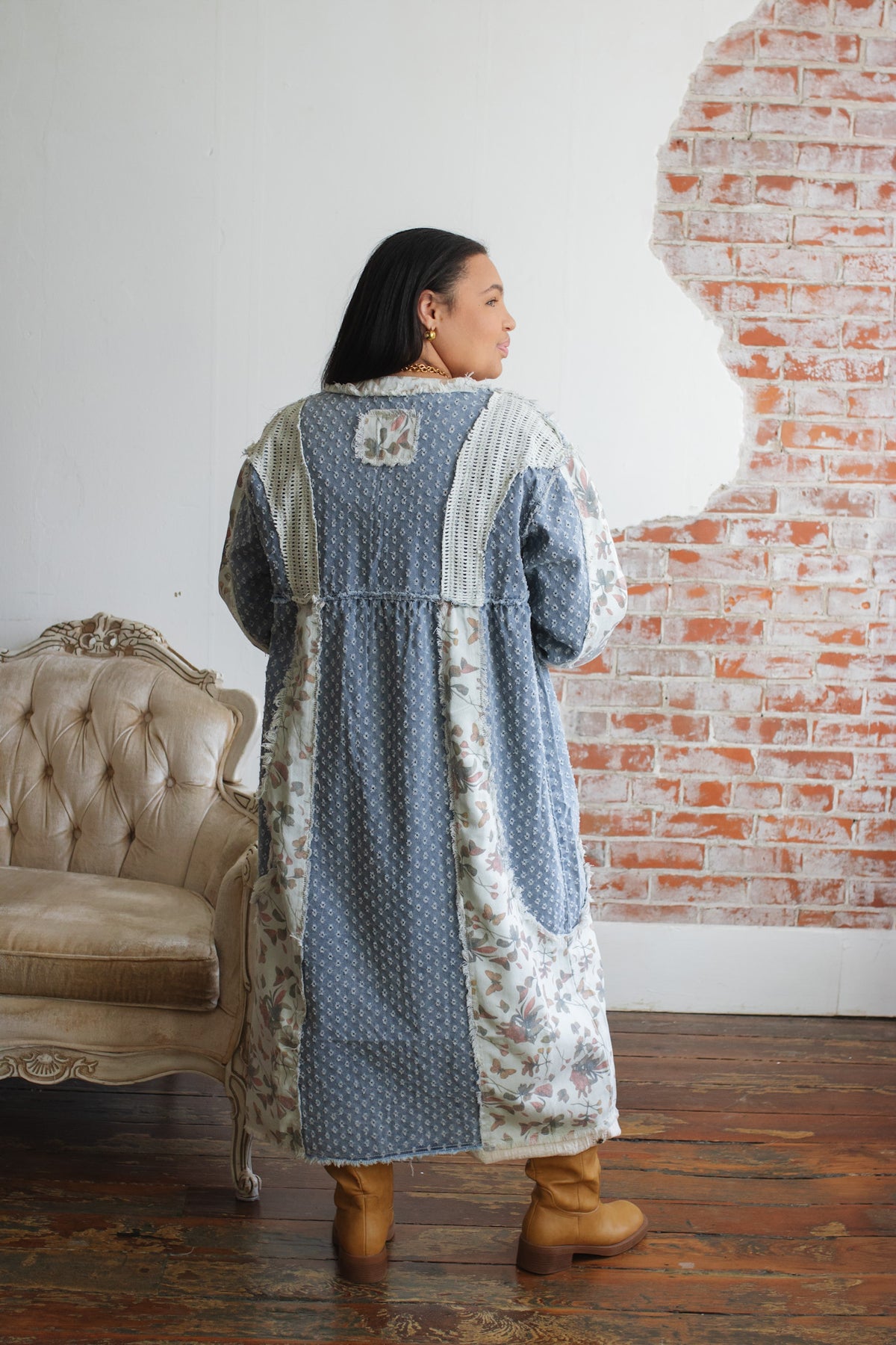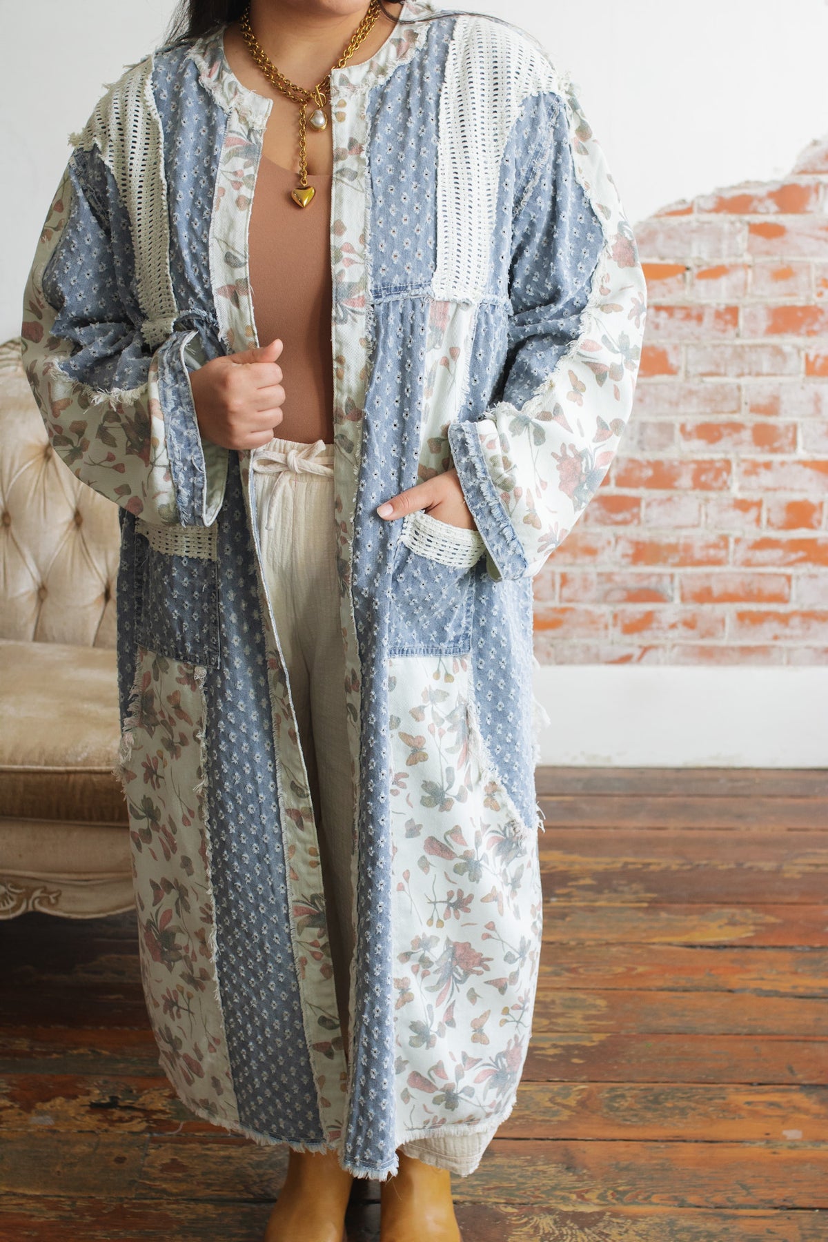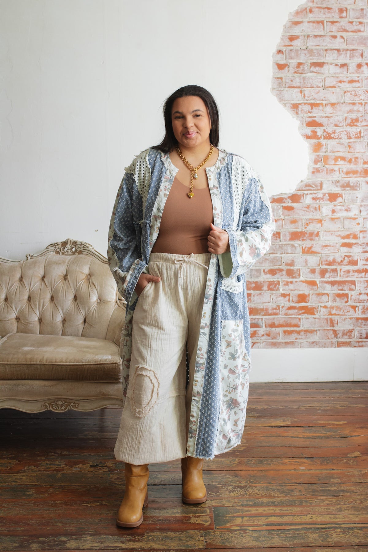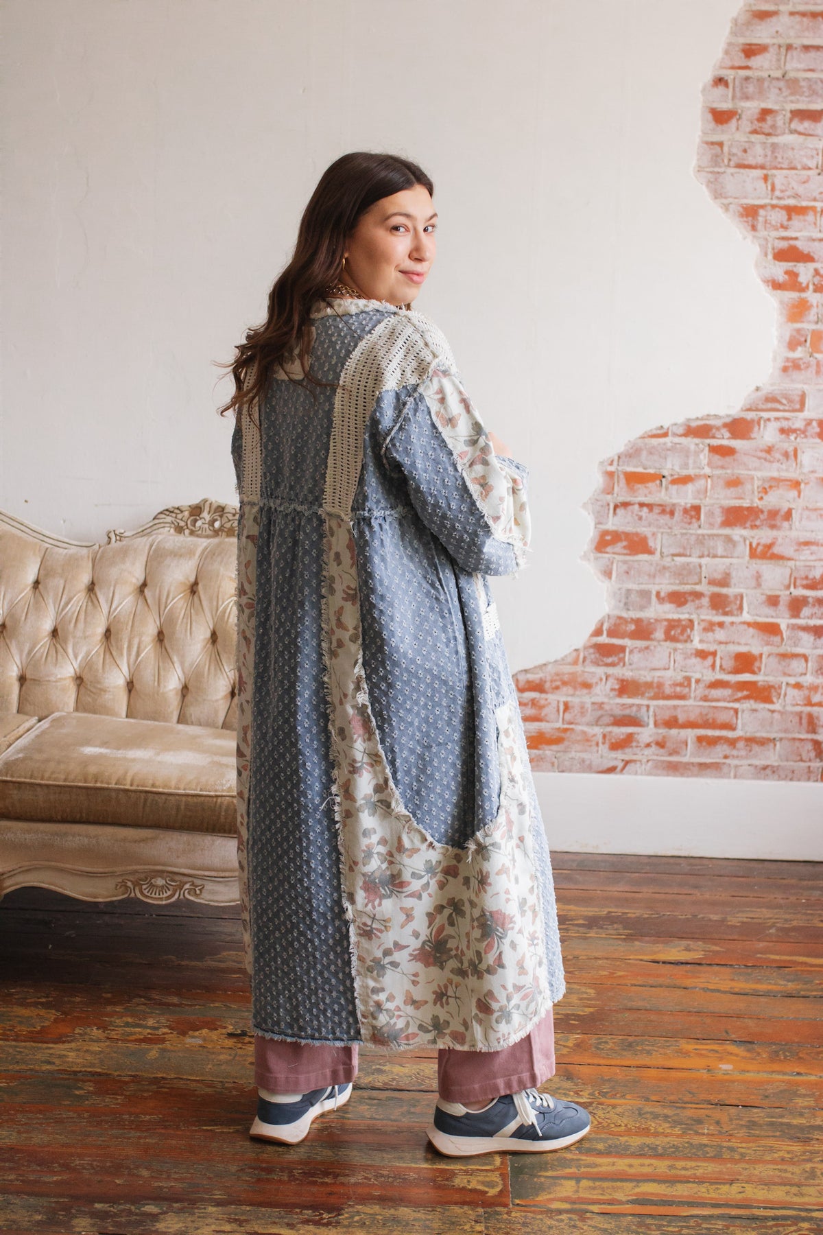 Looking for a statement layer that feels like it’s lived a few beautiful lives already? The Hollis Textured Denim Duster is the patchwork dream your closet’s been waiting for. Made from soft cotton with slubby, hole-punched texture, floral panels, raw edges, and crochet lace accents, it brings together all the magic of a found-vintage treasure with the ease of modern layering.