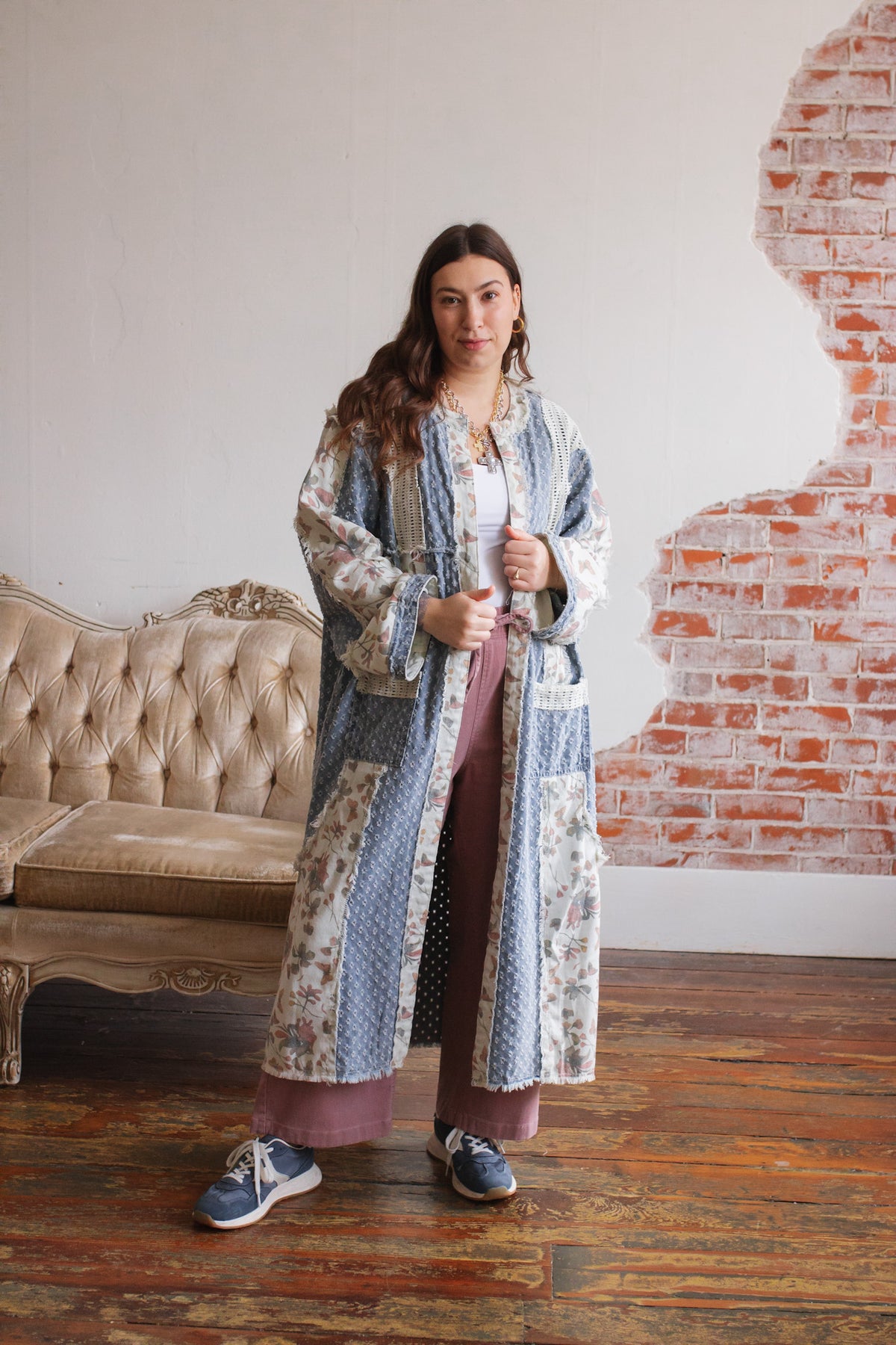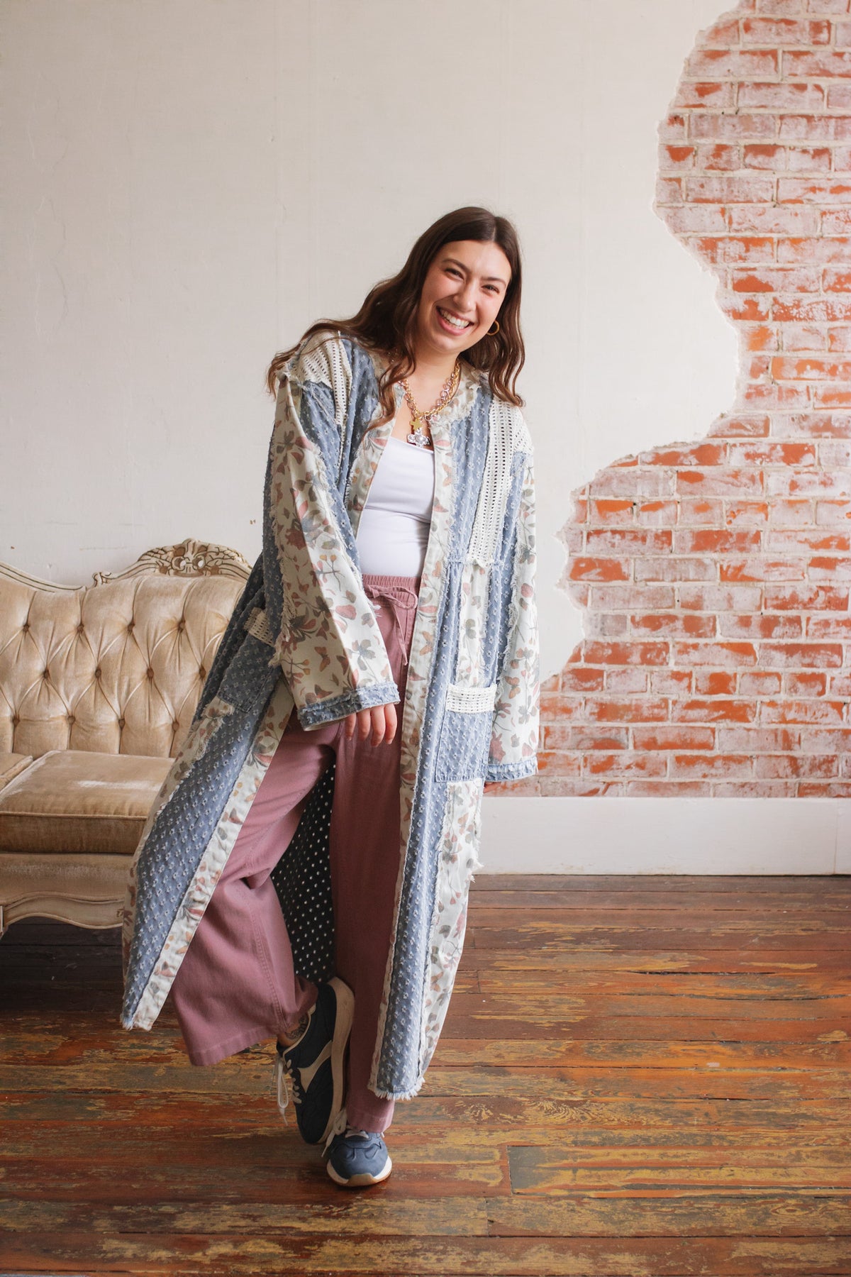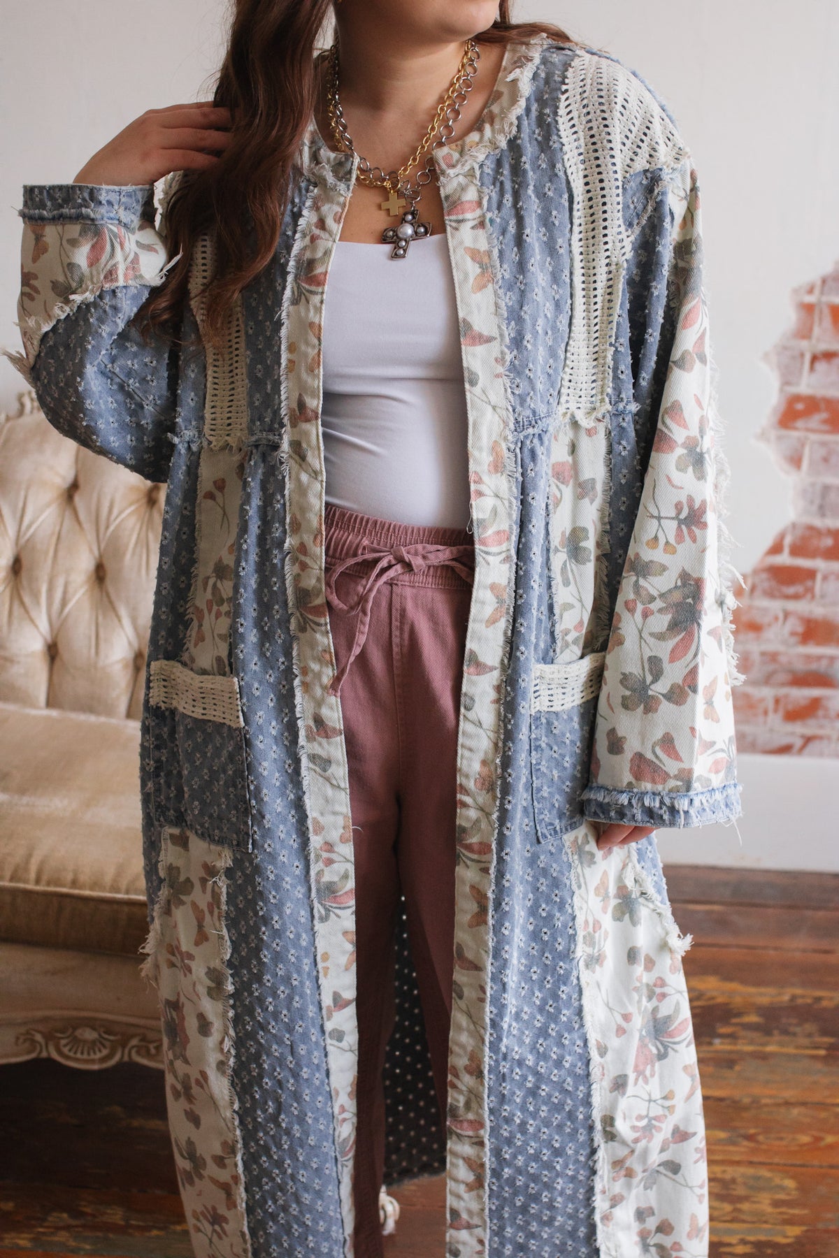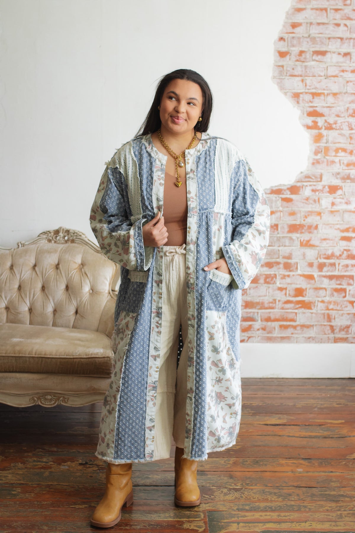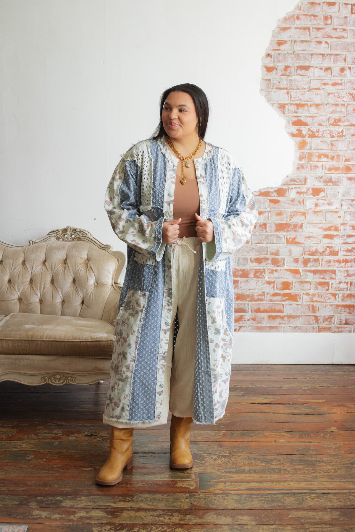 Looking for a statement layer that feels like it’s lived a few beautiful lives already? The Hollis Textured Denim Duster is the patchwork dream your closet’s been waiting for. Made from soft cotton with slubby, hole-punched texture, floral panels, raw edges, and crochet lace accents, it brings together all the magic of a found-vintage treasure with the ease of modern layering.