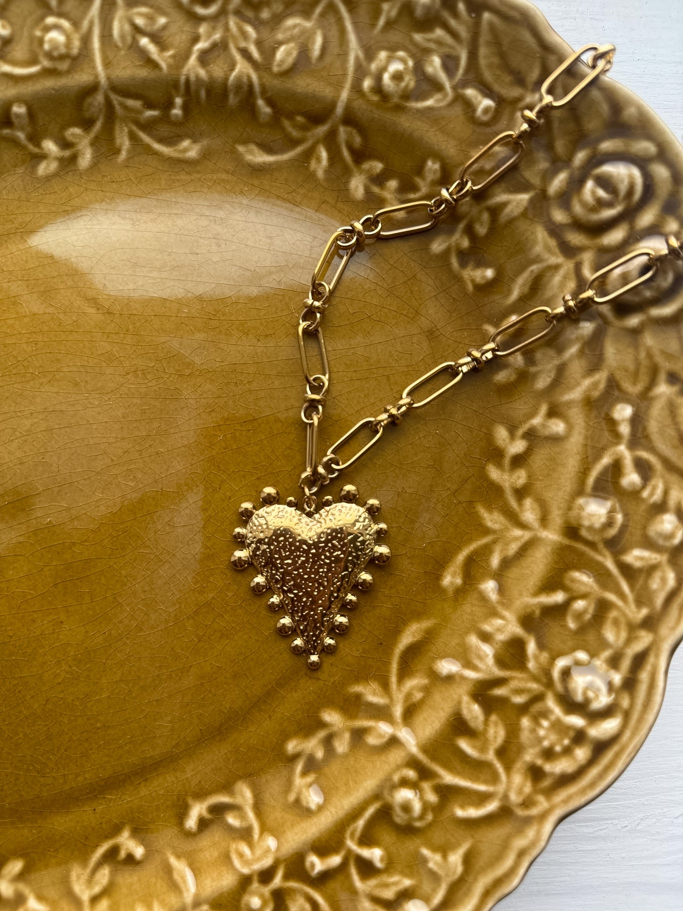 The Lainey Chunky Heart Necklace features a bold, textured heart pendant suspended from a chunky gold chain for a statement-making look. With its sculptural design and high-shine finish, this gold heart pendant necklace adds a playful yet elevated touch to any outfit. Designed to stand out while still feeling wearable, it’s the perfect piece to dress up everyday looks or layer with your favorites.