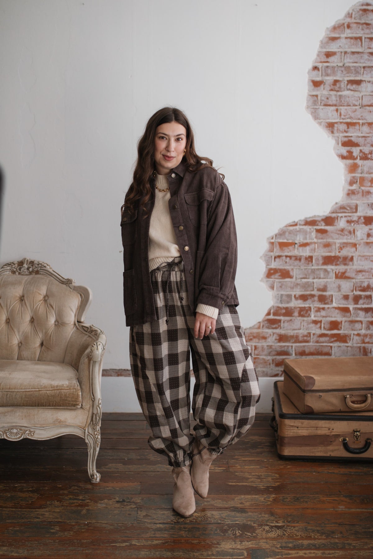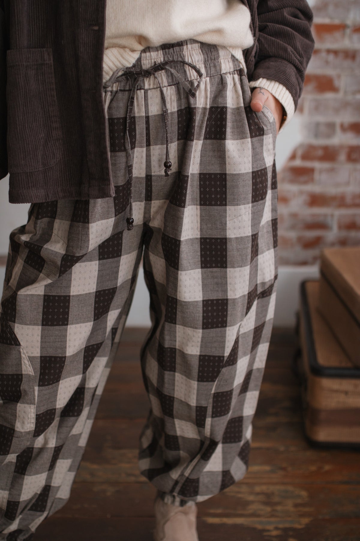 Cozy meets playful in the Marlowe Check Taper Pants, a soft checkered pant with a relaxed, balloon-style silhouette. The elastic waistband with adjustable tie ensures comfort, while the gathered cuffs add a charming touch. Perfect for lounging or styling up for casual winter days.