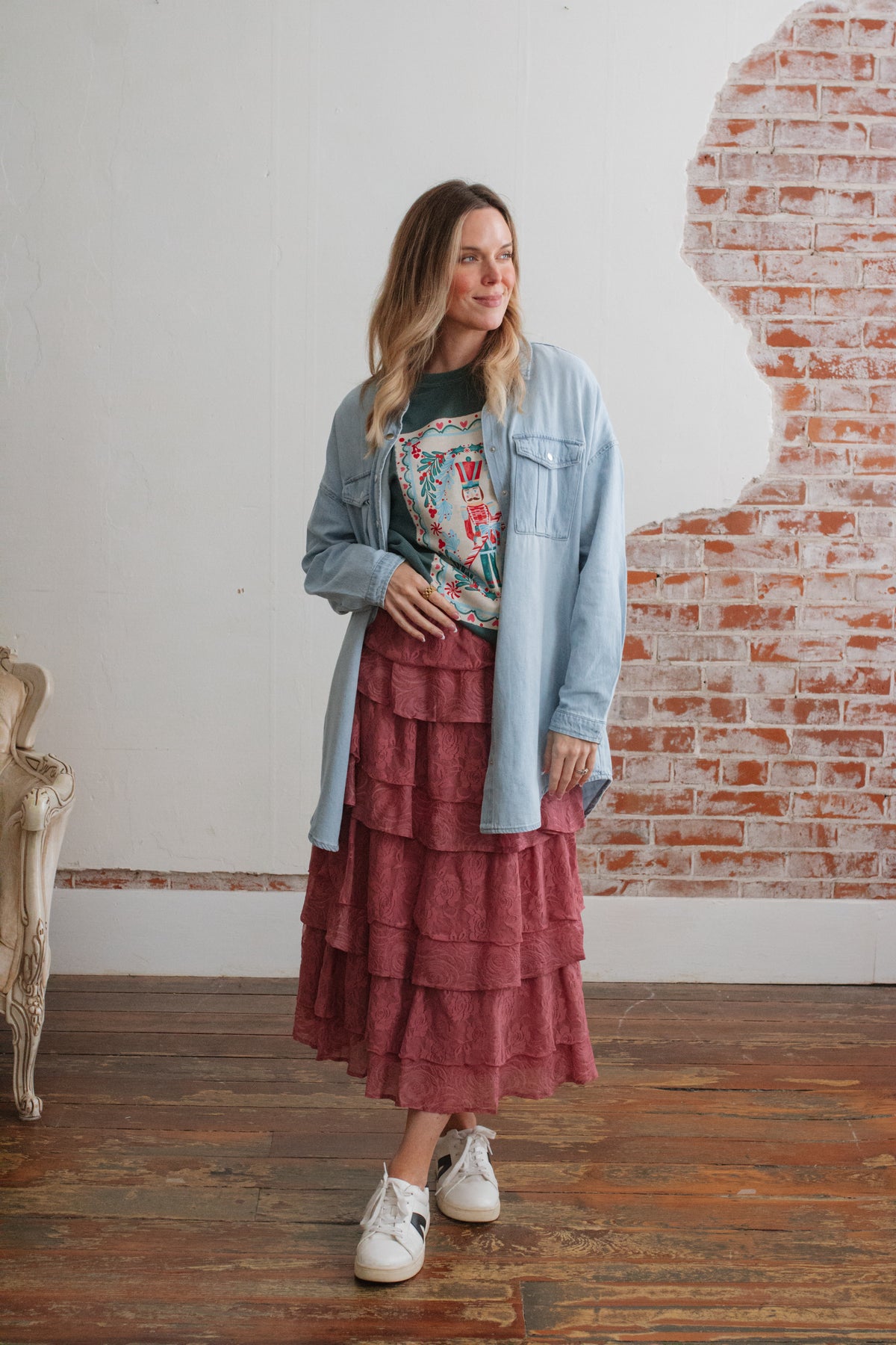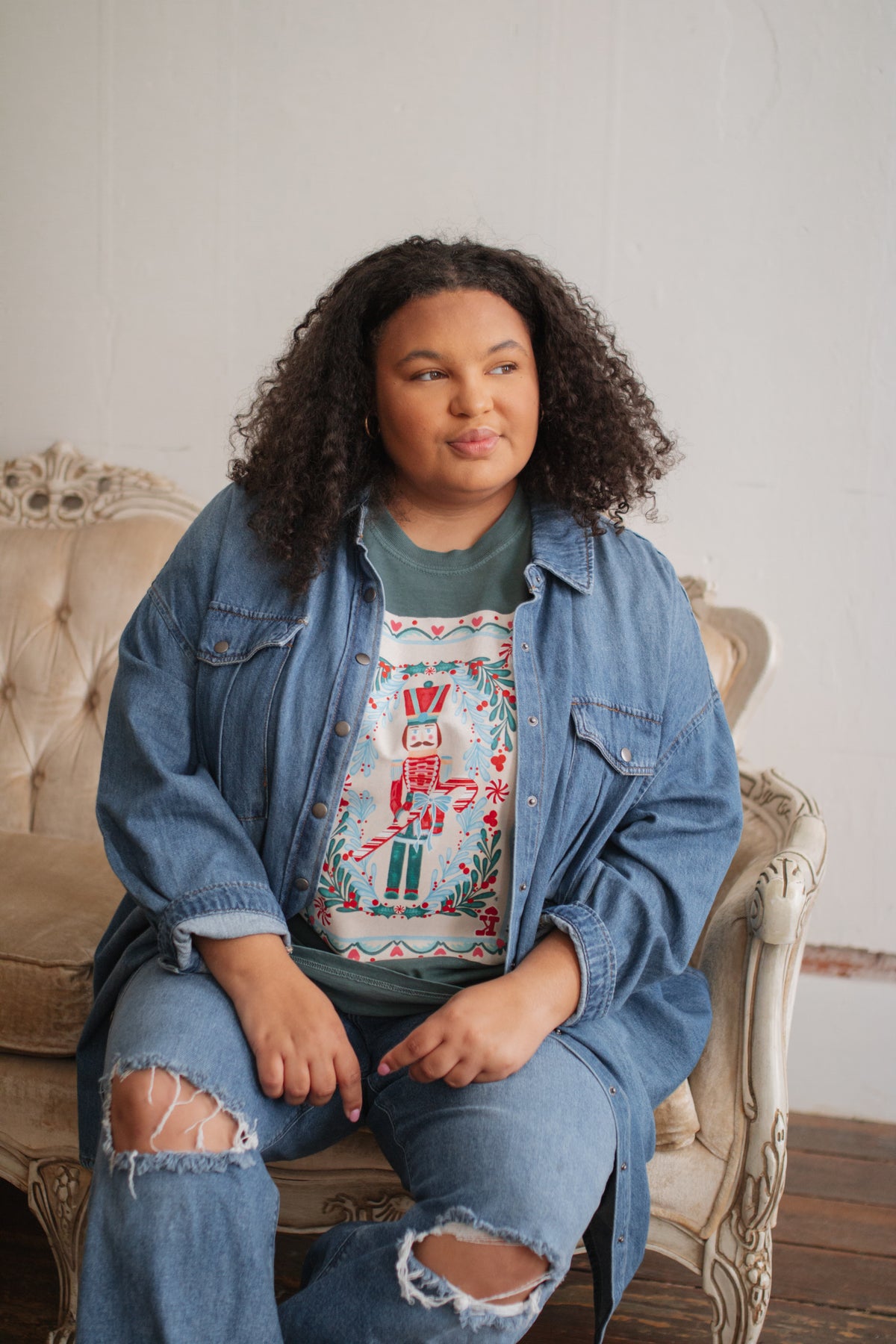 For a more oversized fit Megan is wearing a size M, Dala is wearing a size L, and Ivory is wearing a size 3X.