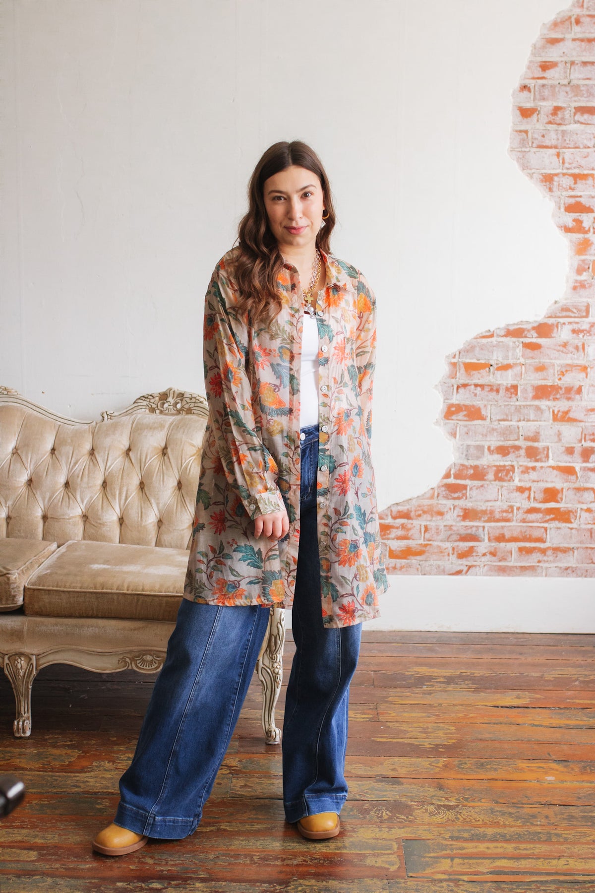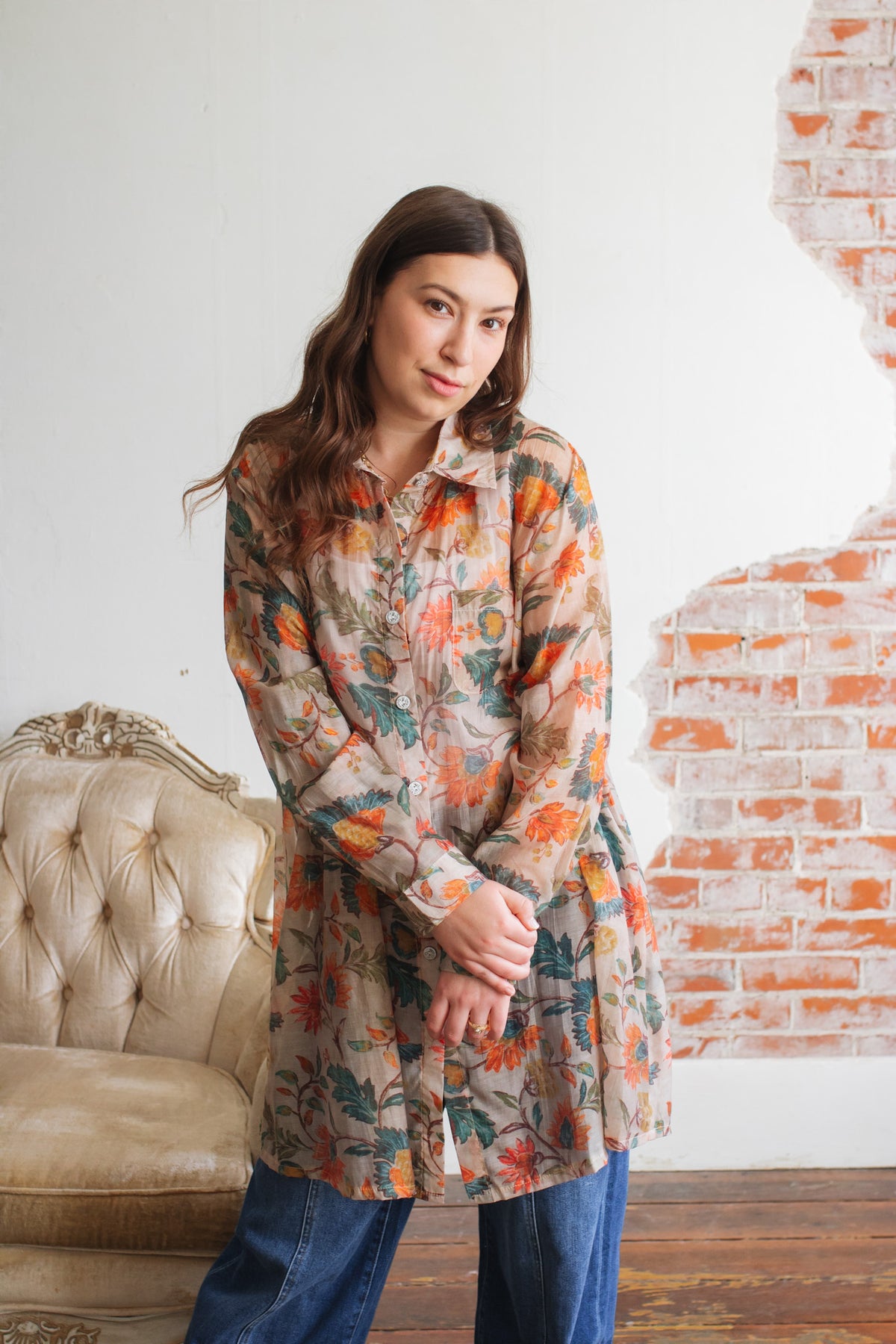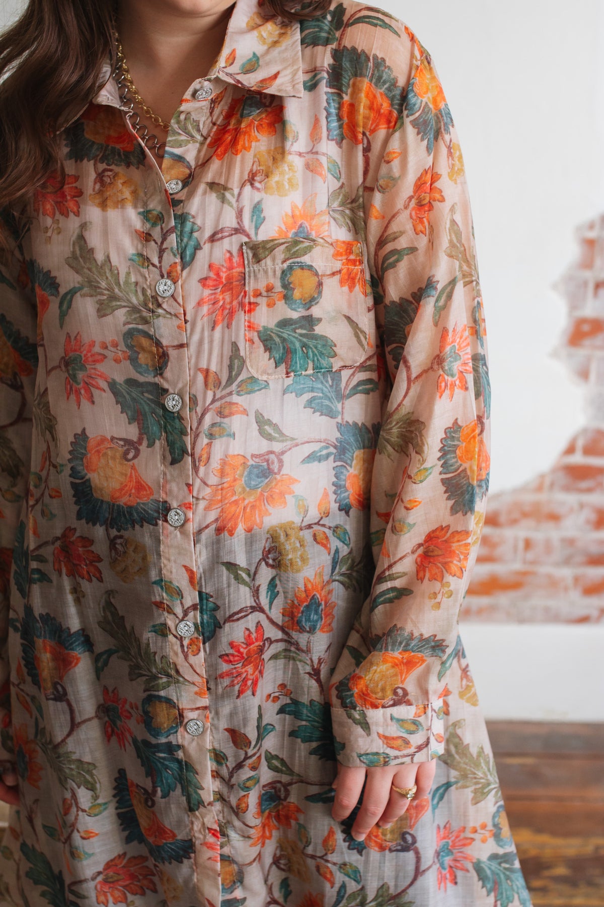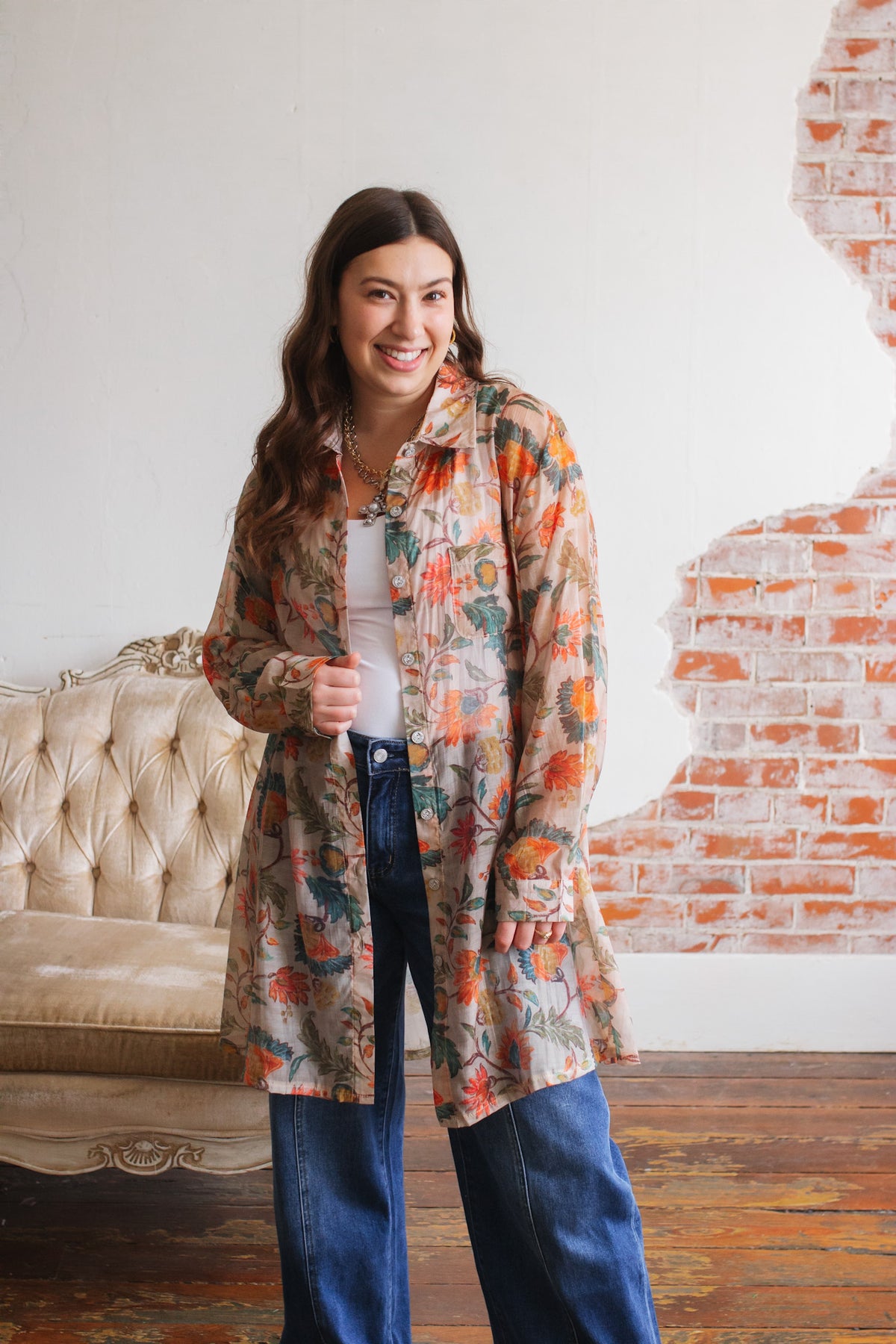 Need a lightweight layer that does a little bit of everything? The Ophelia Sheer Floral Tunic is the definition of versatility. With a romantic autumn-toned floral print and an airy, sheer finish, this piece can be worn buttoned up as a tunic or dress, or left open as a duster or cover-up. It’s an easy, eye-catching staple you’ll reach for season after season.