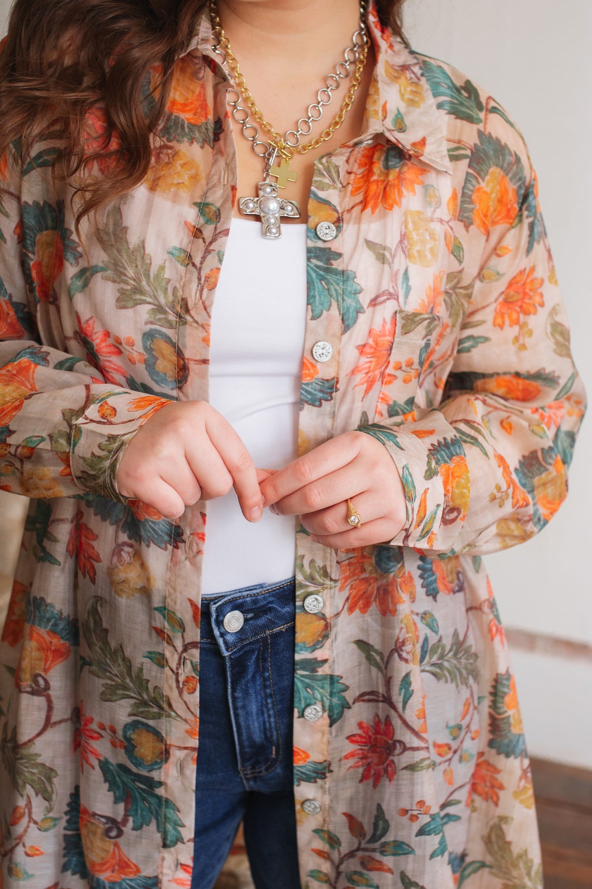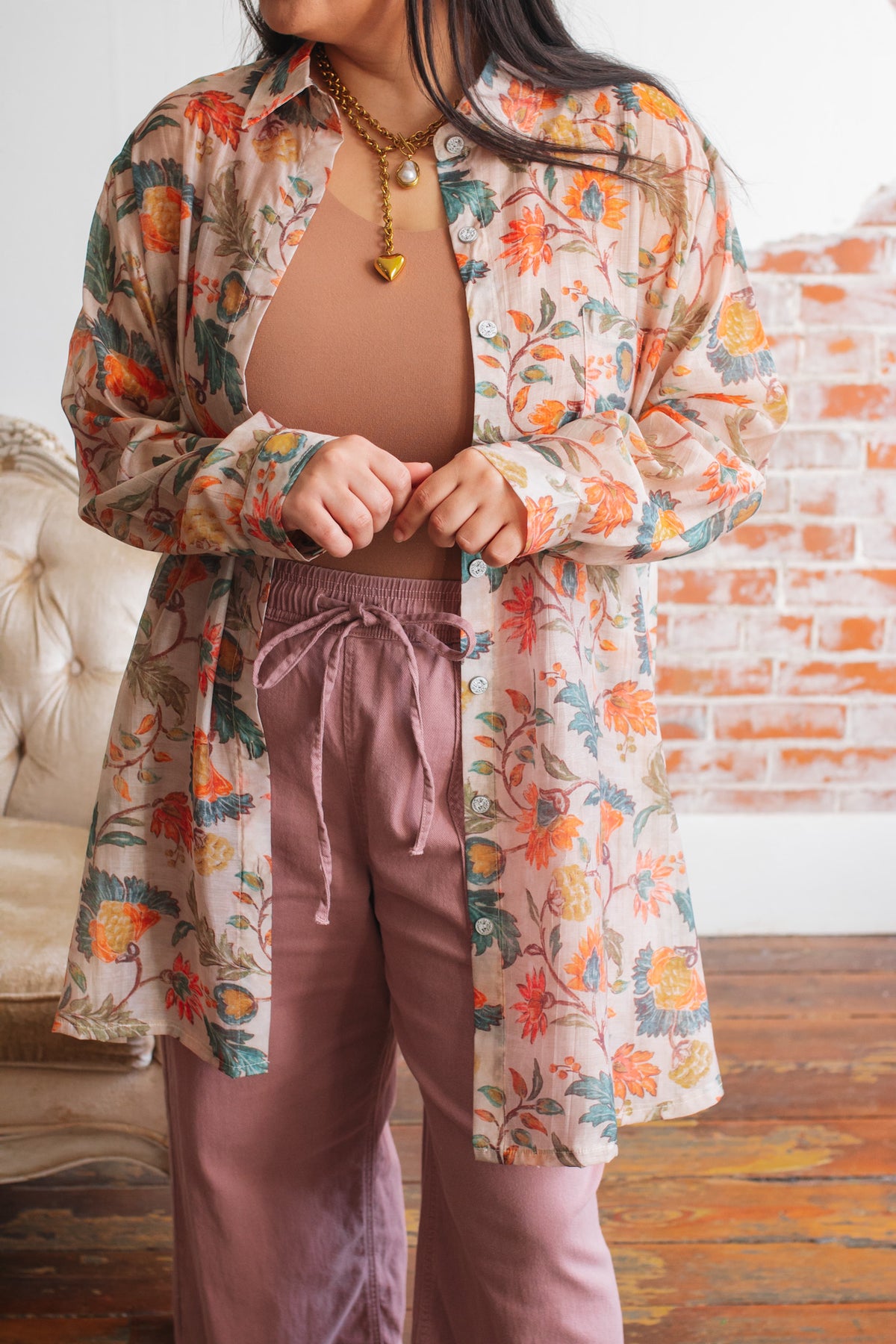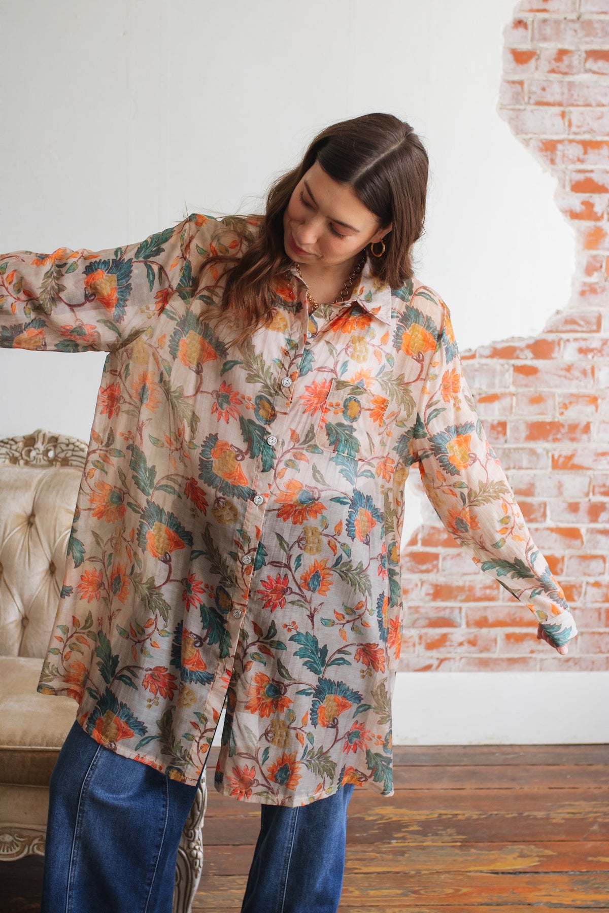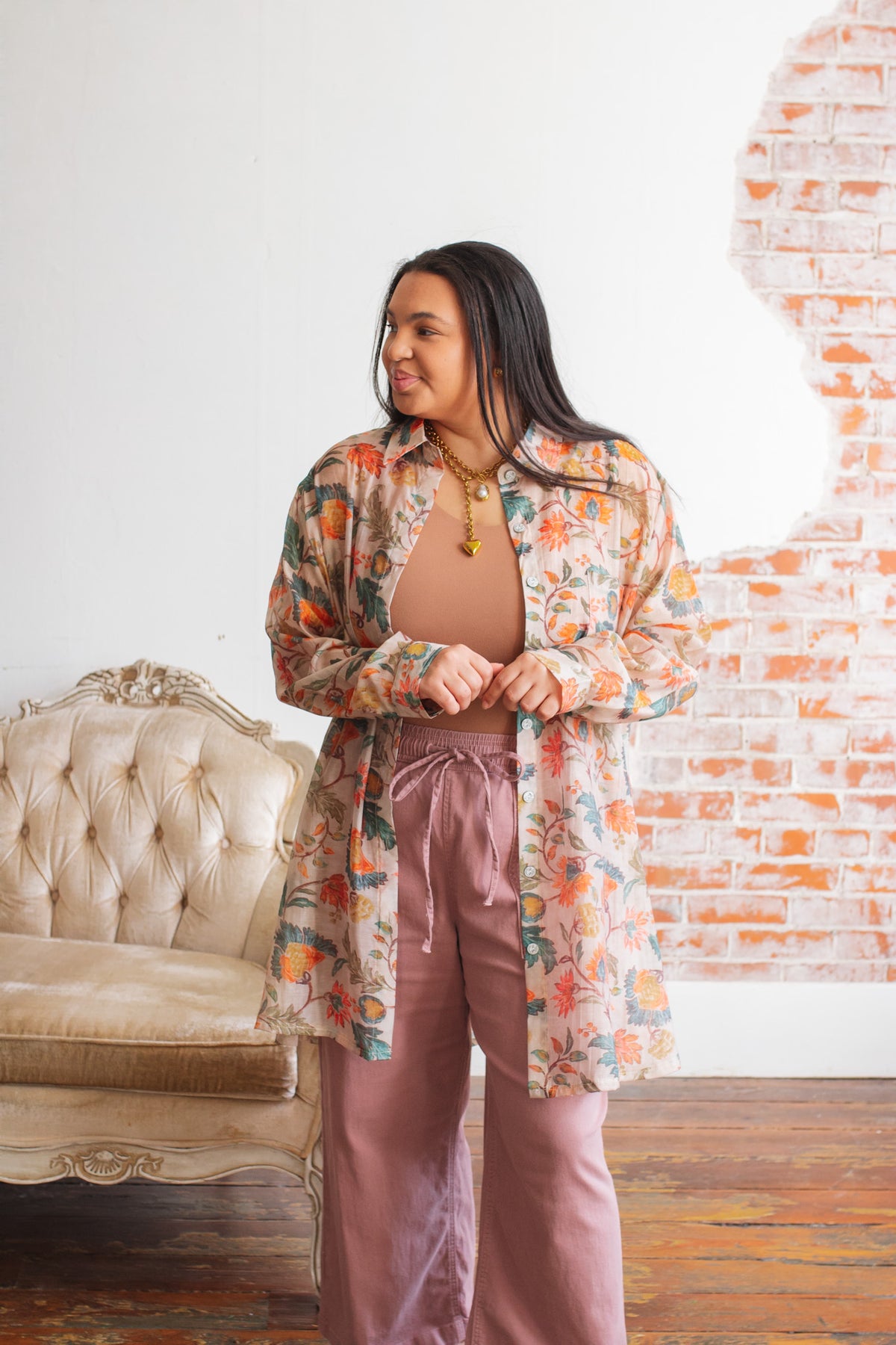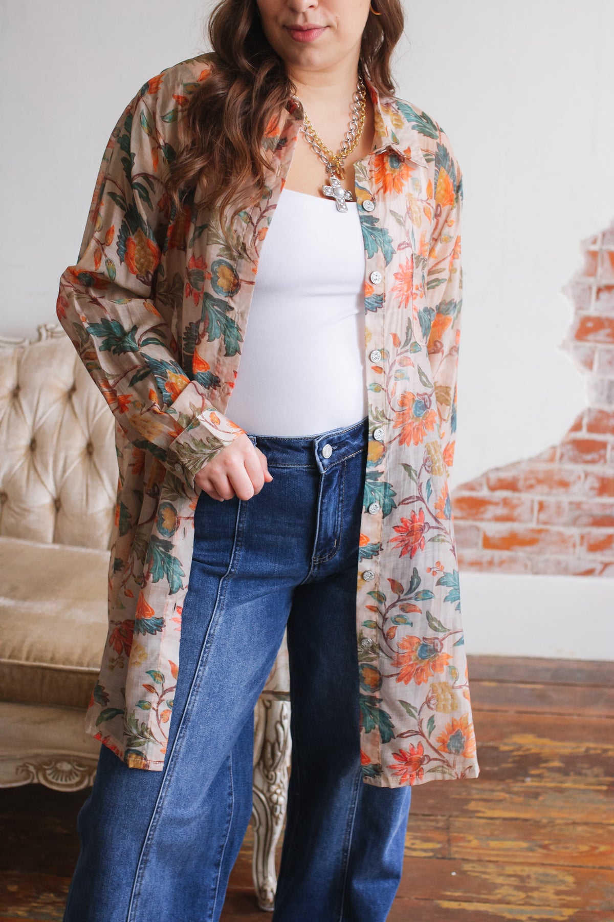 Need a lightweight layer that does a little bit of everything? The Ophelia Sheer Floral Tunic is the definition of versatility. With a romantic autumn-toned floral print and an airy, sheer finish, this piece can be worn buttoned up as a tunic or dress, or left open as a duster or cover-up. It’s an easy, eye-catching staple you’ll reach for season after season.