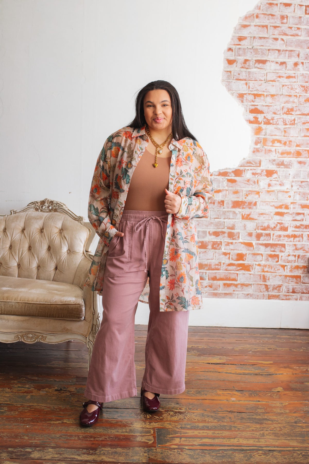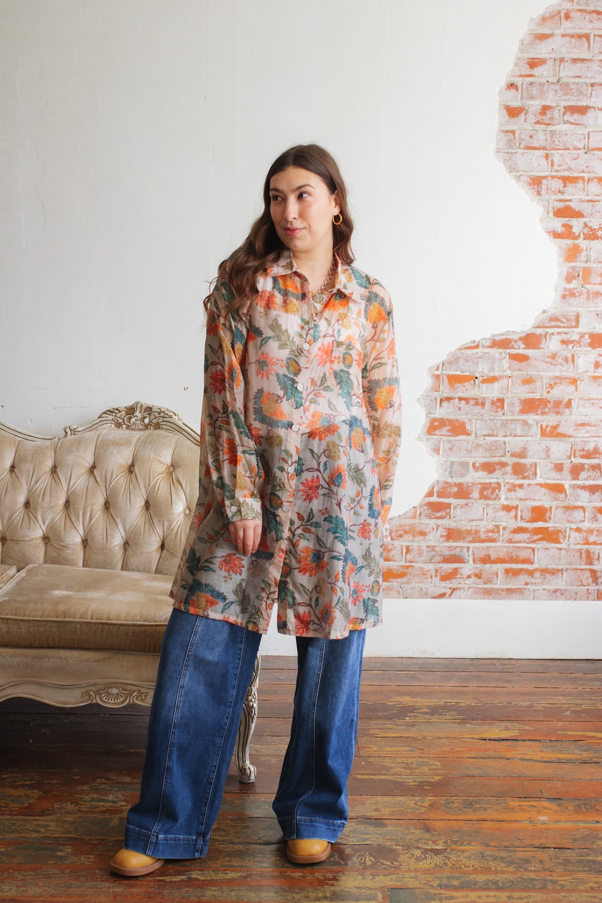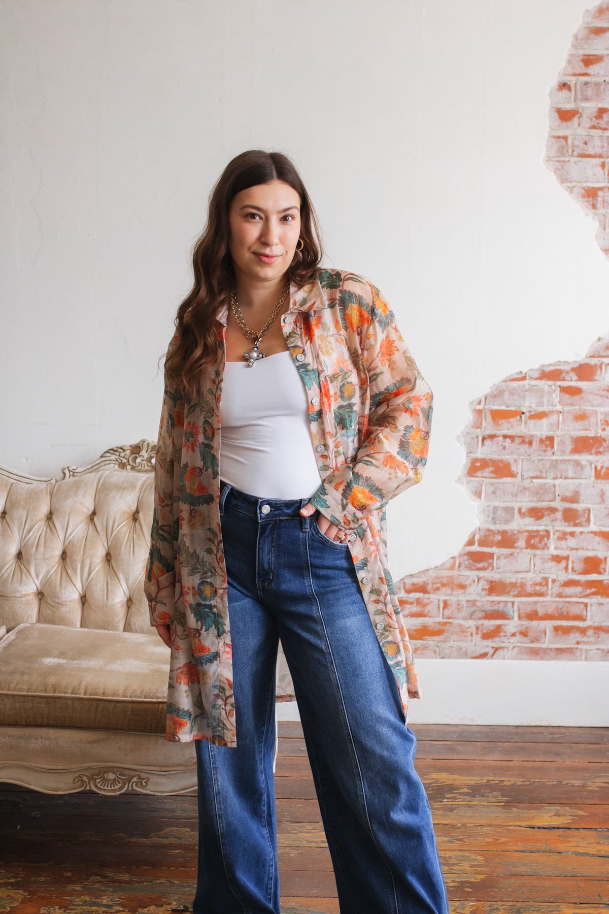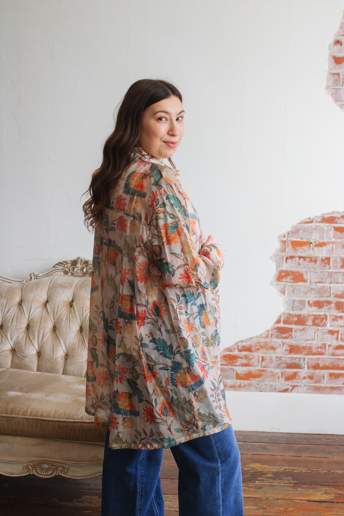 Need a lightweight layer that does a little bit of everything? The Ophelia Sheer Floral Tunic is the definition of versatility. With a romantic autumn-toned floral print and an airy, sheer finish, this piece can be worn buttoned up as a tunic or dress, or left open as a duster or cover-up. It’s an easy, eye-catching staple you’ll reach for season after season.