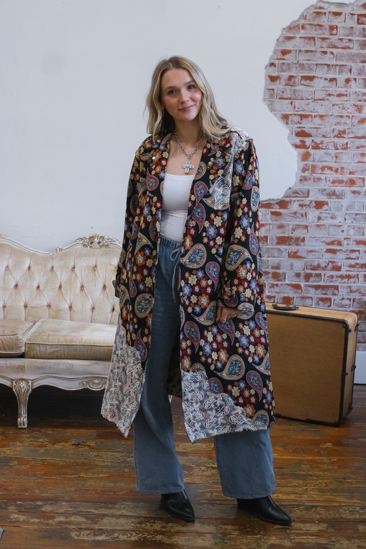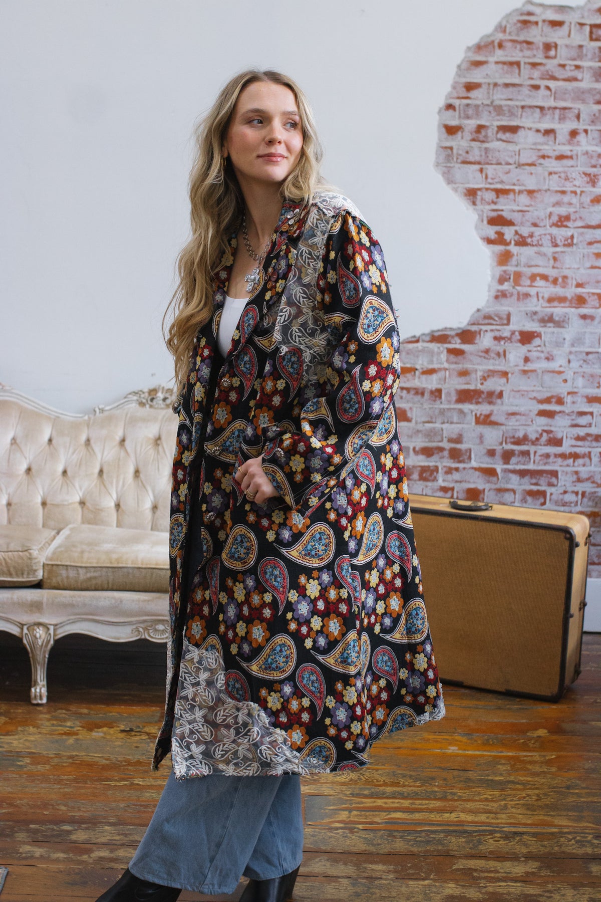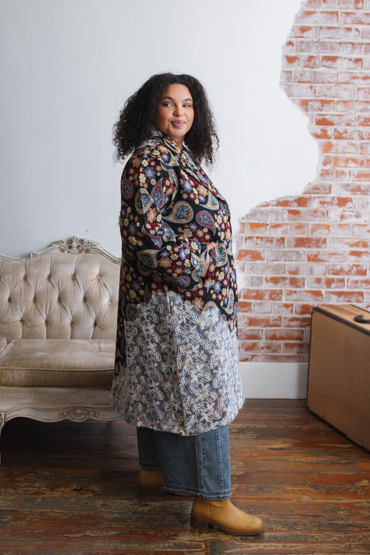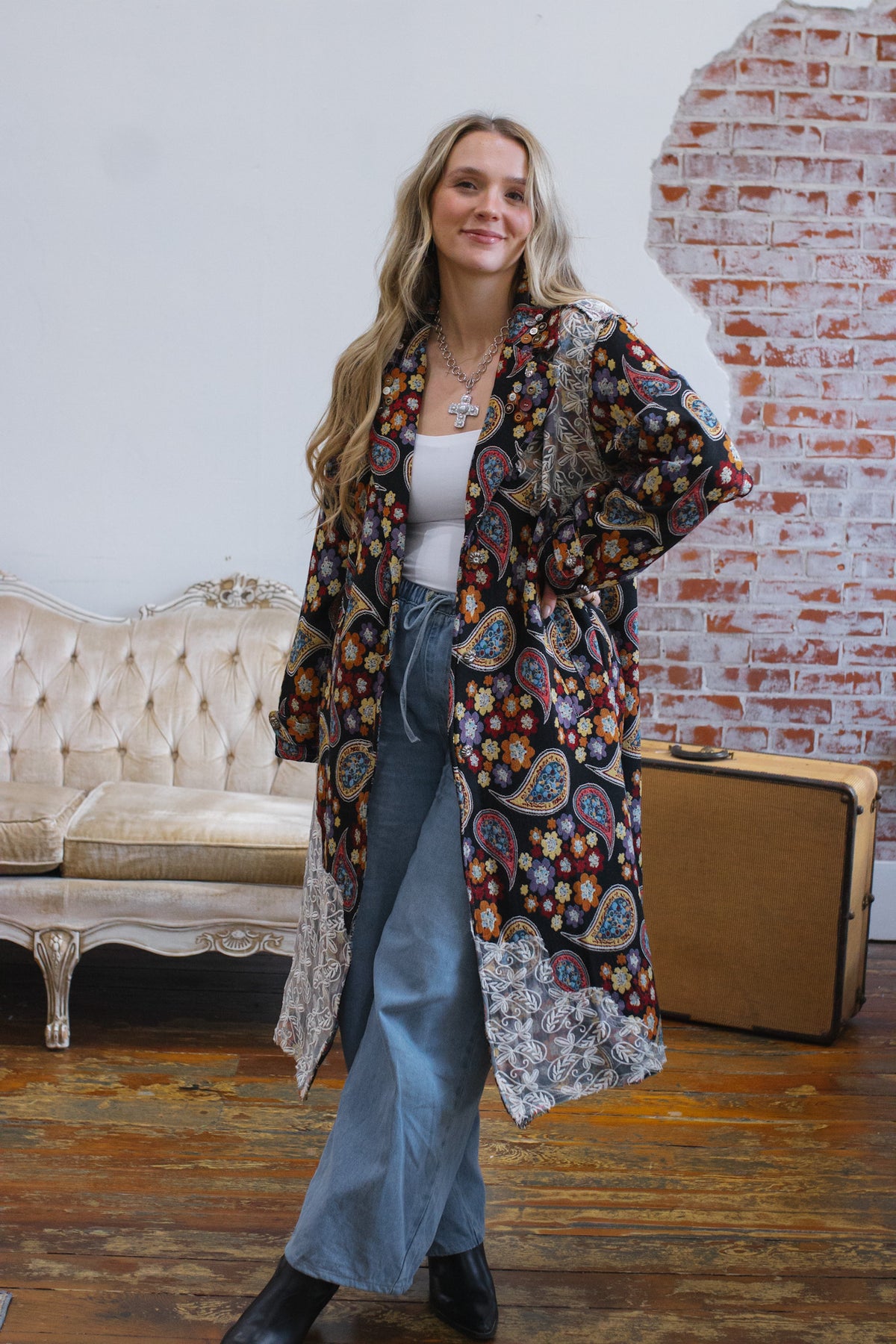 Looking for a statement layer that feels like wearable art? The Penny Floral Brocade Duster Jacket brings joyful drama to your wardrobe with its rich floral tapestry, vintage-inspired paisley motifs, and whimsical button detailing. Crafted in a structured, oversized silhouette, this duster instantly elevates denim days or adds eclectic charm to layered looks. Finished with a romantic lace overlay along the hem and shoulder, it’s equal parts cozy, creative, and unmistakably one-of-a-kind.