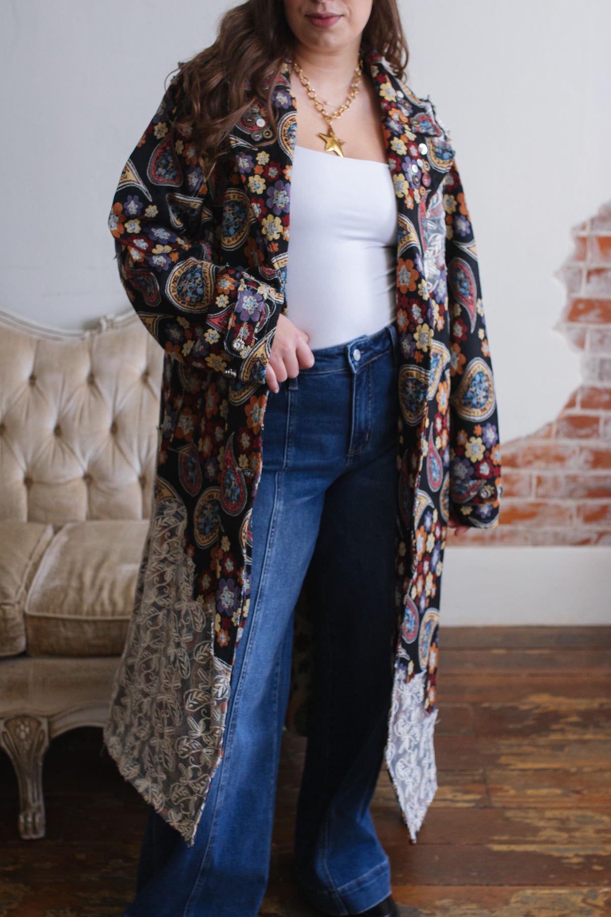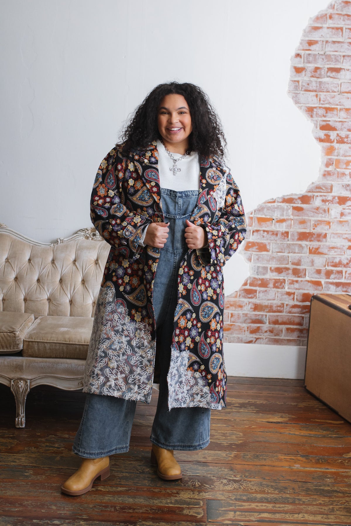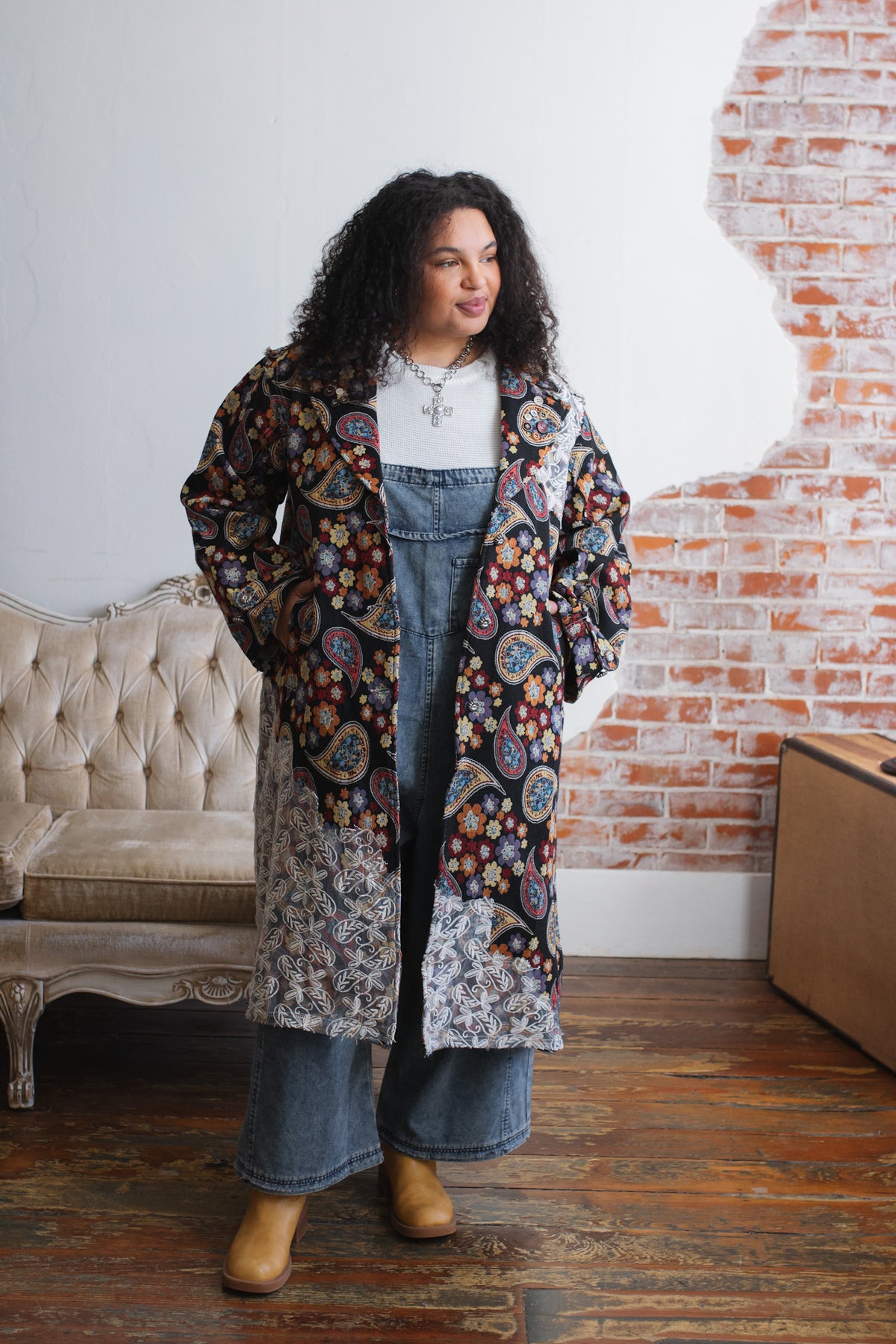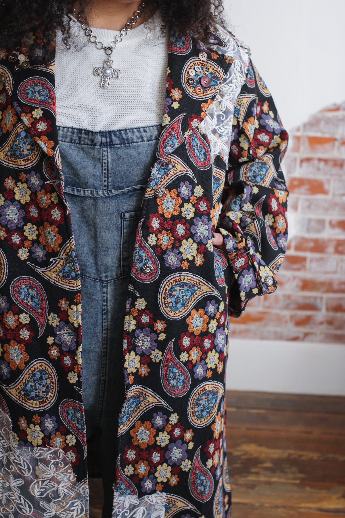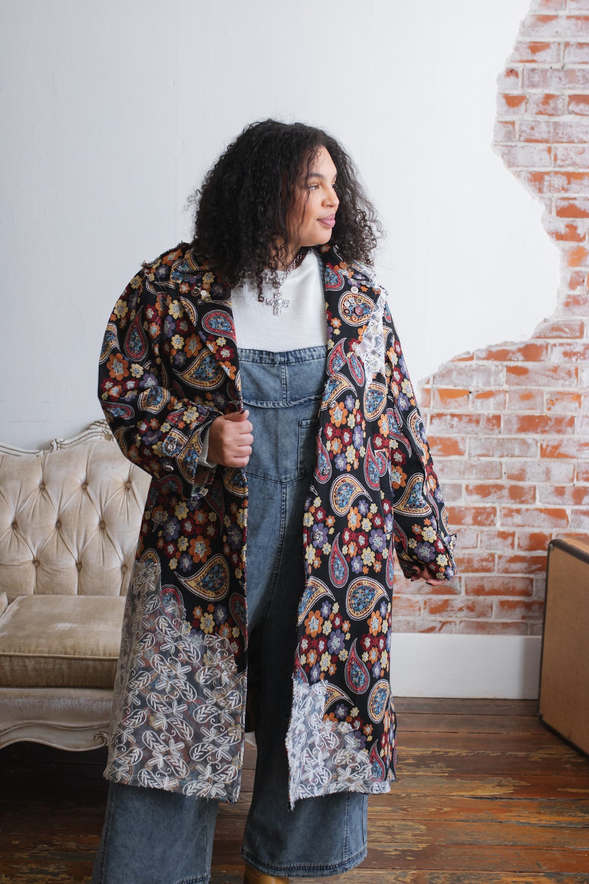 Looking for a statement layer that feels like wearable art? The Penny Floral Brocade Duster Jacket brings joyful drama to your wardrobe with its rich floral tapestry, vintage-inspired paisley motifs, and whimsical button detailing. Crafted in a structured, oversized silhouette, this duster instantly elevates denim days or adds eclectic charm to layered looks. Finished with a romantic lace overlay along the hem and shoulder, it’s equal parts cozy, creative, and unmistakably one-of-a-kind.