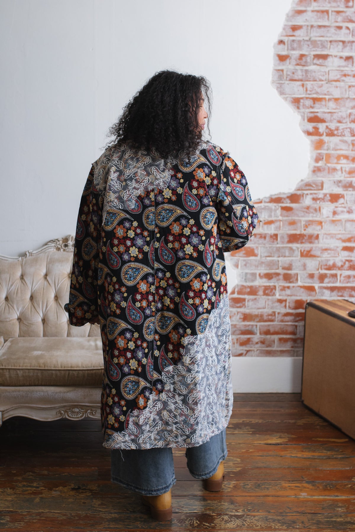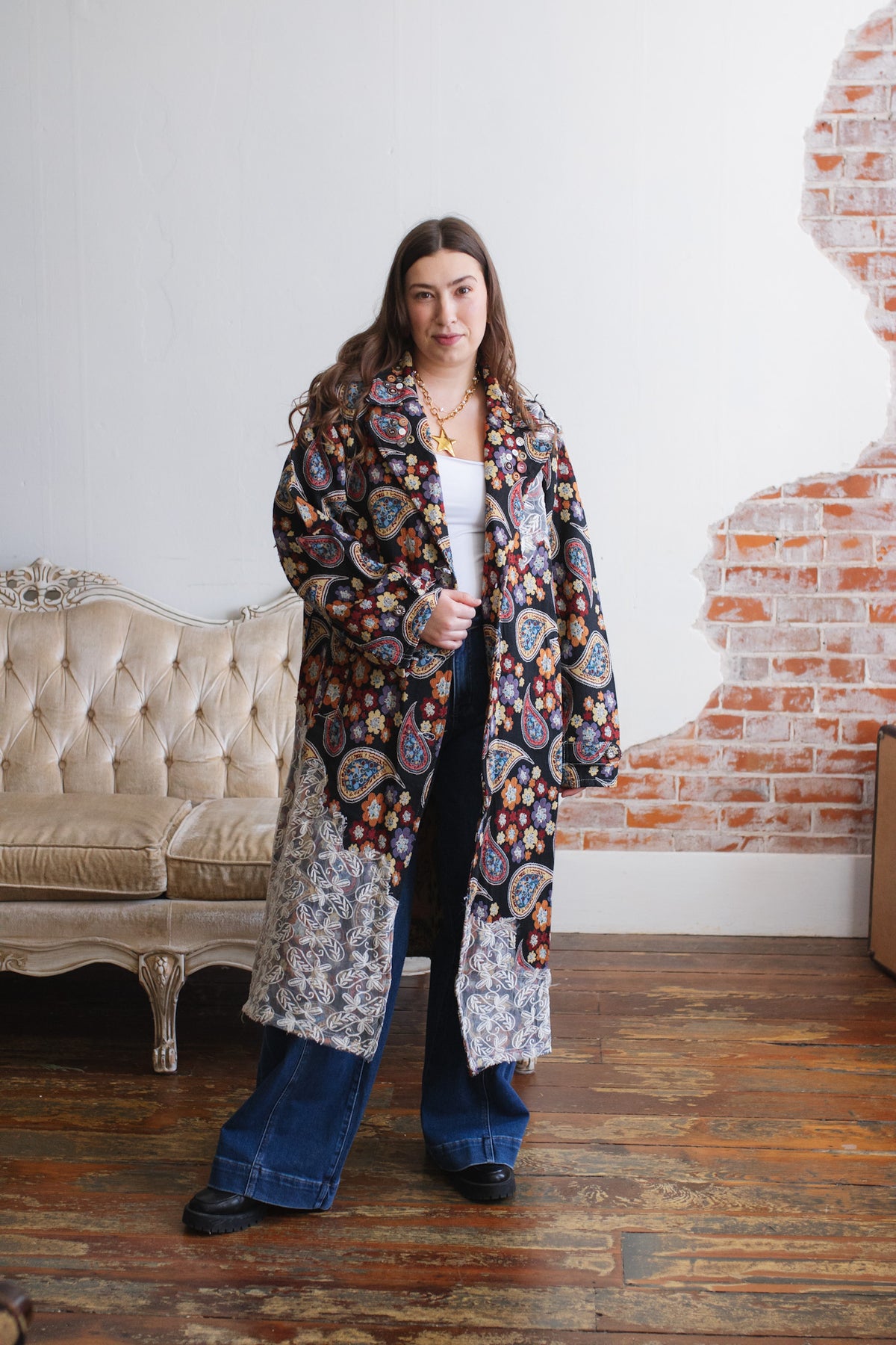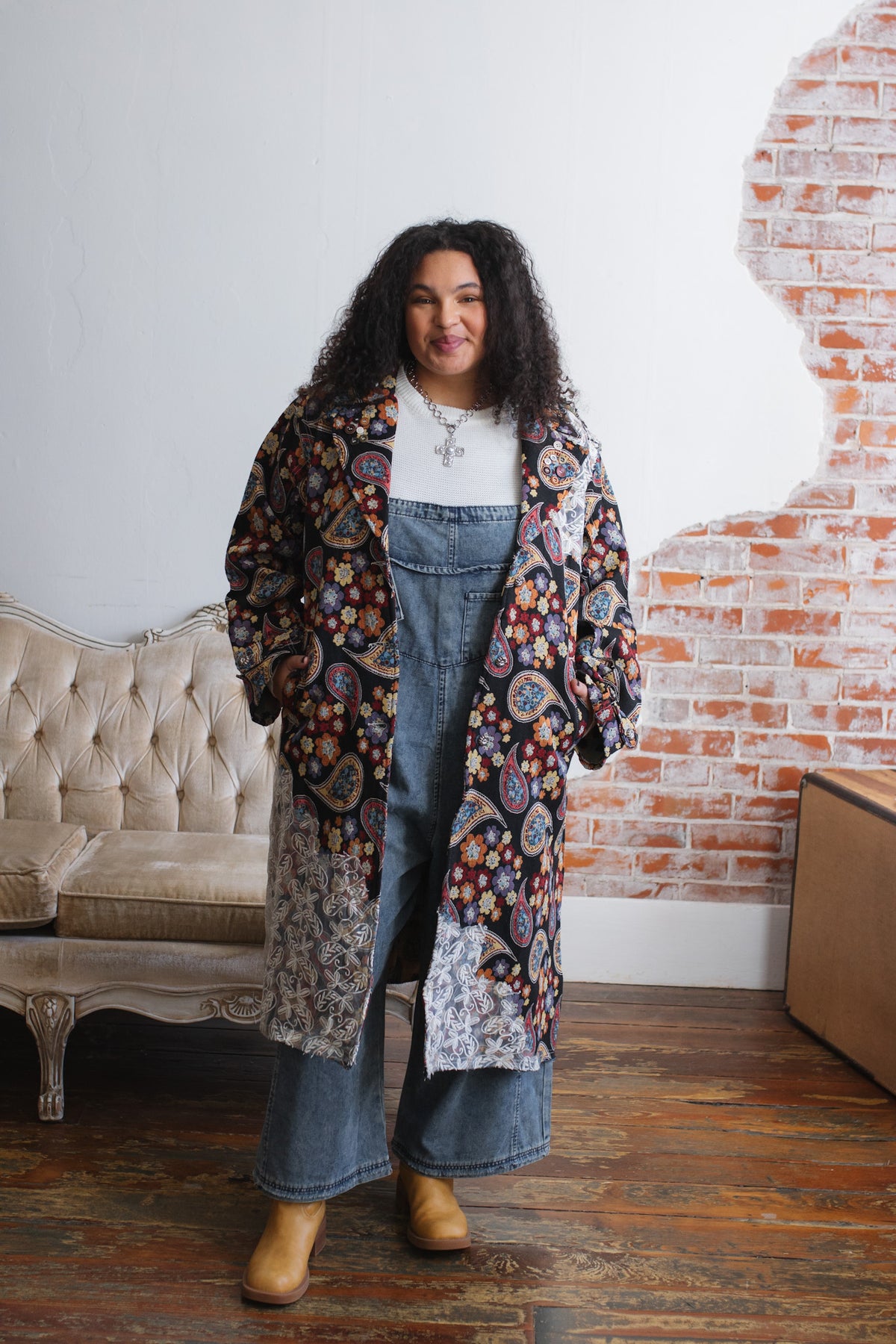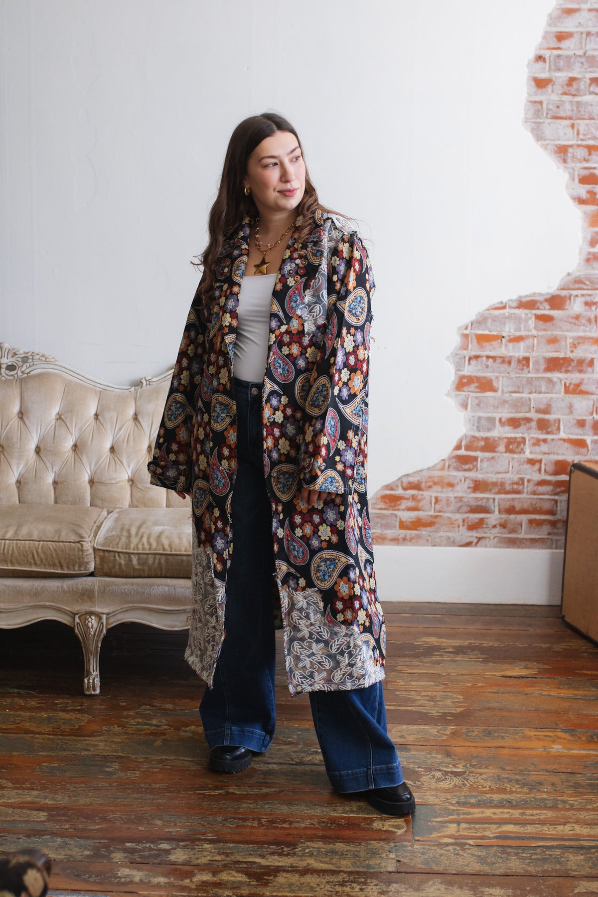 Looking for a statement layer that feels like wearable art? The Penny Floral Brocade Duster Jacket brings joyful drama to your wardrobe with its rich floral tapestry, vintage-inspired paisley motifs, and whimsical button detailing. Crafted in a structured, oversized silhouette, this duster instantly elevates denim days or adds eclectic charm to layered looks. Finished with a romantic lace overlay along the hem and shoulder, it’s equal parts cozy, creative, and unmistakably one-of-a-kind.