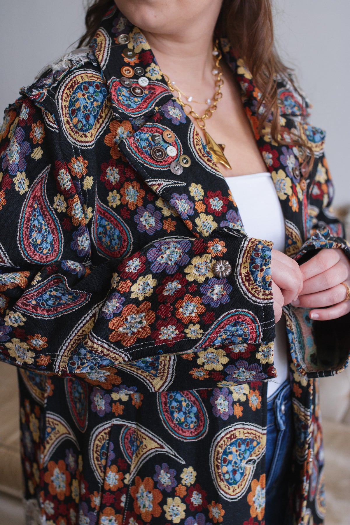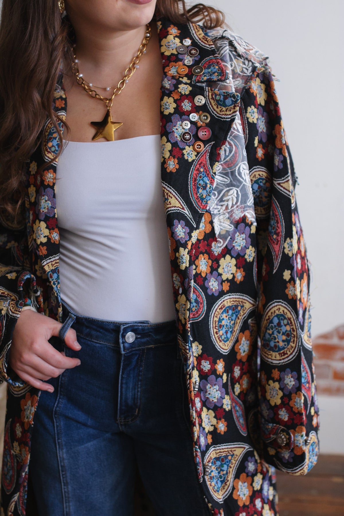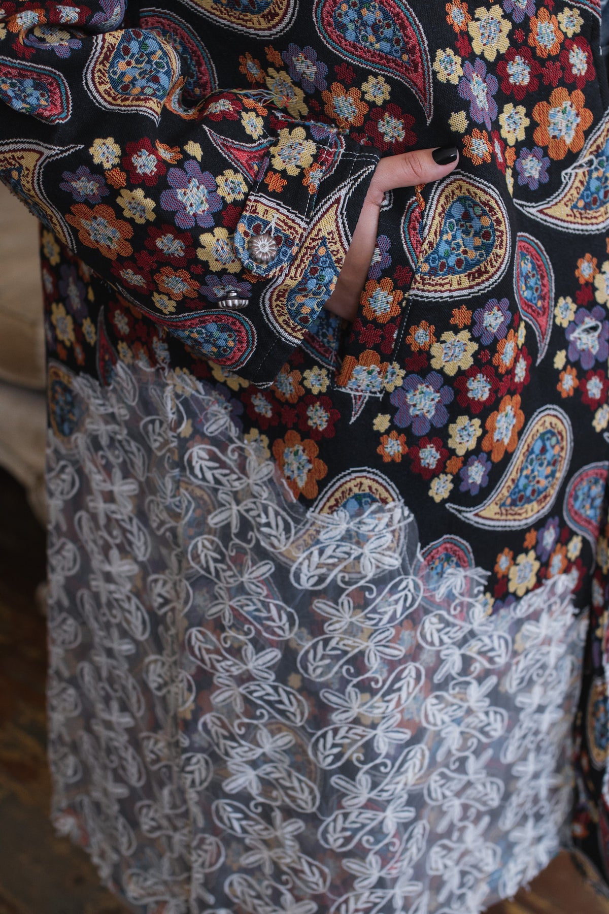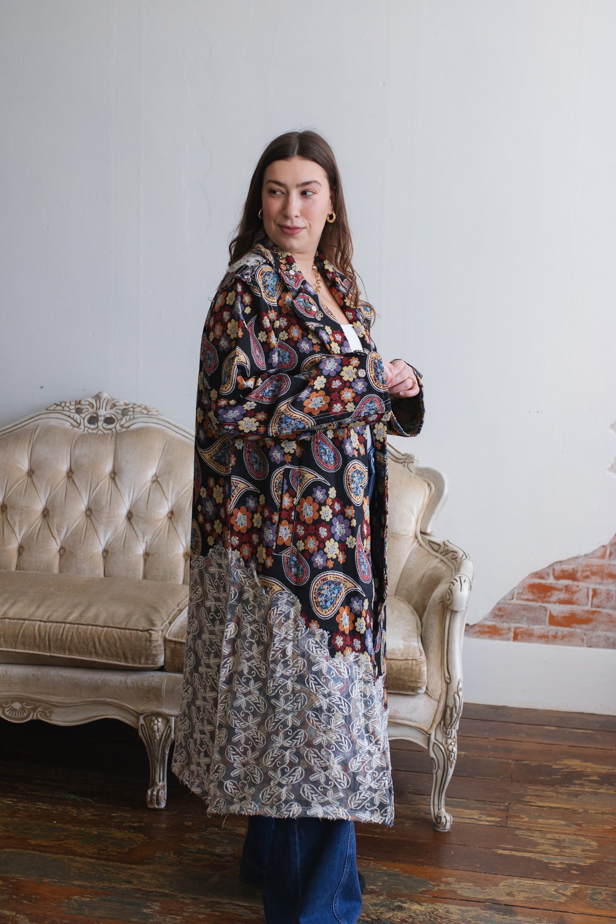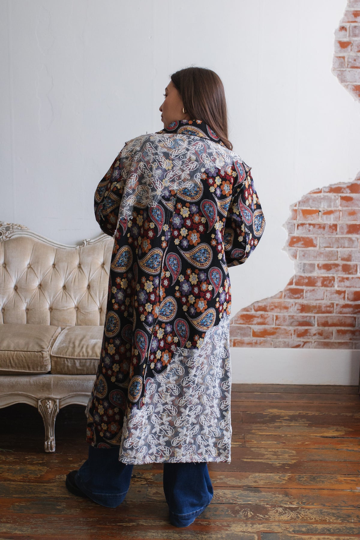 Looking for a statement layer that feels like wearable art? The Penny Floral Brocade Duster Jacket brings joyful drama to your wardrobe with its rich floral tapestry, vintage-inspired paisley motifs, and whimsical button detailing. Crafted in a structured, oversized silhouette, this duster instantly elevates denim days or adds eclectic charm to layered looks. Finished with a romantic lace overlay along the hem and shoulder, it’s equal parts cozy, creative, and unmistakably one-of-a-kind.