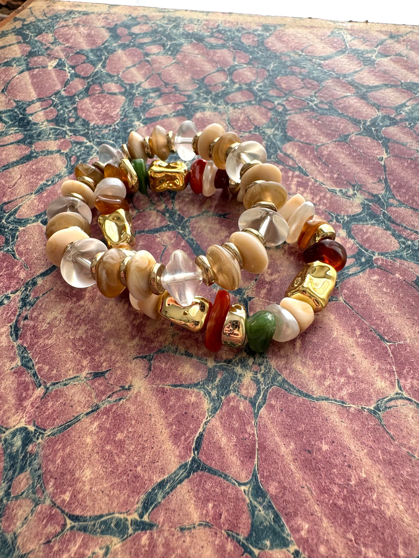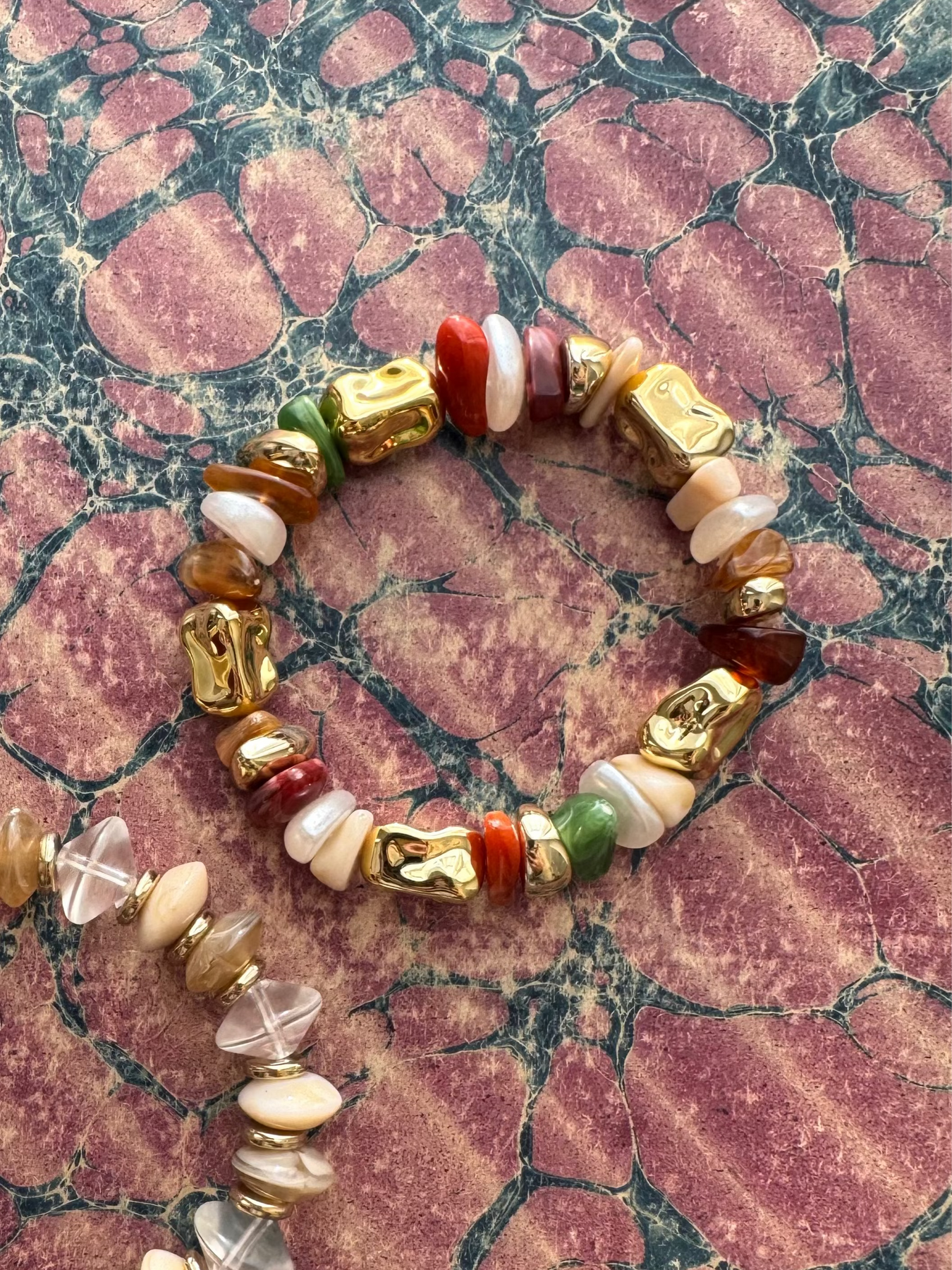 Fun sized burst of color and shine - a mix of irregular glassy beads, pearly whites, and molten gold accents!