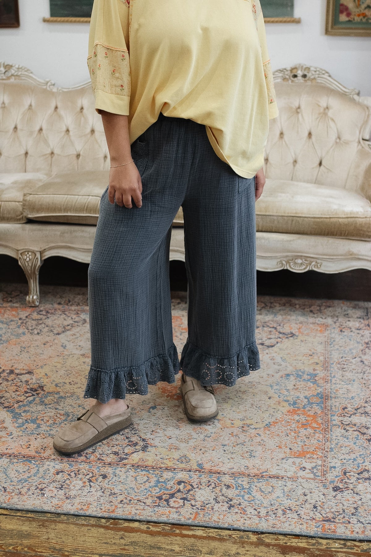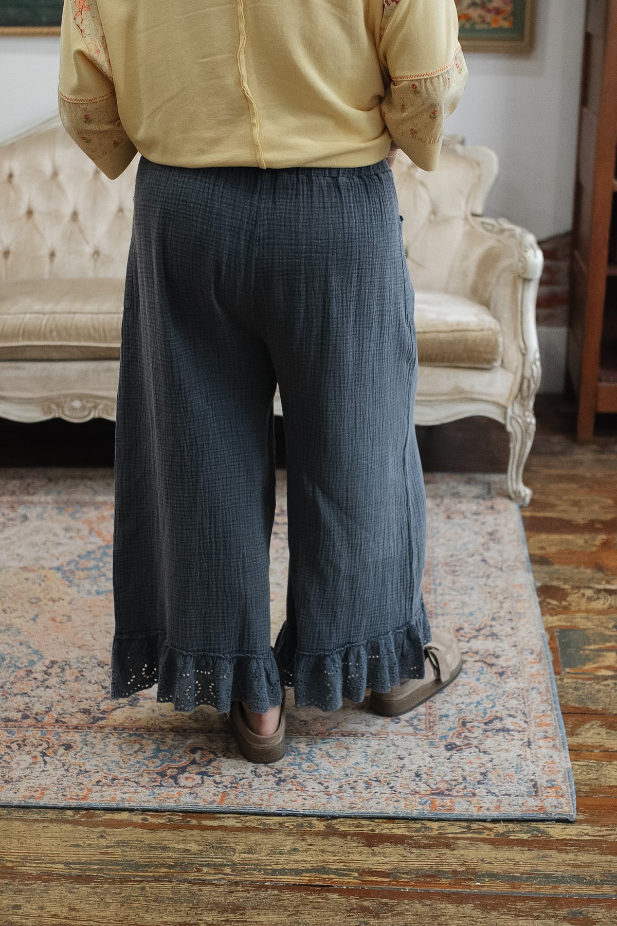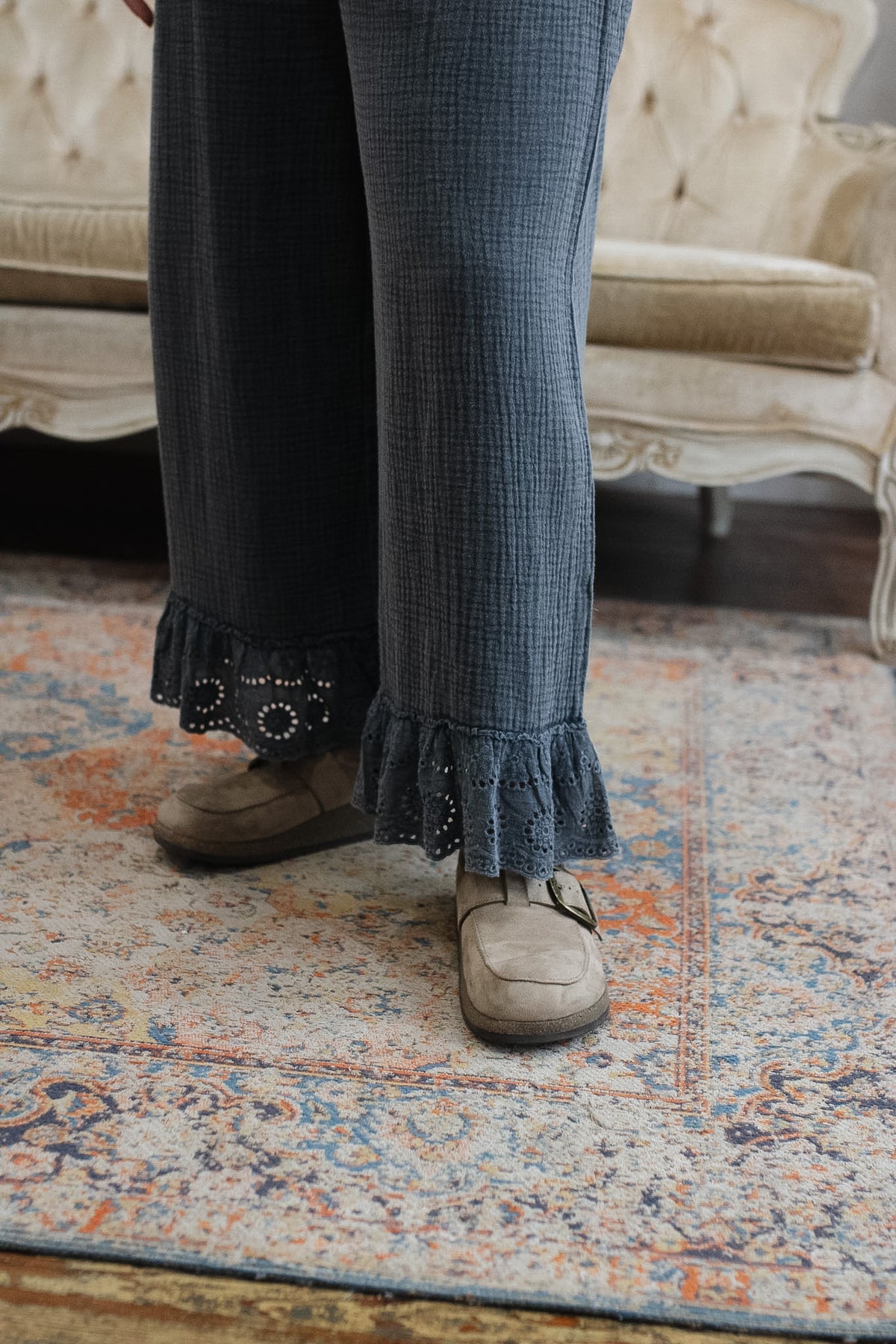 Wide leg with eyelet ruffle hem for a feminine, vintage-inspired finish