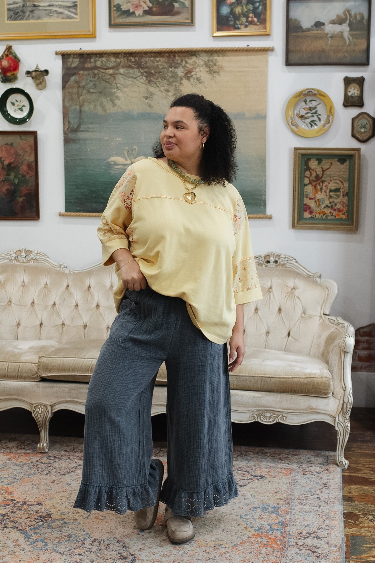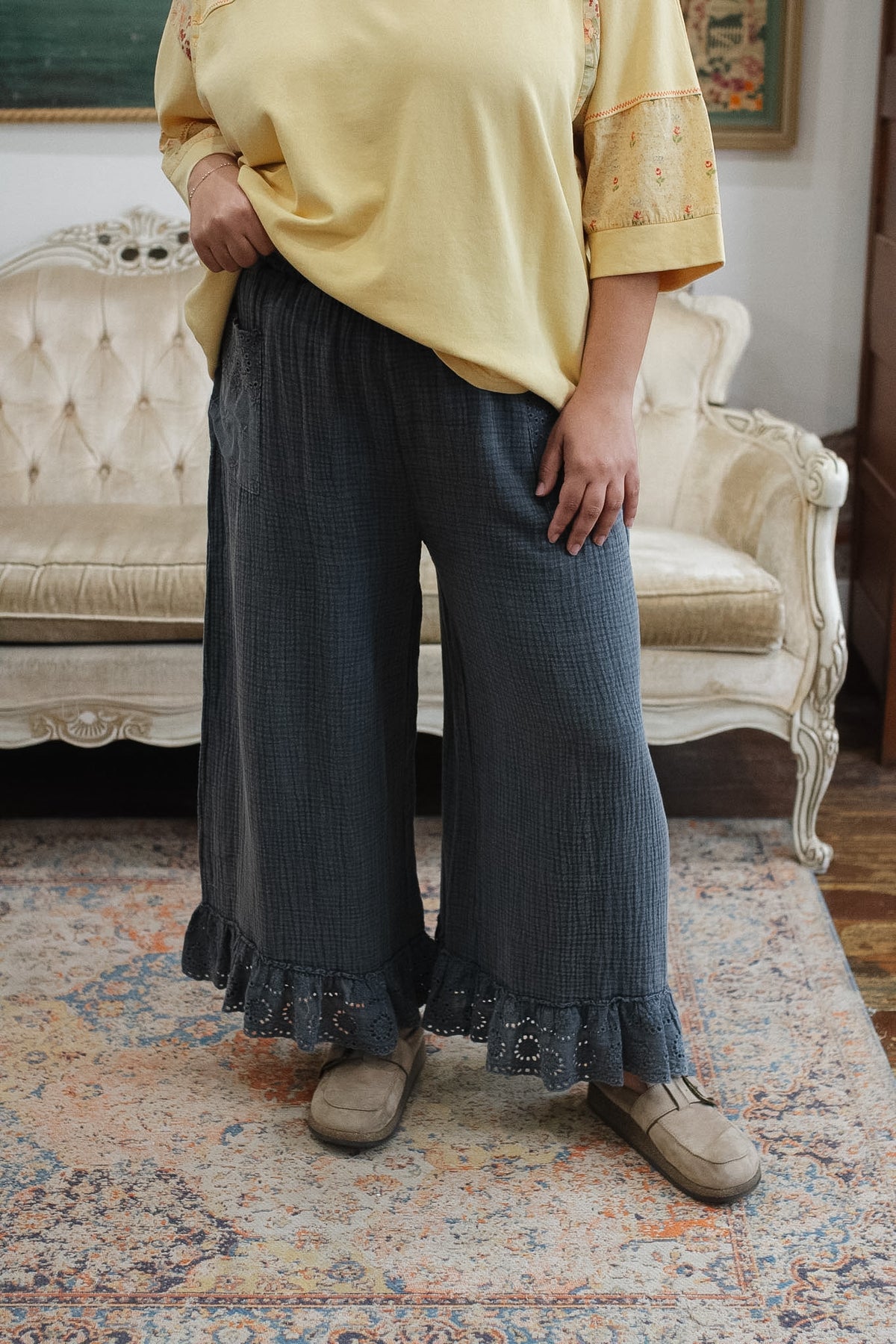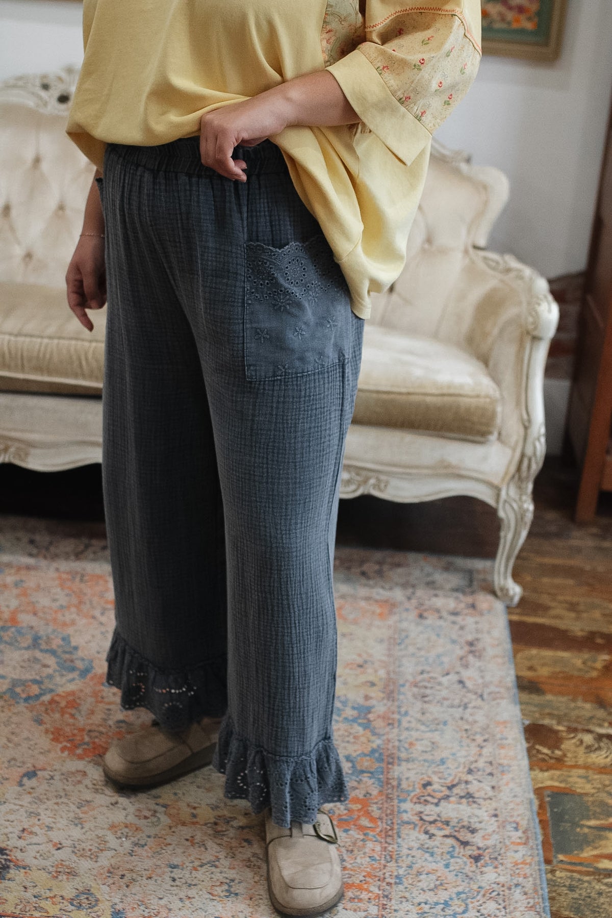 Wide leg with eyelet ruffle hem for a feminine, vintage-inspired finish