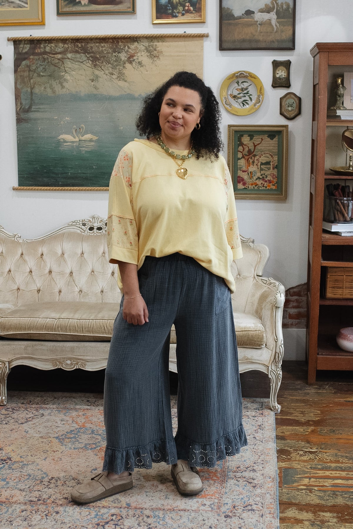 Looking for lightweight cotton pants that feel breezy but still look beautifully styled? The Thea Gauze Ruffle Pants offer that perfect mix of comfort and charm, with soft gauze fabric, a relaxed wide leg, and delicate eyelet ruffles that add a subtle romantic finish. Easy to slip on and endlessly versatile, they are the kind of pants that make everyday dressing feel effortless.