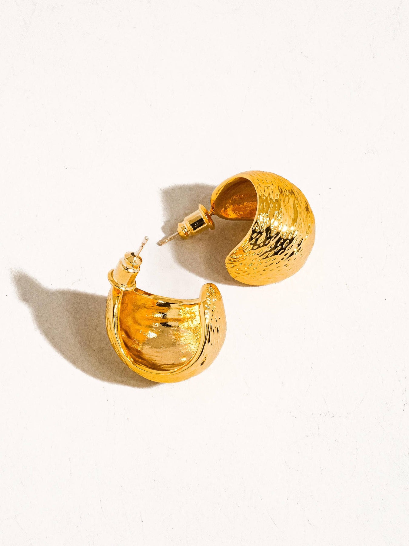 Shiny, bold, and chic. These textured gold huggie earrings add instant style to any look. Lightweight and comfy, they’re perfect for everyday wear.